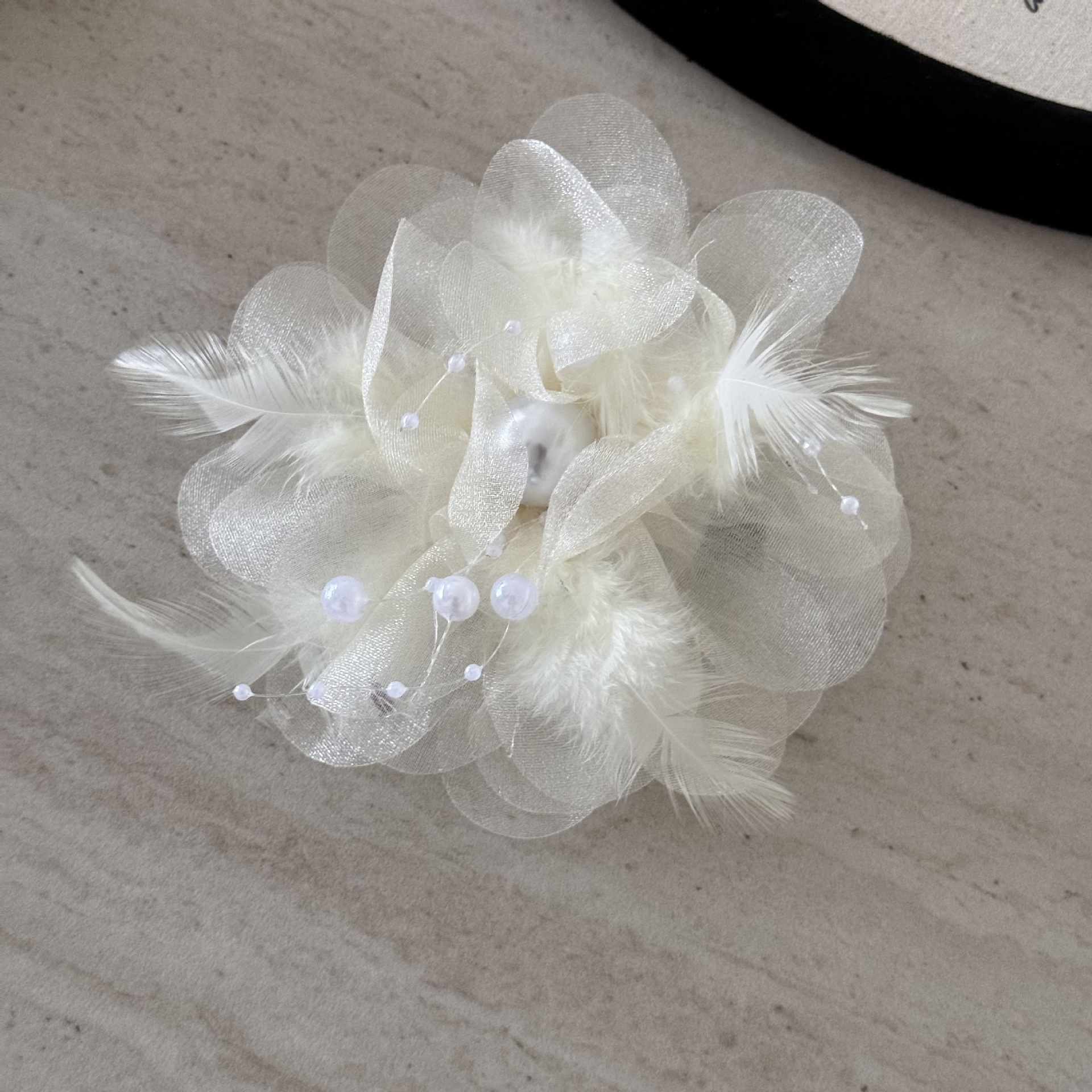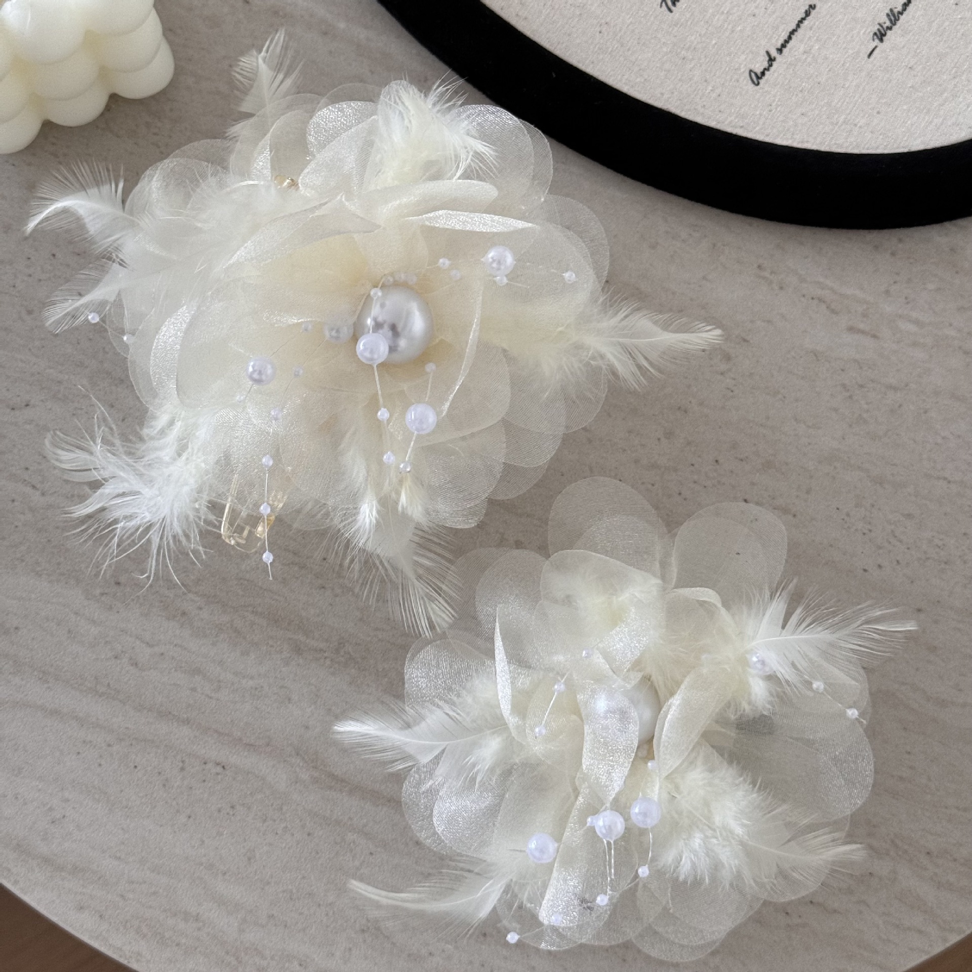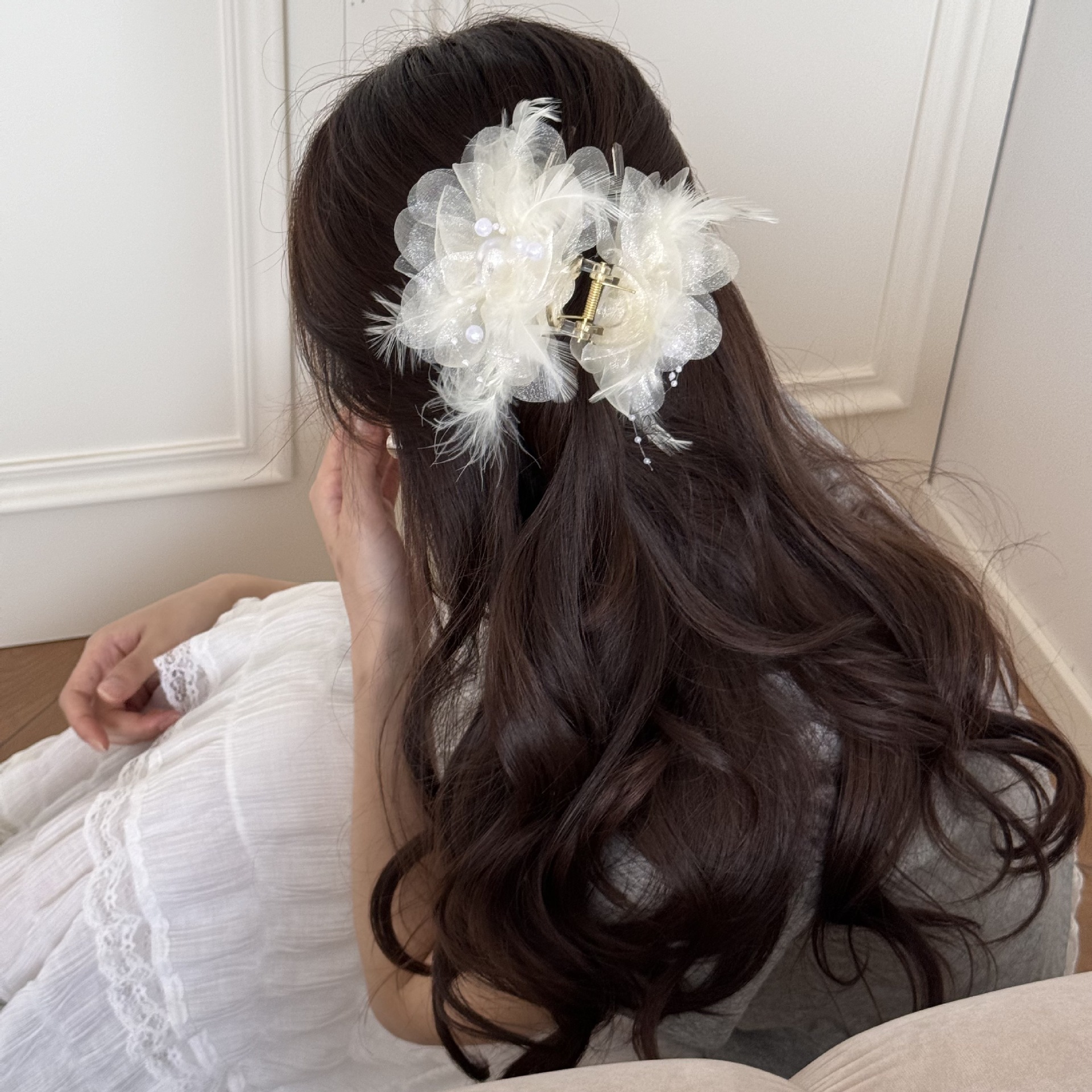 여성을위한 흰색 진주 깃털 꽃 머리핀 2025 새로운 고급 머리핀 뒷머리 기질 상어 클립 머리 장식