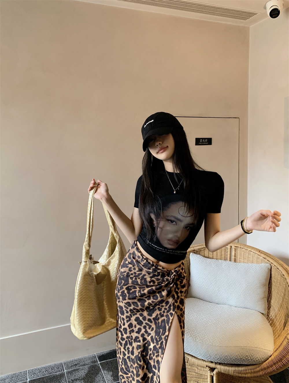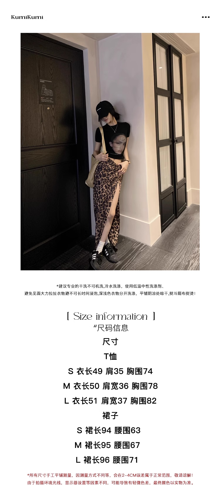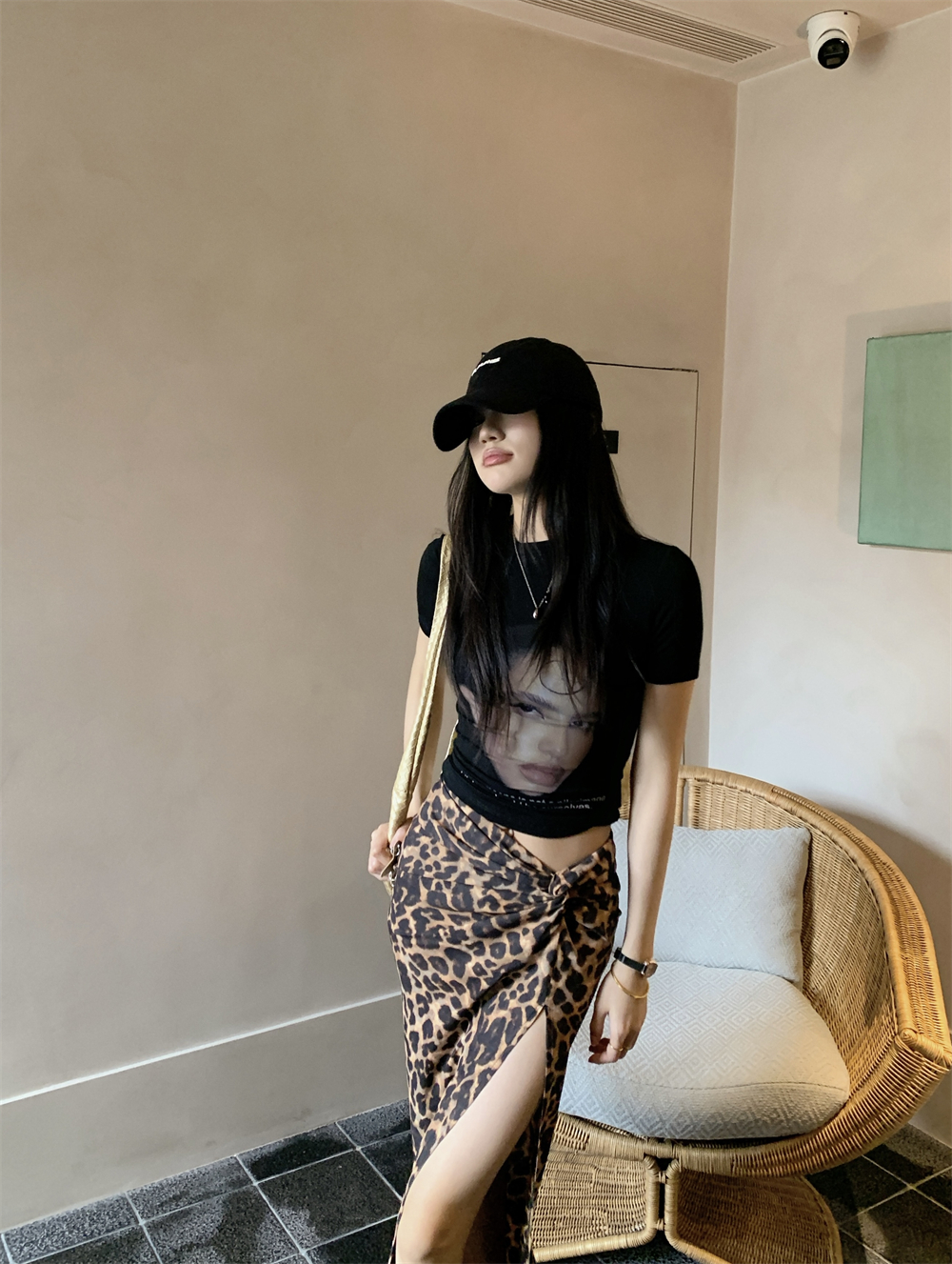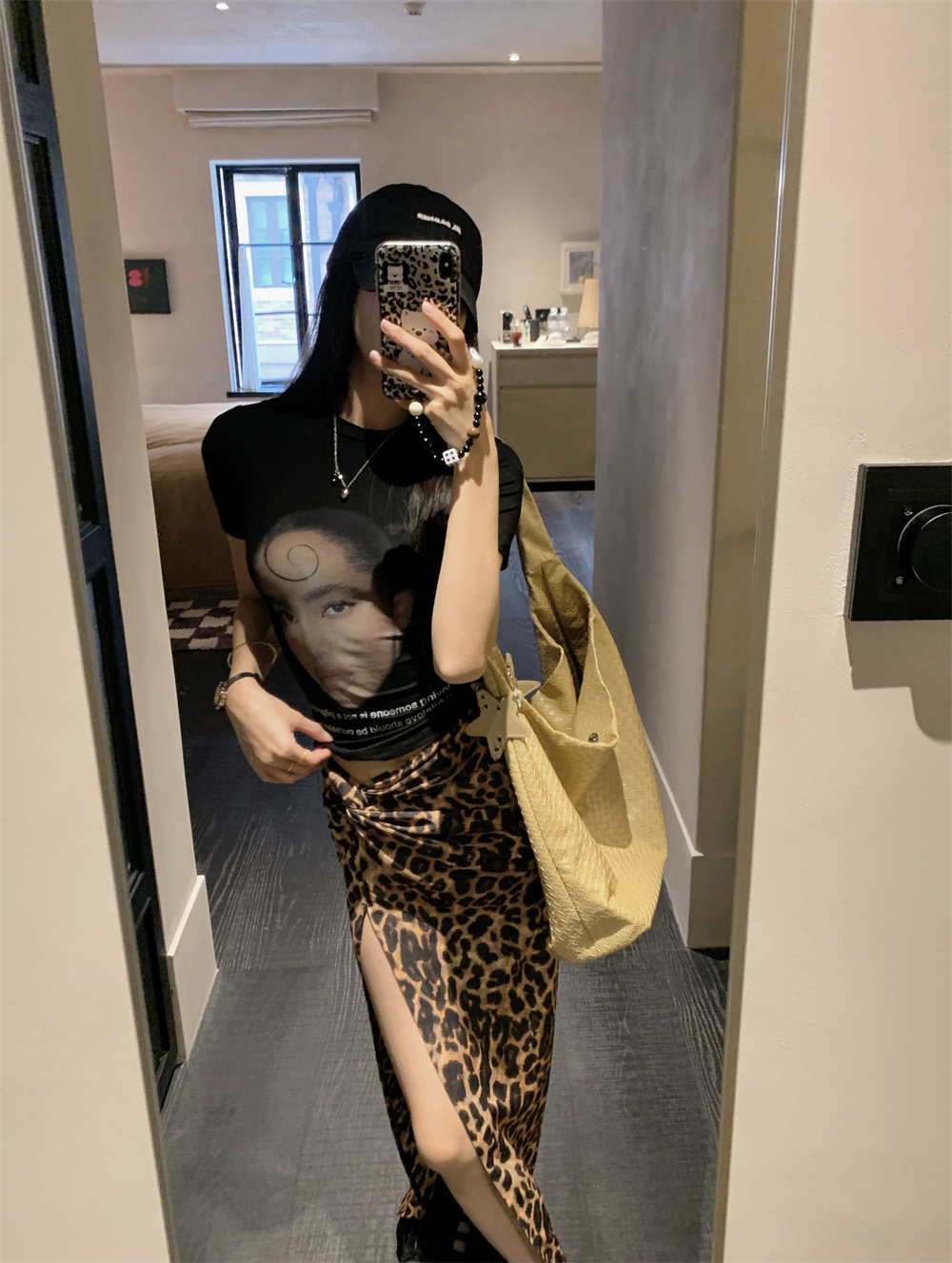 아메리칸 핫 걸 세트 프린트 반소매 티셔츠 탑 여성 여름 불규칙한 레오파드 프린트 스커트 투피스 세트