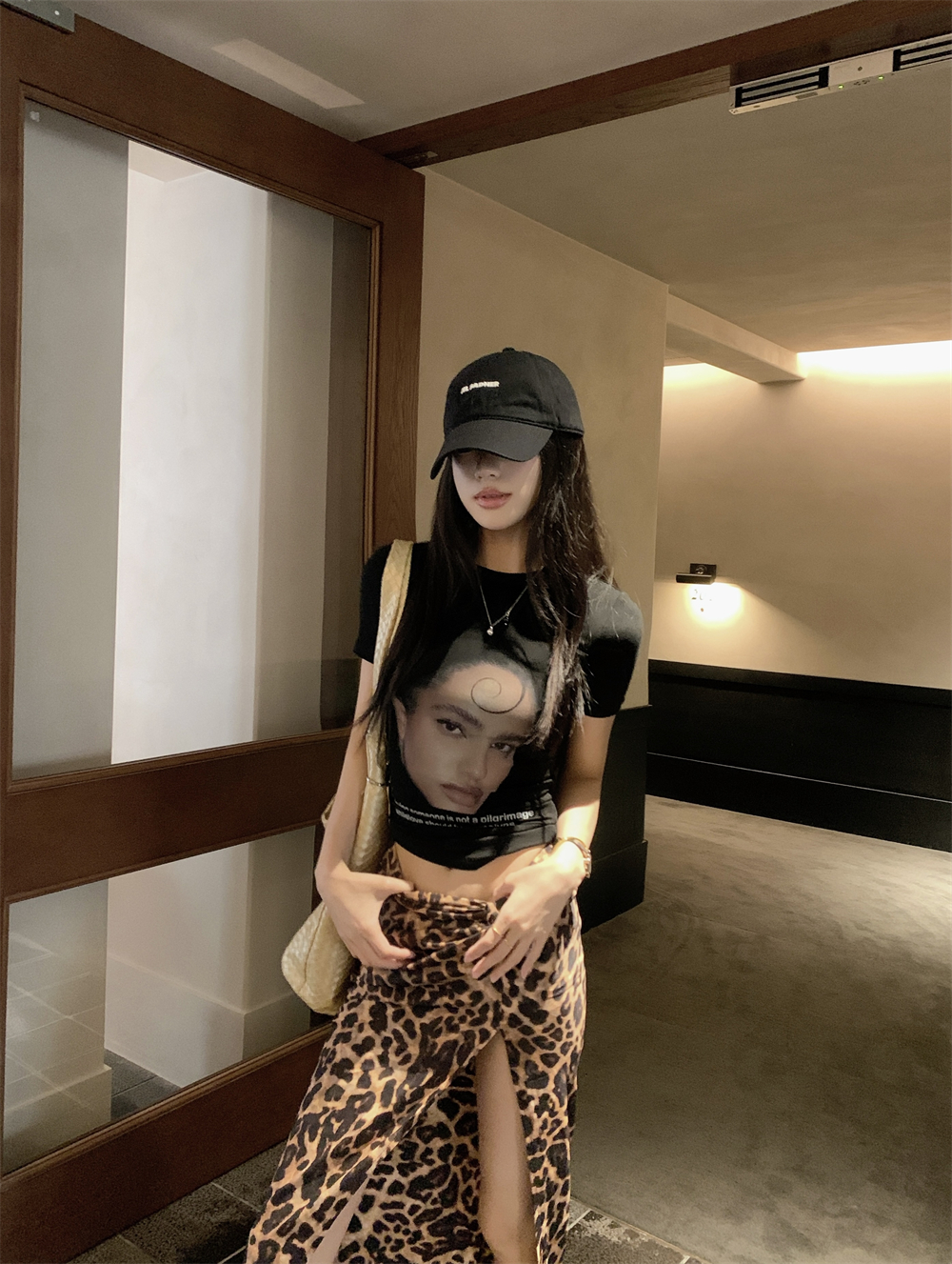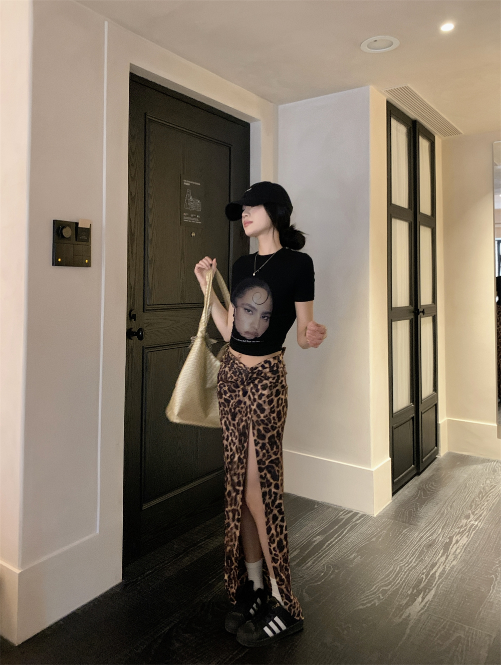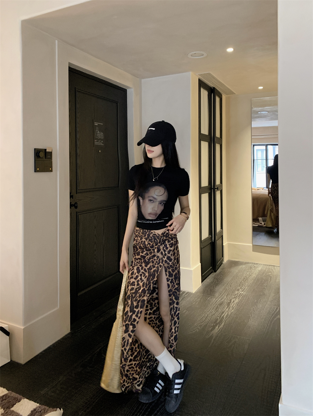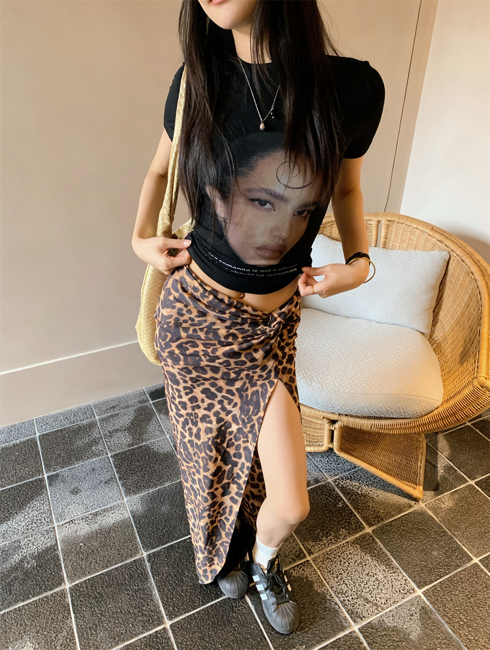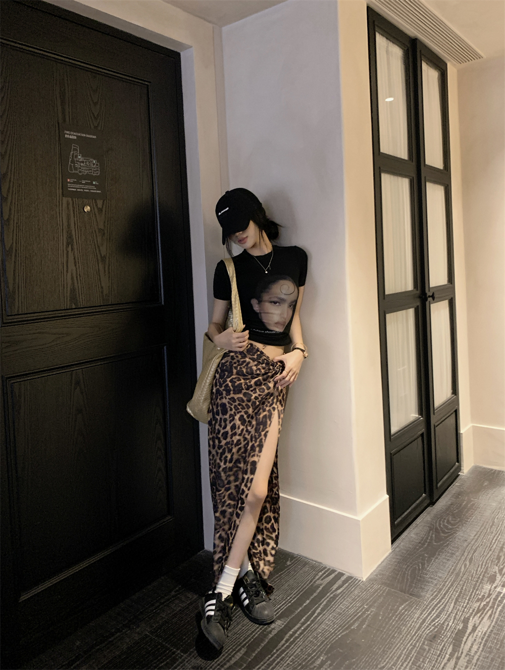 아메리칸 핫 걸 세트 프린트 반소매 티셔츠 탑 여성 여름 불규칙한 레오파드 프린트 스커트 투피스 세트
