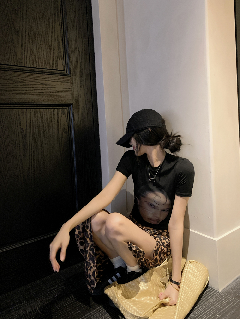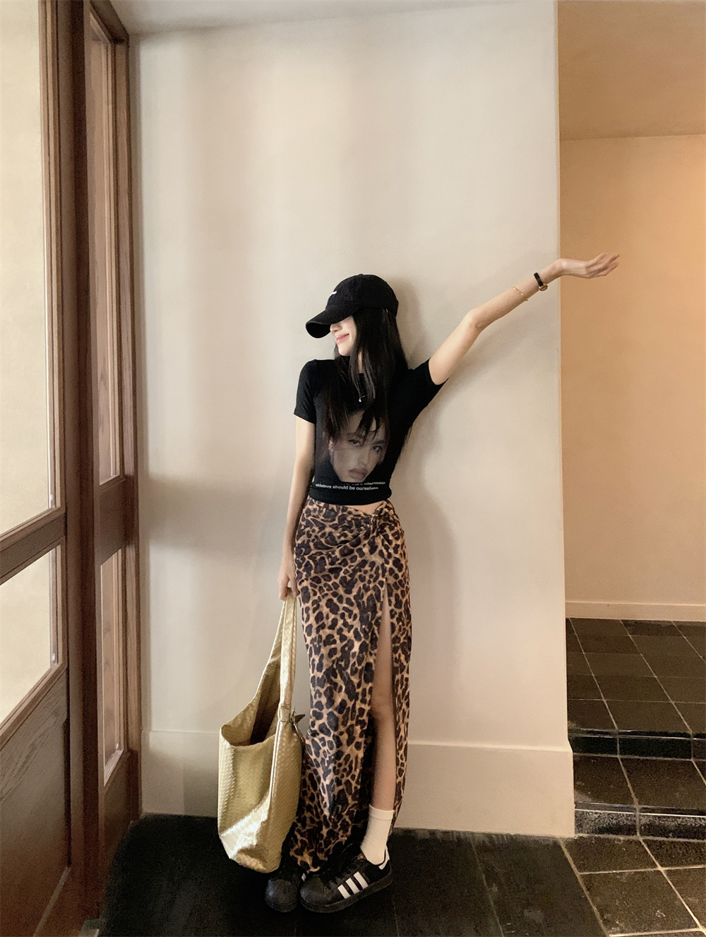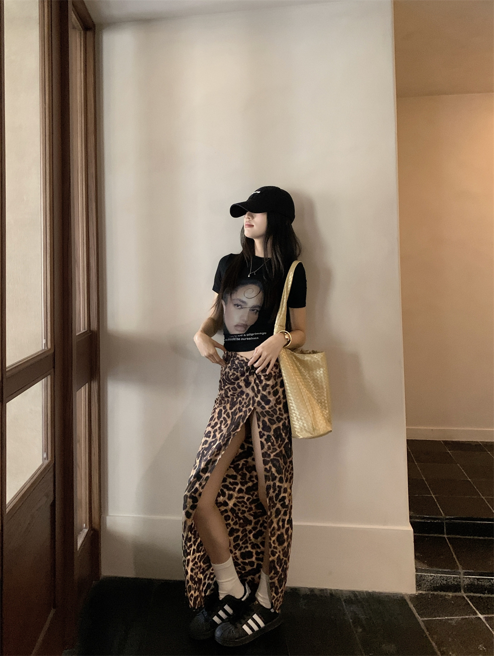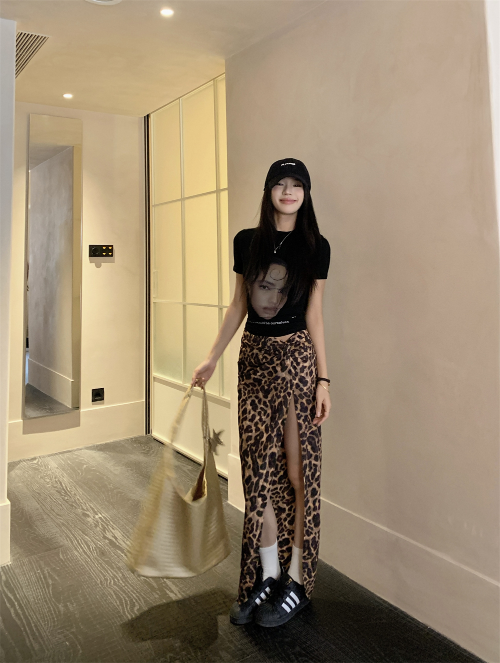 아메리칸 핫 걸 세트 프린트 반소매 티셔츠 탑 여성 여름 불규칙한 레오파드 프린트 스커트 투피스 세트