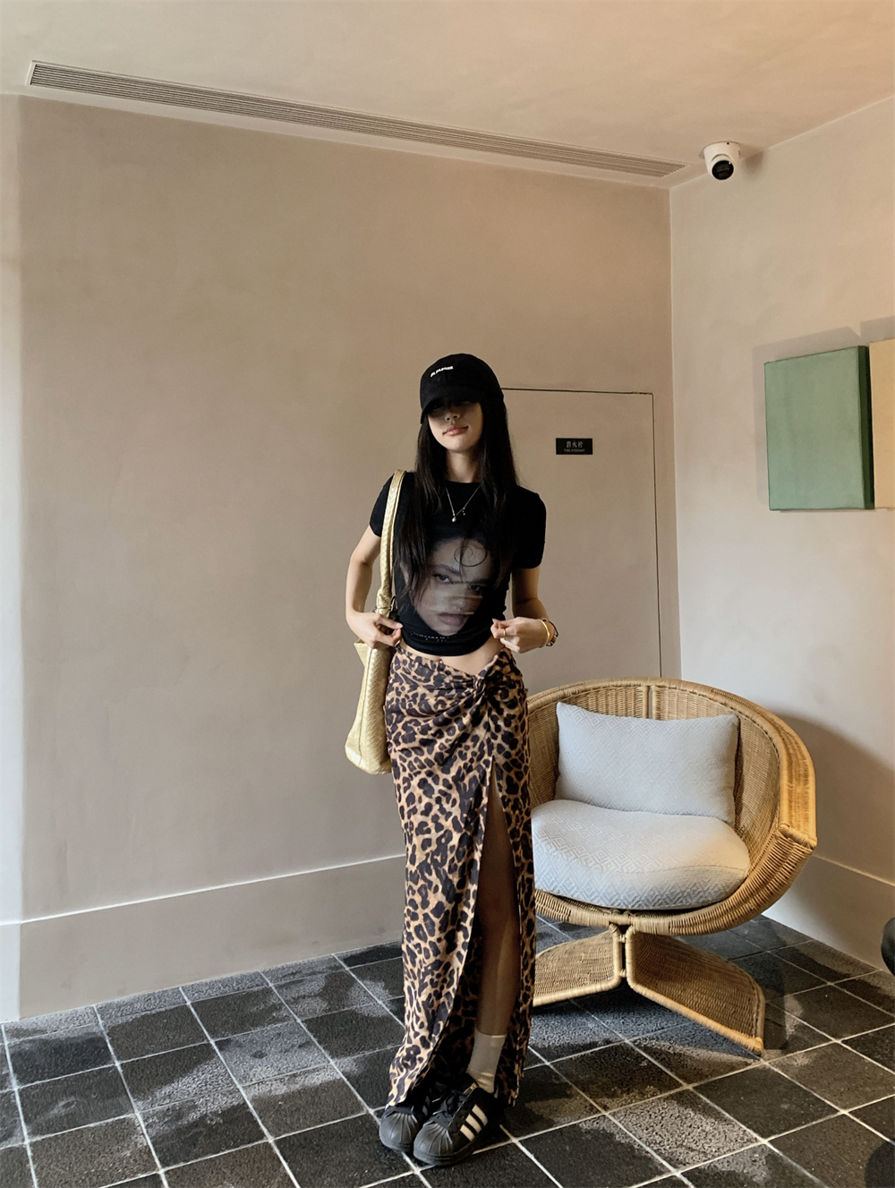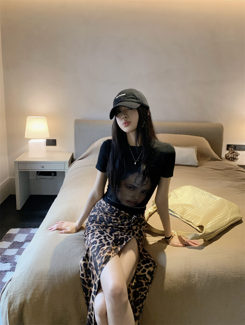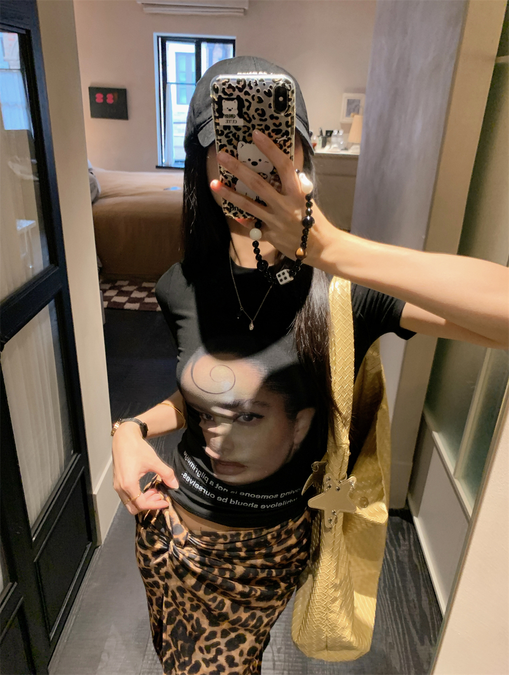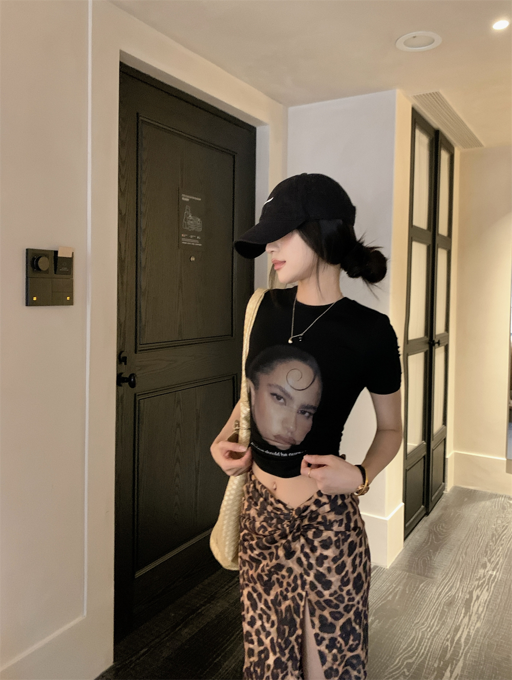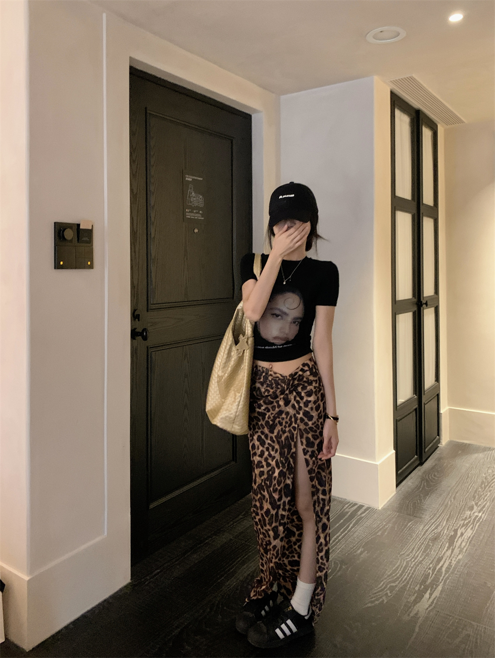 아메리칸 핫 걸 세트 프린트 반소매 티셔츠 탑 여성 여름 불규칙한 레오파드 프린트 스커트 투피스 세트