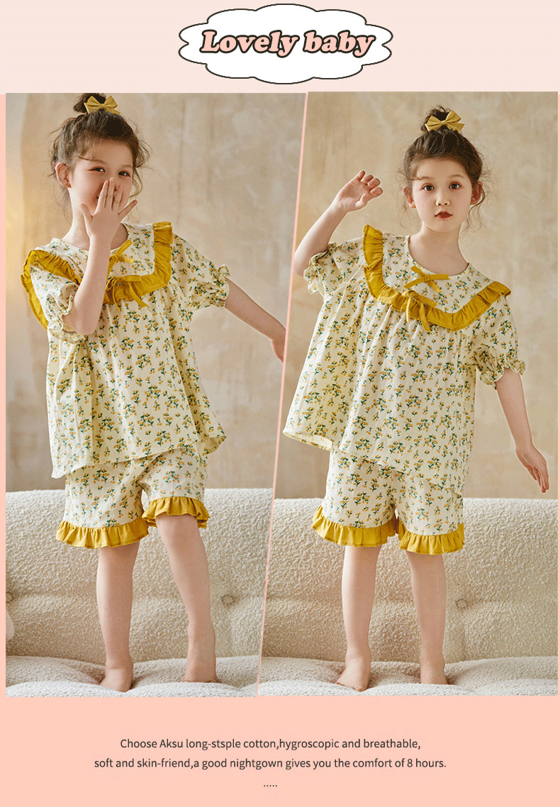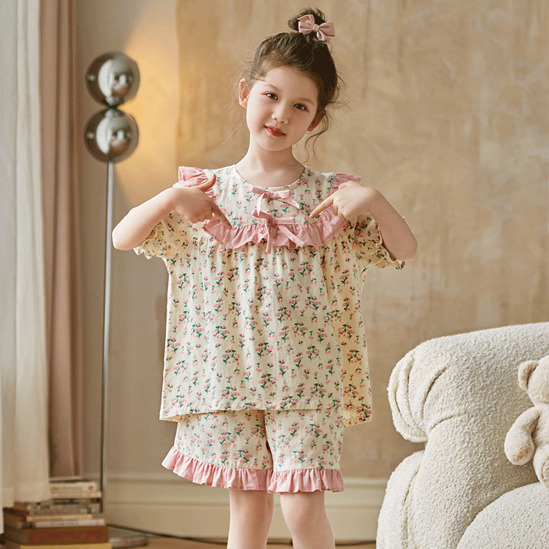 어린이와 소녀를 위한 잠옷, 여름 정장, 반팔 반바지, 중대형 어린이 꽃무늬 어린 소녀 여름 가정복 투피스 세트