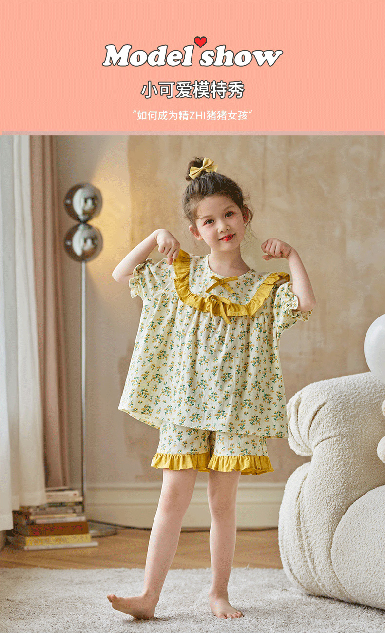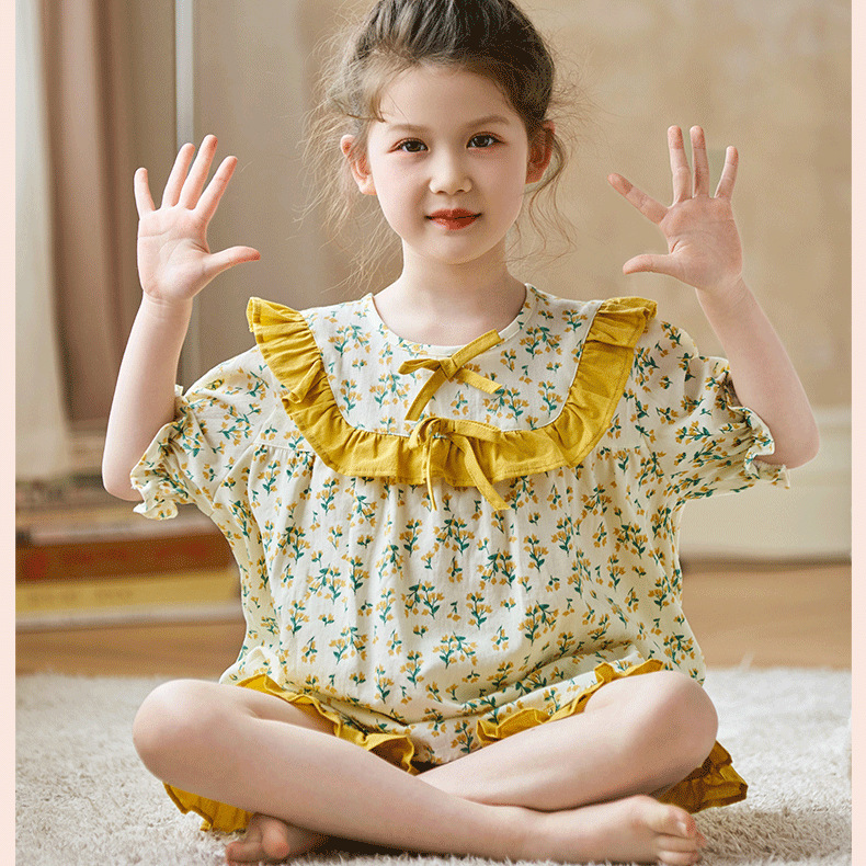 어린이와 소녀를 위한 잠옷, 여름 정장, 반팔 반바지, 중대형 어린이 꽃무늬 어린 소녀 여름 가정복 투피스 세트스토어 가기