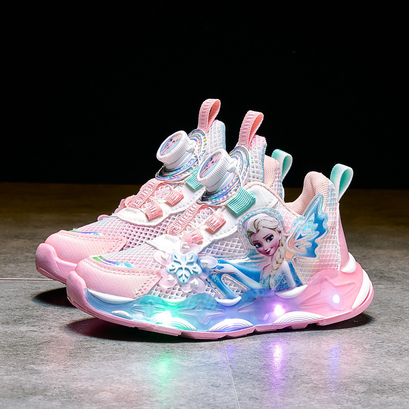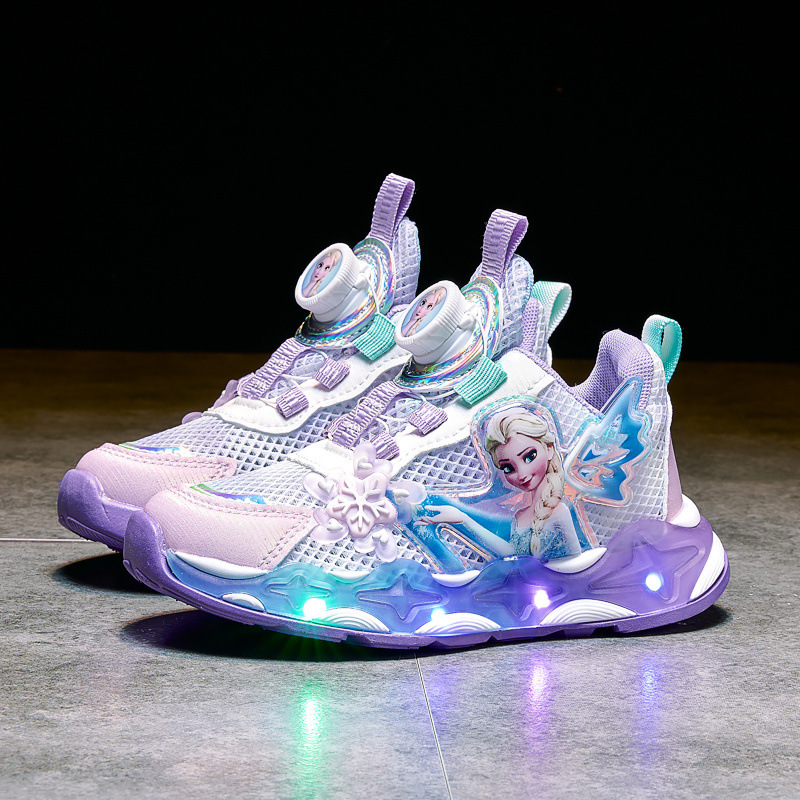 빛이있는 소녀 신발 2025 봄과 여름 더블 메쉬 통기성 엘사 공주 신발 가죽 어린이 스포츠 신발 빛나는 달리기