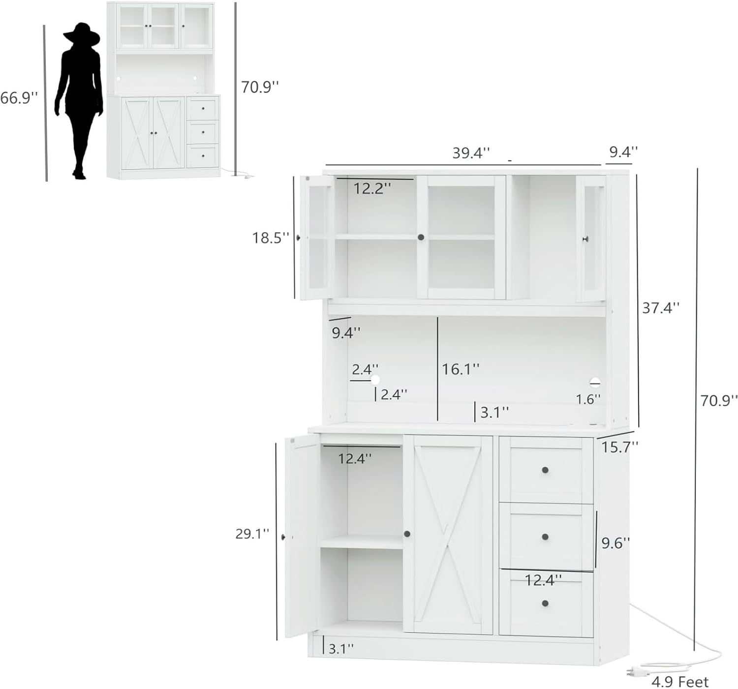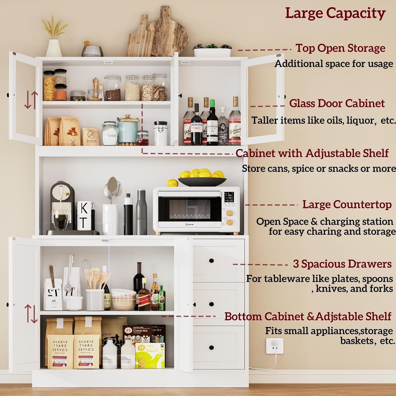 전자레인지 홀더와 충전 스테이션이 있는 주방 식품 캐비닛 서랍이 있는 바 캐비닛 유리 도어 화이트