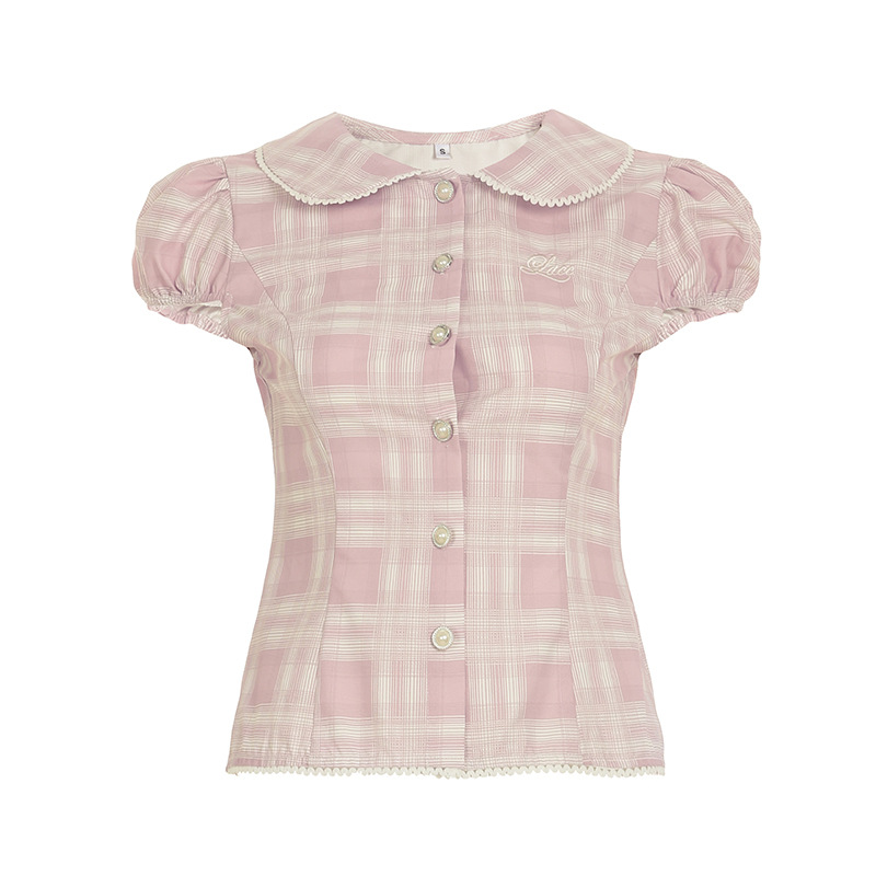 달콤한 퍼프 슬리브 격자 무늬 프린트 셔츠 새로운 스타일의 소녀 귀여운 스타일 슬림 피트 여성용 반팔 탑스토어 가기
