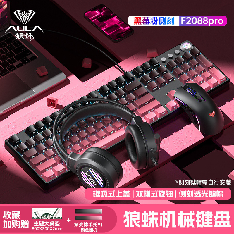 • 녹색 축-[블랙베리 핑크] 측면 각인 그라데이션 키보드 및 마우스 세트-무료 대형 마우스 패드 + 손 받침대-공식 표준