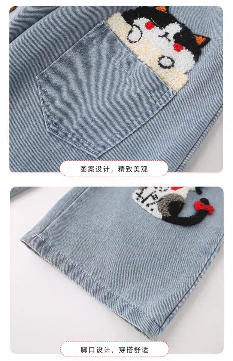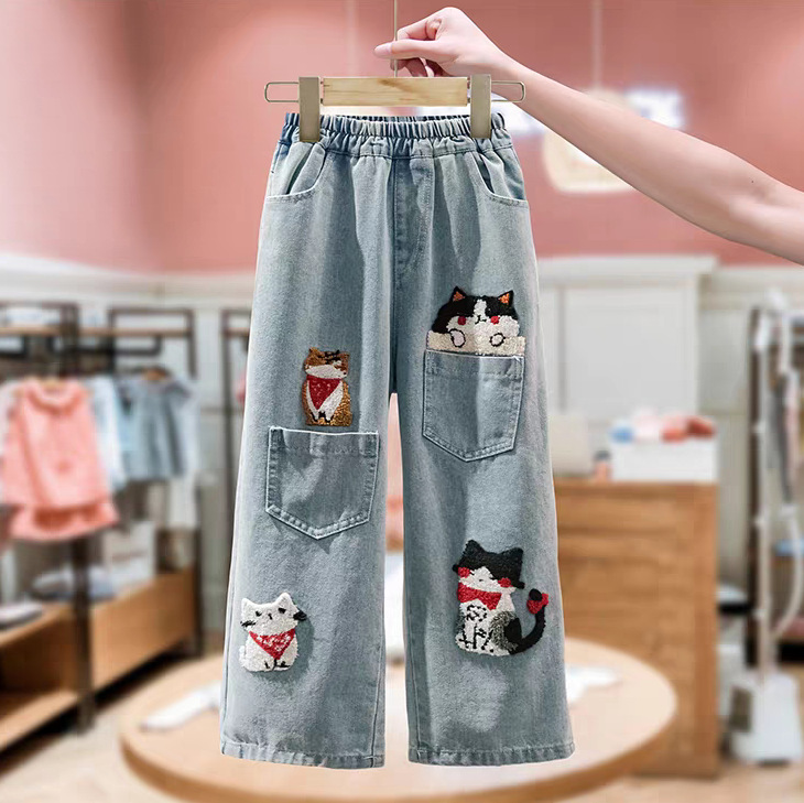 여아 청바지 봄과 가을 새로운 스타일 중대형 어린이 만화 고양이 자수 청바지 어린이 스트레이트 루즈 와이드 레그 팬츠