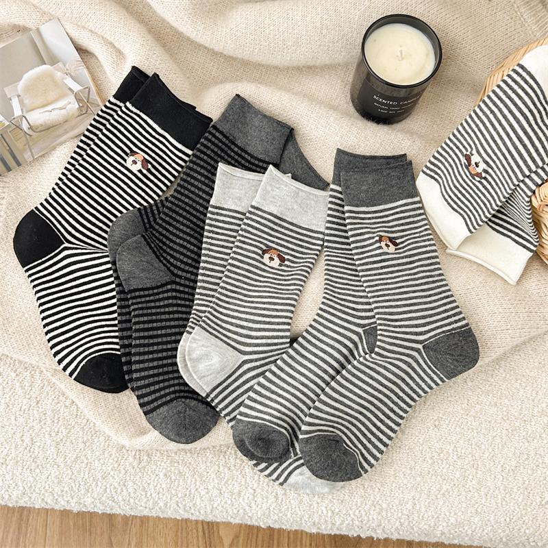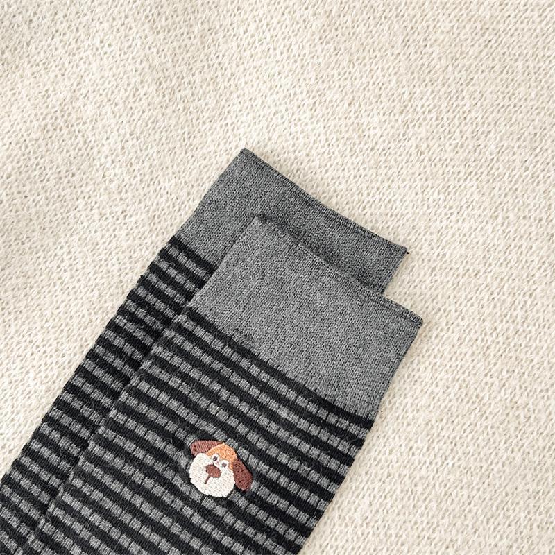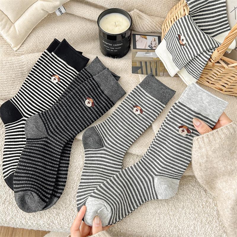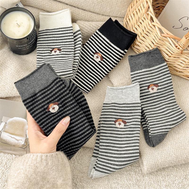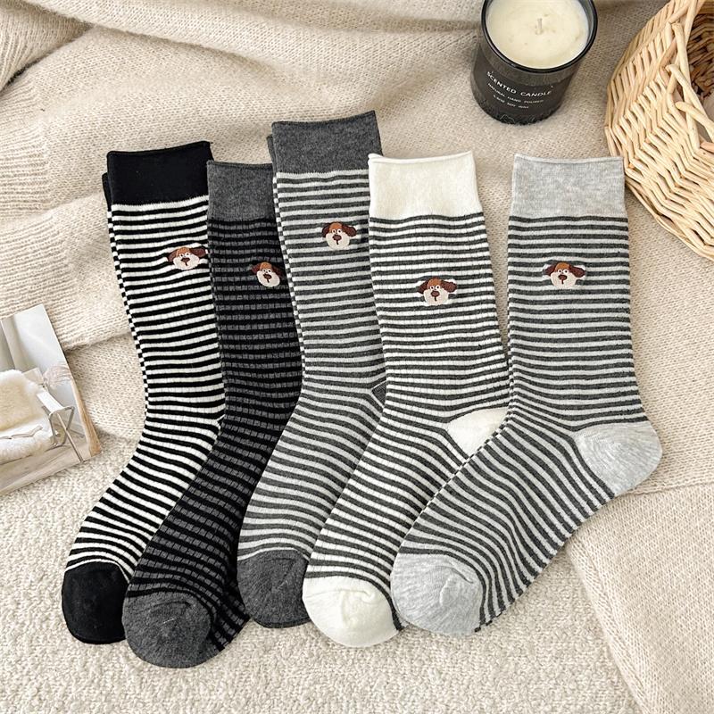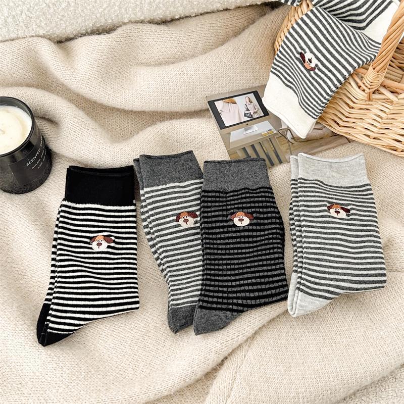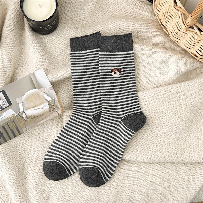 여성을위한 봄과 여름 새로운 자수 양말 귀여운 만화 강아지 중간 튜브 양말 대학 스타일 줄무늬 땀 흡수면 양말 도매