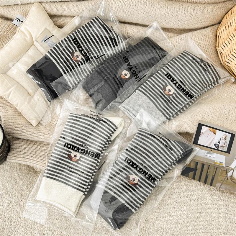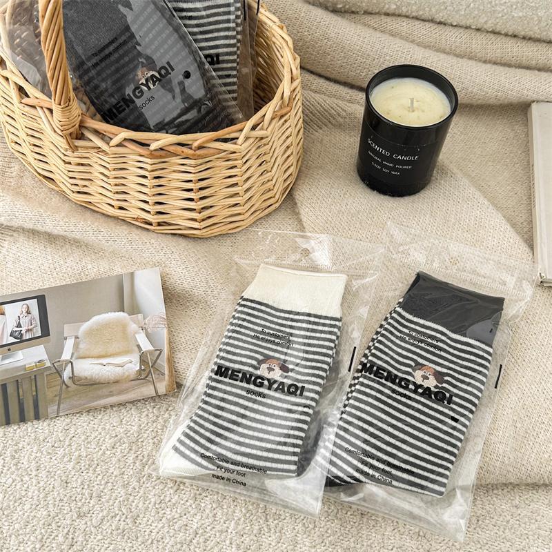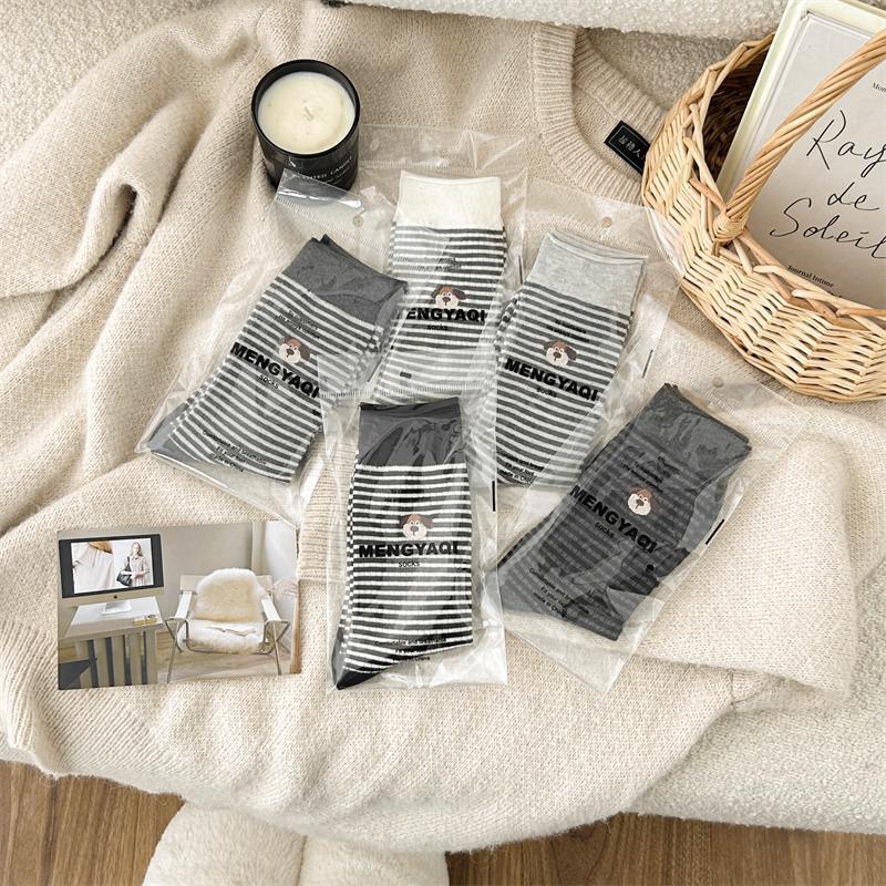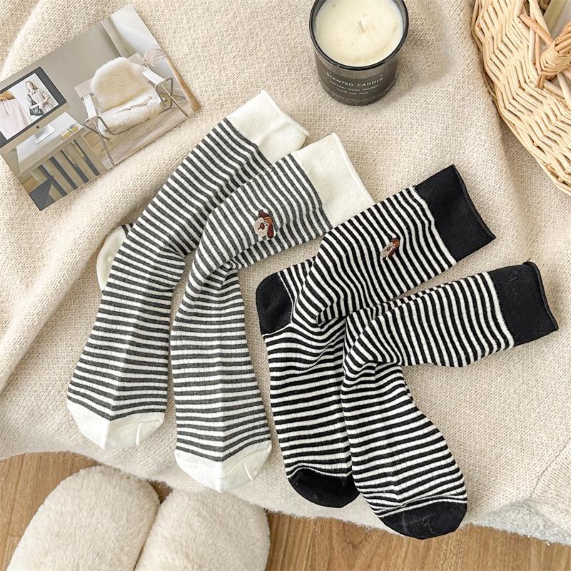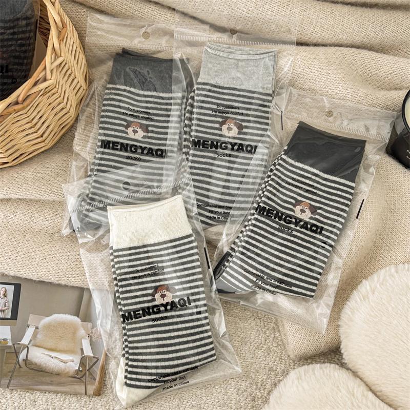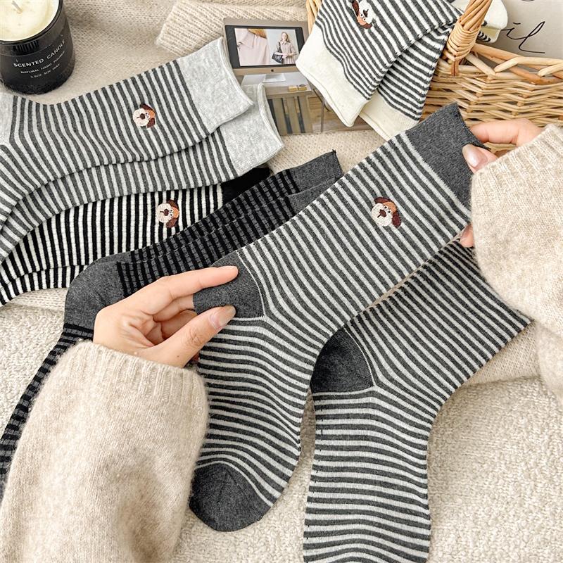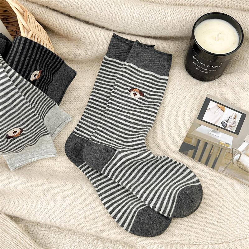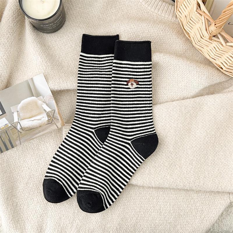 여성을위한 봄과 여름 새로운 자수 양말 귀여운 만화 강아지 중간 튜브 양말 대학 스타일 줄무늬 땀 흡수면 양말 도매