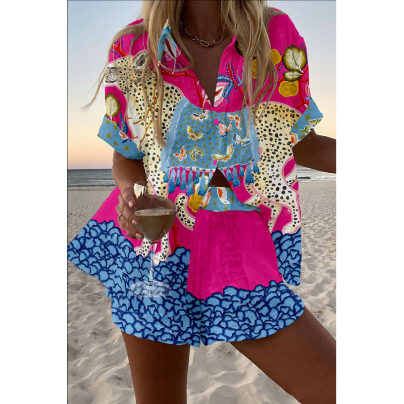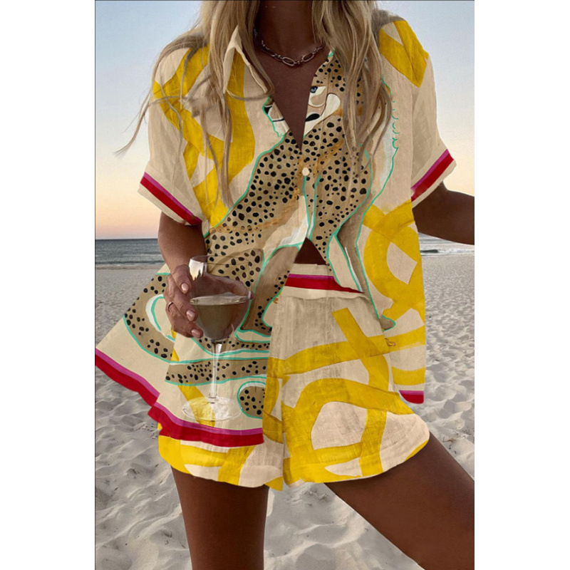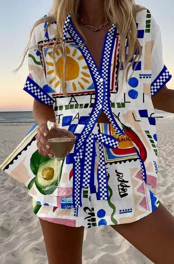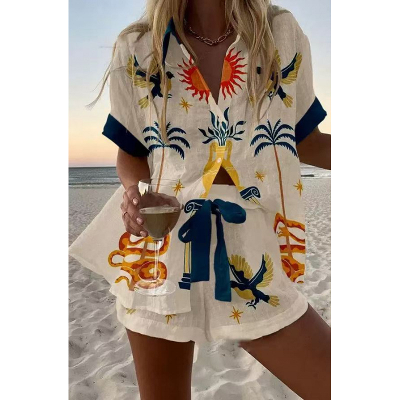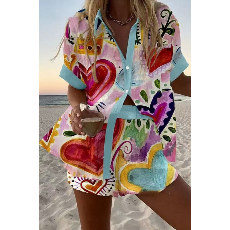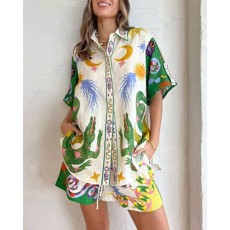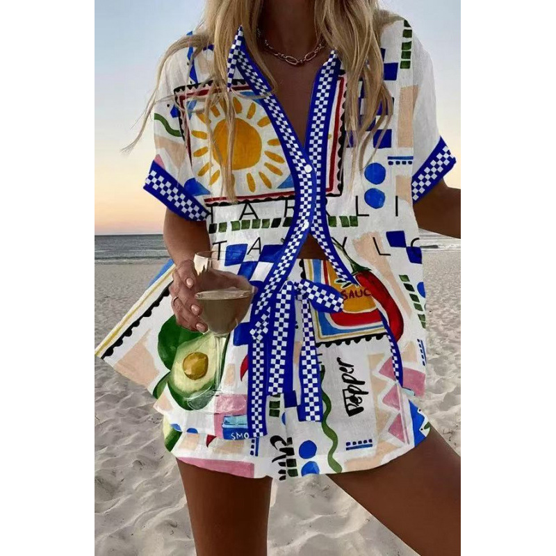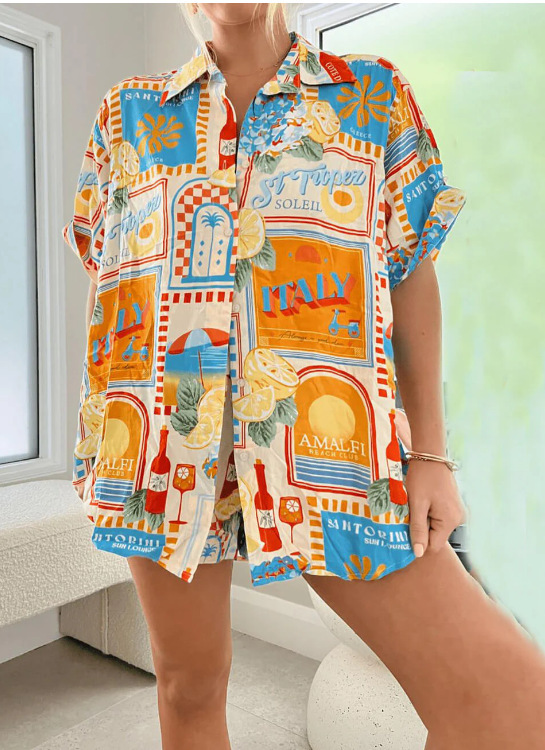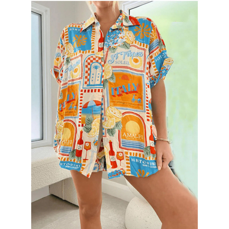 2025 봄 여름 아마존 유럽과 미국의 국경 간 패션 여성 의류 프린트 루즈 반바지 반팔 셔츠 POD 사용자 정의스토어 가기