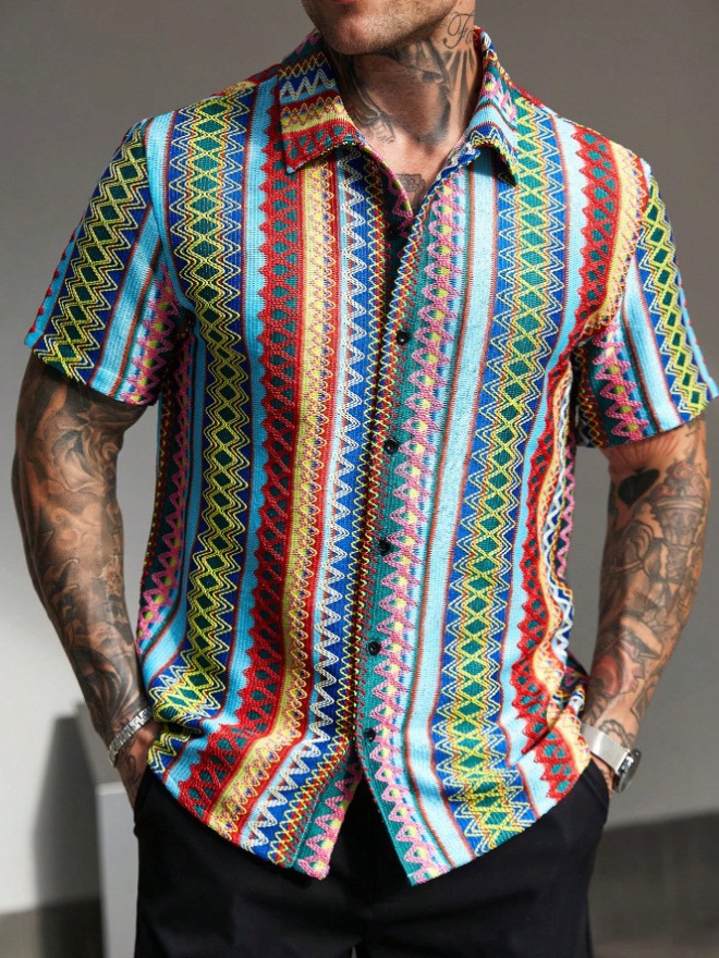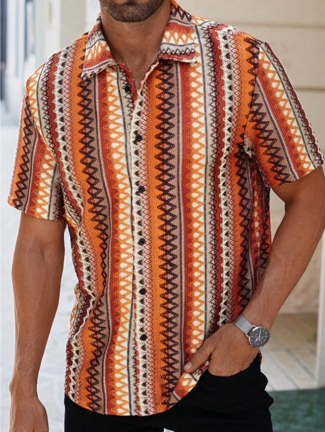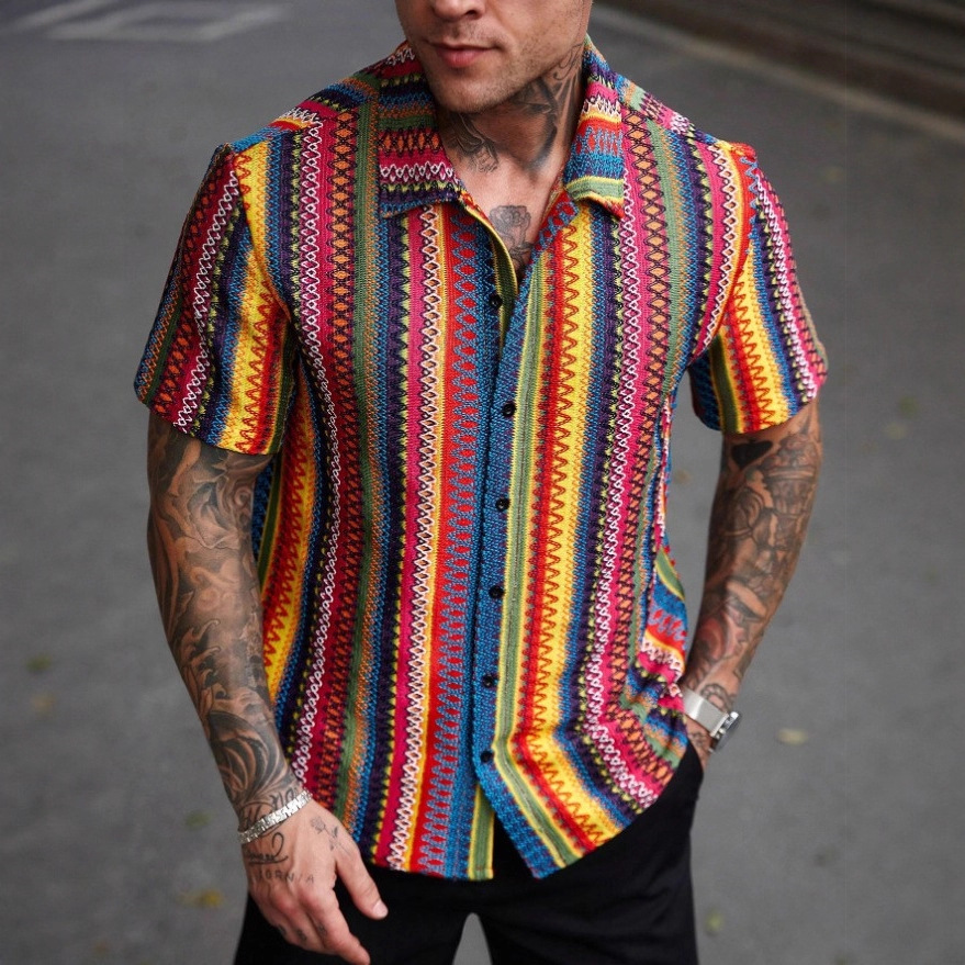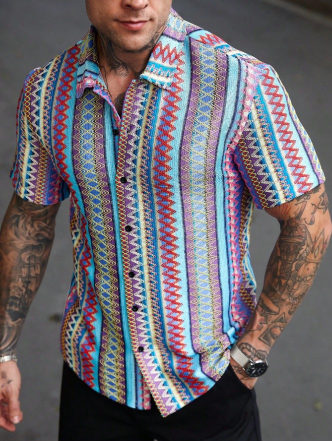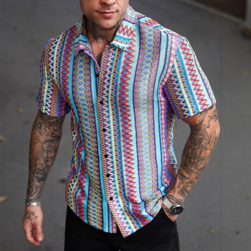 남성 셔츠 국경 국가 스타일 4 방향 탄성 디지털 인쇄 포켓 없음 얇은 데일리 캐주얼 남성용 반팔 셔츠