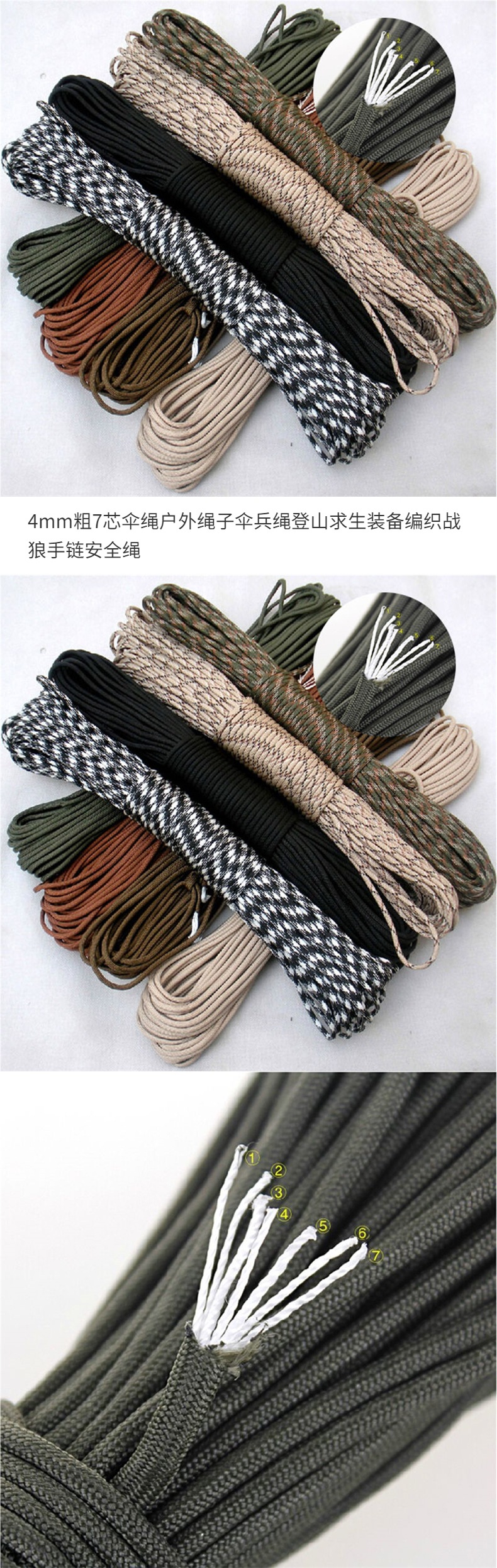 4mm 두께 7 코어 Paracord 야외 로프 낙하산 로프 등산 생존 장비 땋은 늑대 손목 밴드 안전