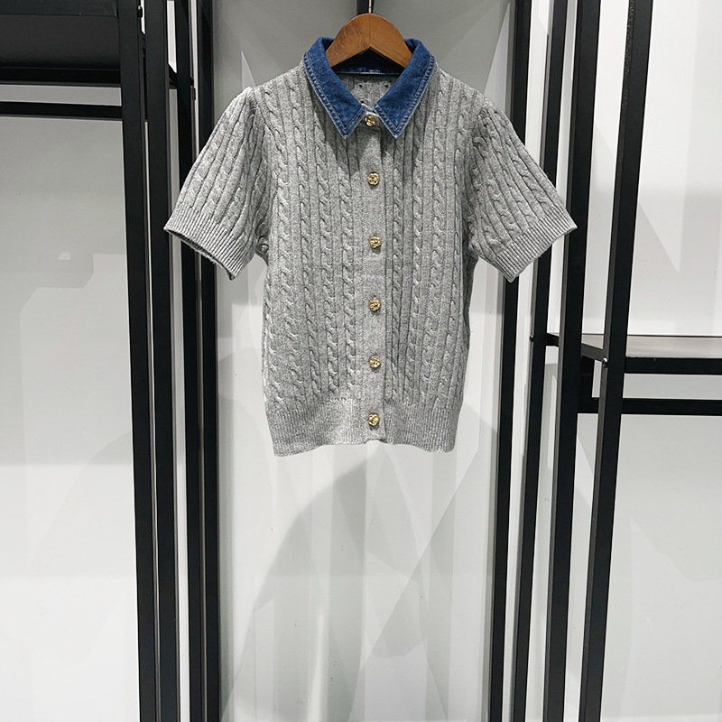 프렌치 니치 2025 초가을 영국 스타일 데님 칼라 케이블 니트 꽃 버튼 소프트 여성 반팔 셔츠 25531스토어 가기
