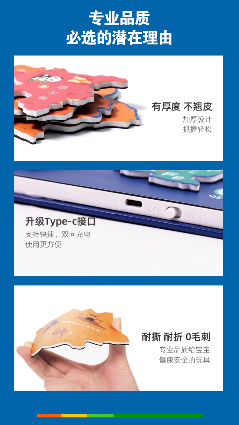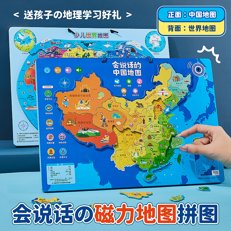 双面地图配件:手提礼盒*1、底板*1、中国地图拼块*57块、世界地图拼图*51块、知识速查手册*1、type-C数据线*1