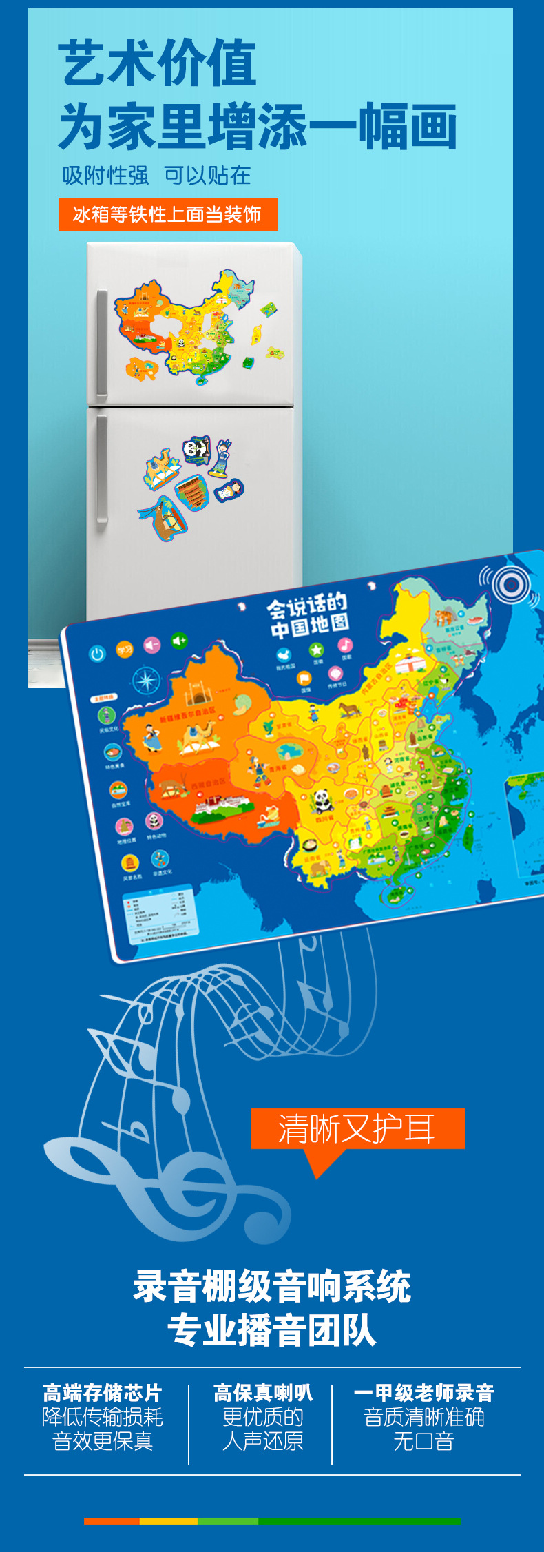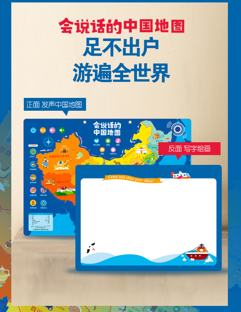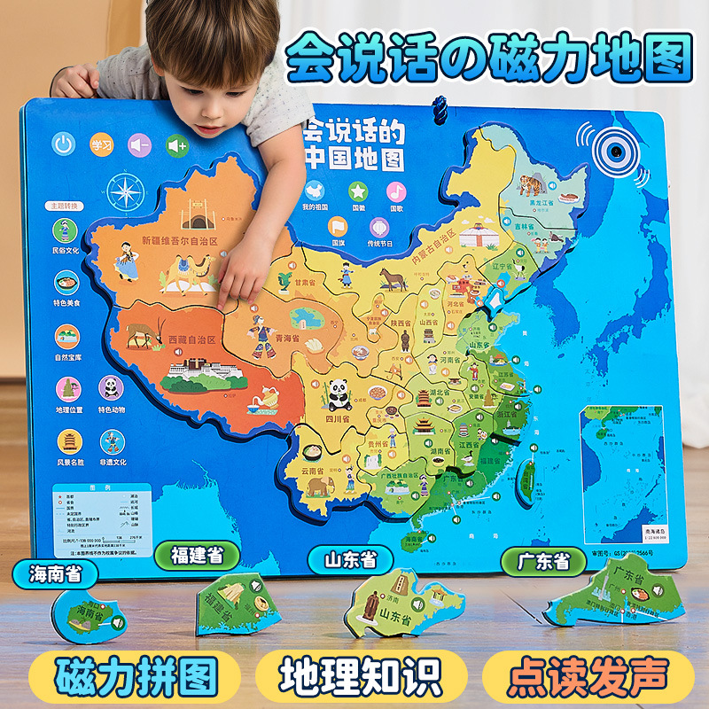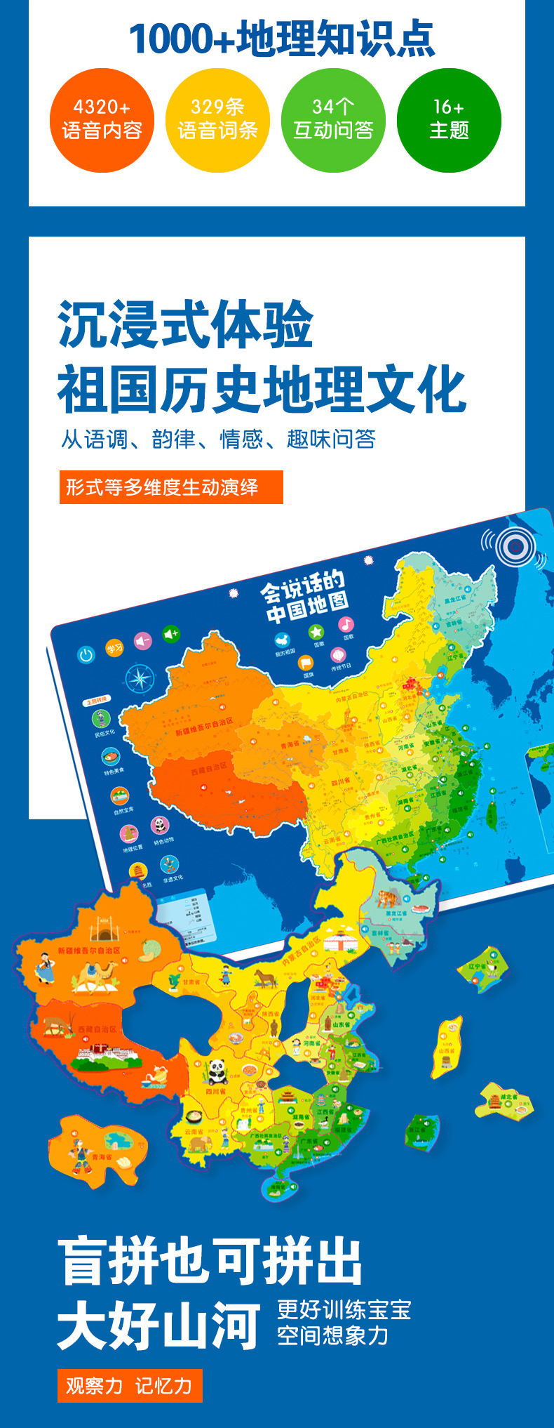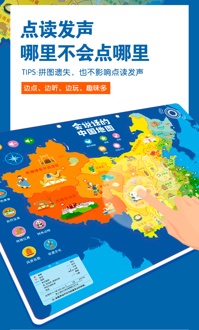 单面地图配件:手提礼盒*1、底板*1、中国地图拼块*57块、知识速查手册*1、type-C数据线*1,背面为白板