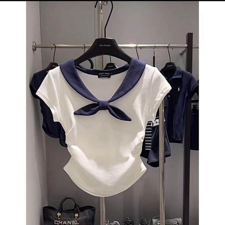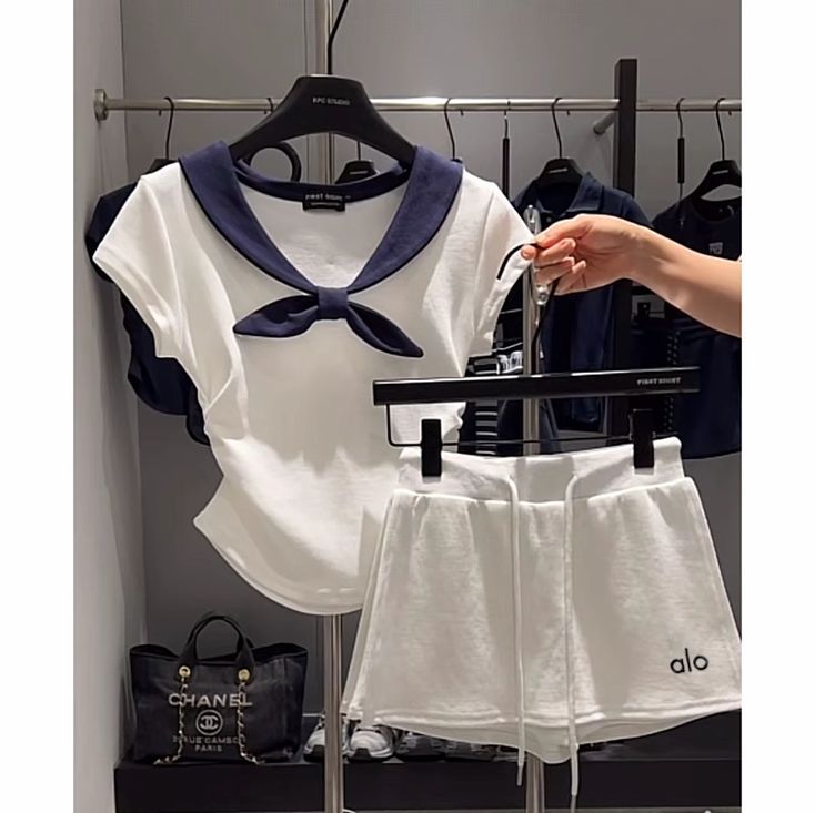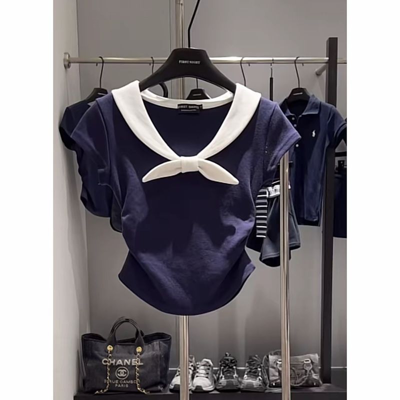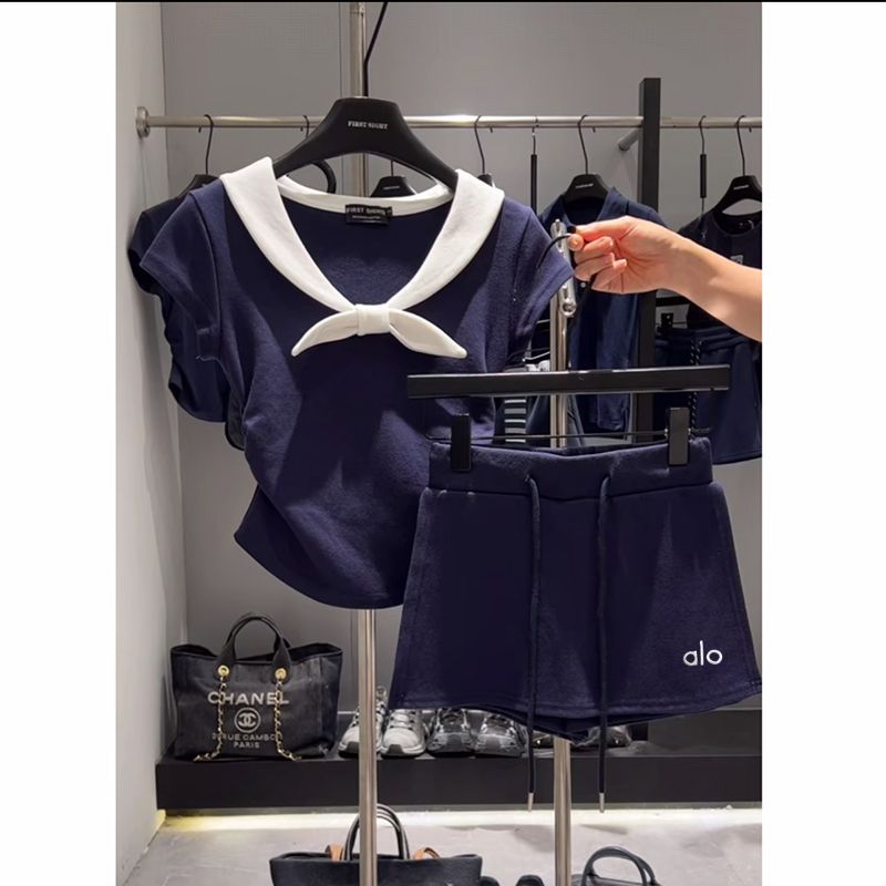 여름 허리 슬리밍 탑, 대비 컬러 브이넥 네이비 스타일 페이크 투피스 숄 티셔츠, 여성용 하이웨이스트 숏팬츠 슈트스토어 가기
