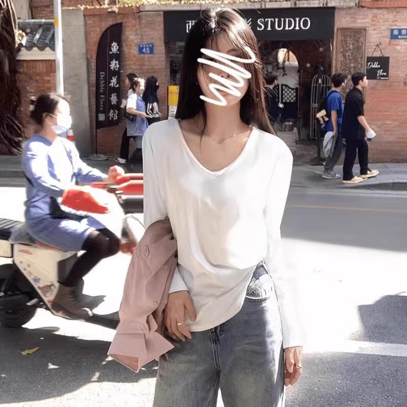 가을 신상 레이지 V넥 패셔너블 퓨어 러블리 스타일 긴팔 슬림핏 퓨어 화이트 탑 여성용 오버숄더 다용도 하의 셔츠스토어 가기
