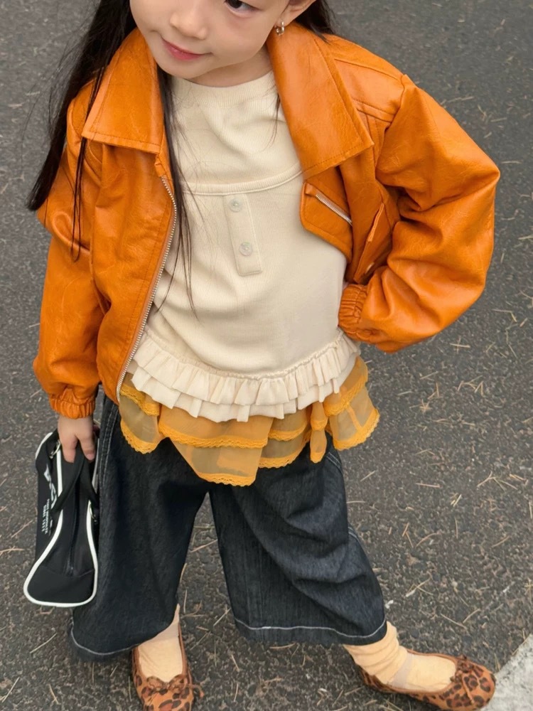 아동용 봄옷 2026 신상 여아 패셔너블하고 스타일리시한 바이커 가죽 자켓 유아용 짧은 노란색 자켓 상의
