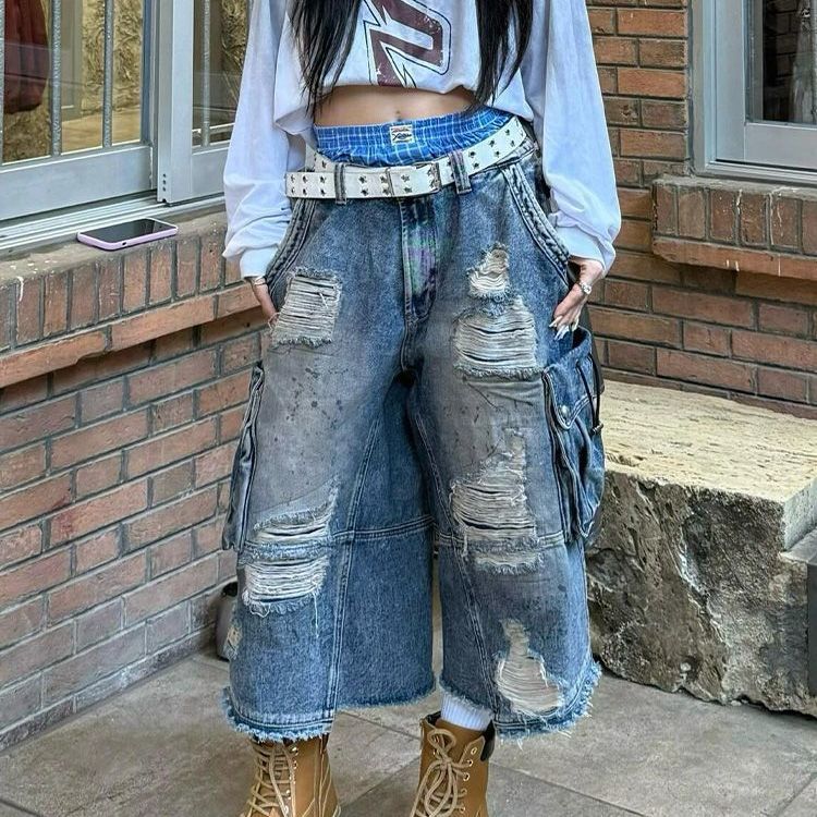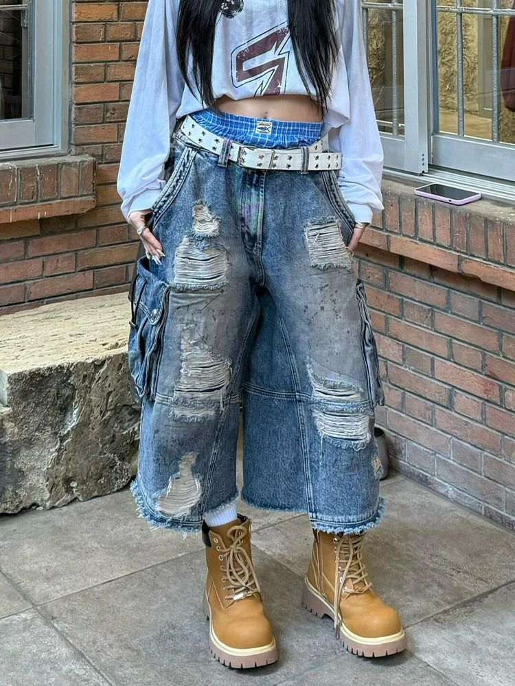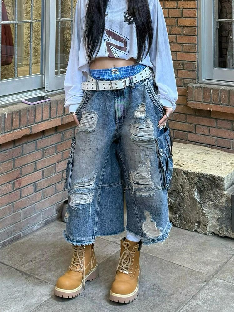 여름 핫걸을 위한 아메리칸 레트로 워싱 디스트레스드 데님 크롭 팬츠, 루즈하고 슬림하며 활용도가 높은 채플린 미드팬츠