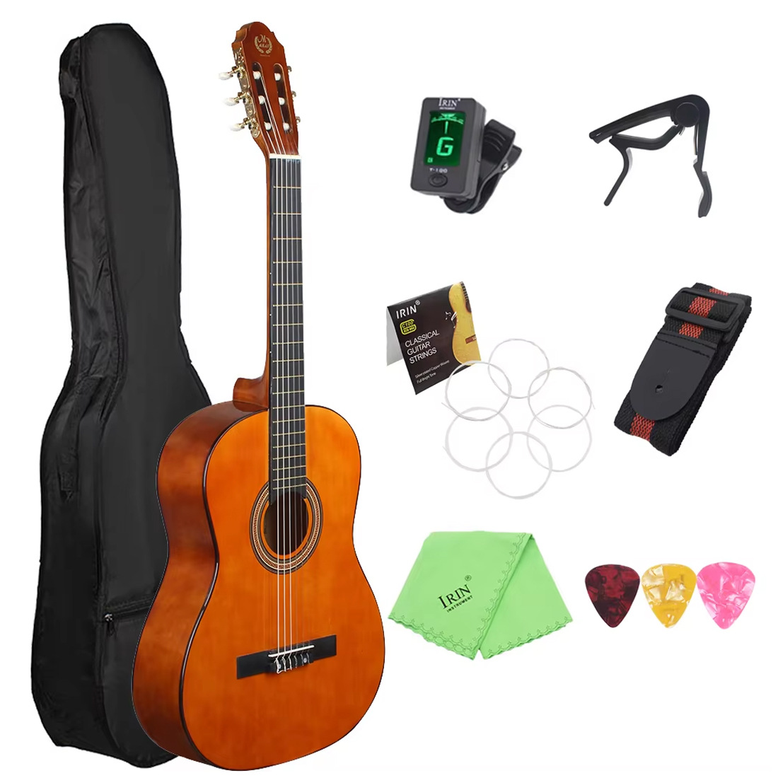包装清单:吉他+包+擦布+拨片*3+琴弦+背带+调音器+变调夹