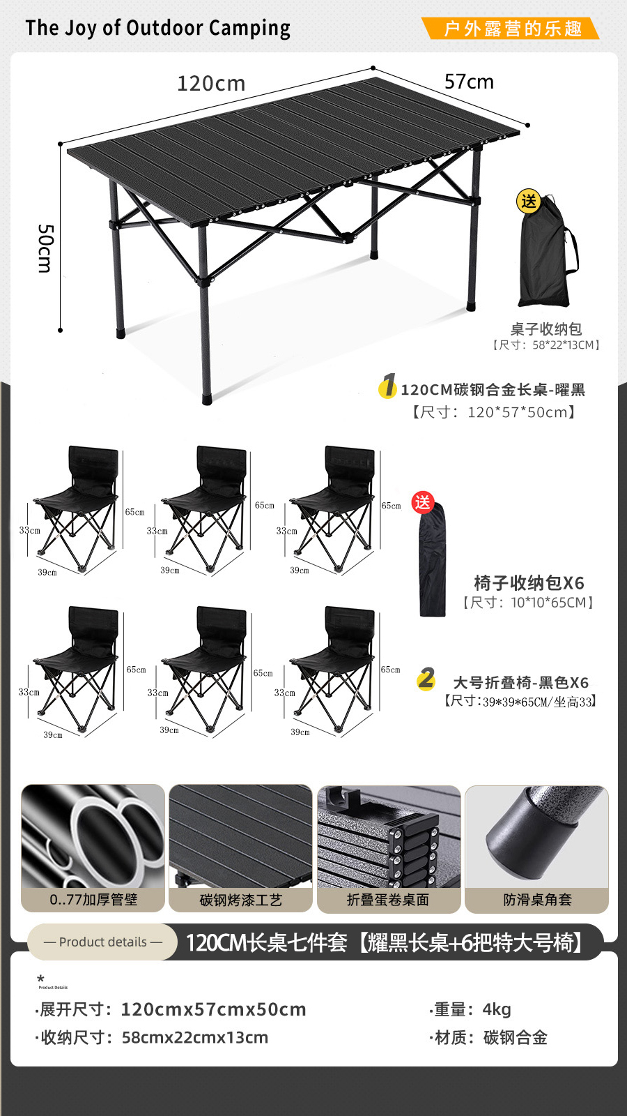 • [롱테이블 7종세트] 블랙 확대 120cm 롱테이블 + 특대 블랙 6개 (테이블과 의자에는 수납가방이 포함되어 있습니다)