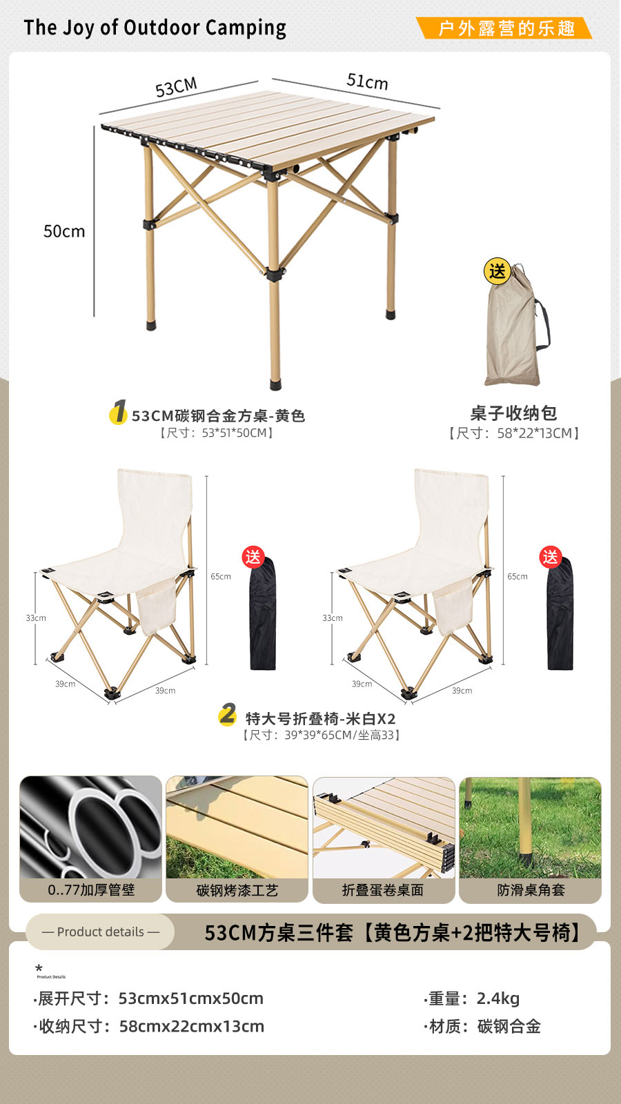 • [사각테이블 3종세트] 옐로우 50cm 사각테이블 + 특대 오프화이트 2개 (테이블과 의자에는 수납가방이 포함되어 있습니다)