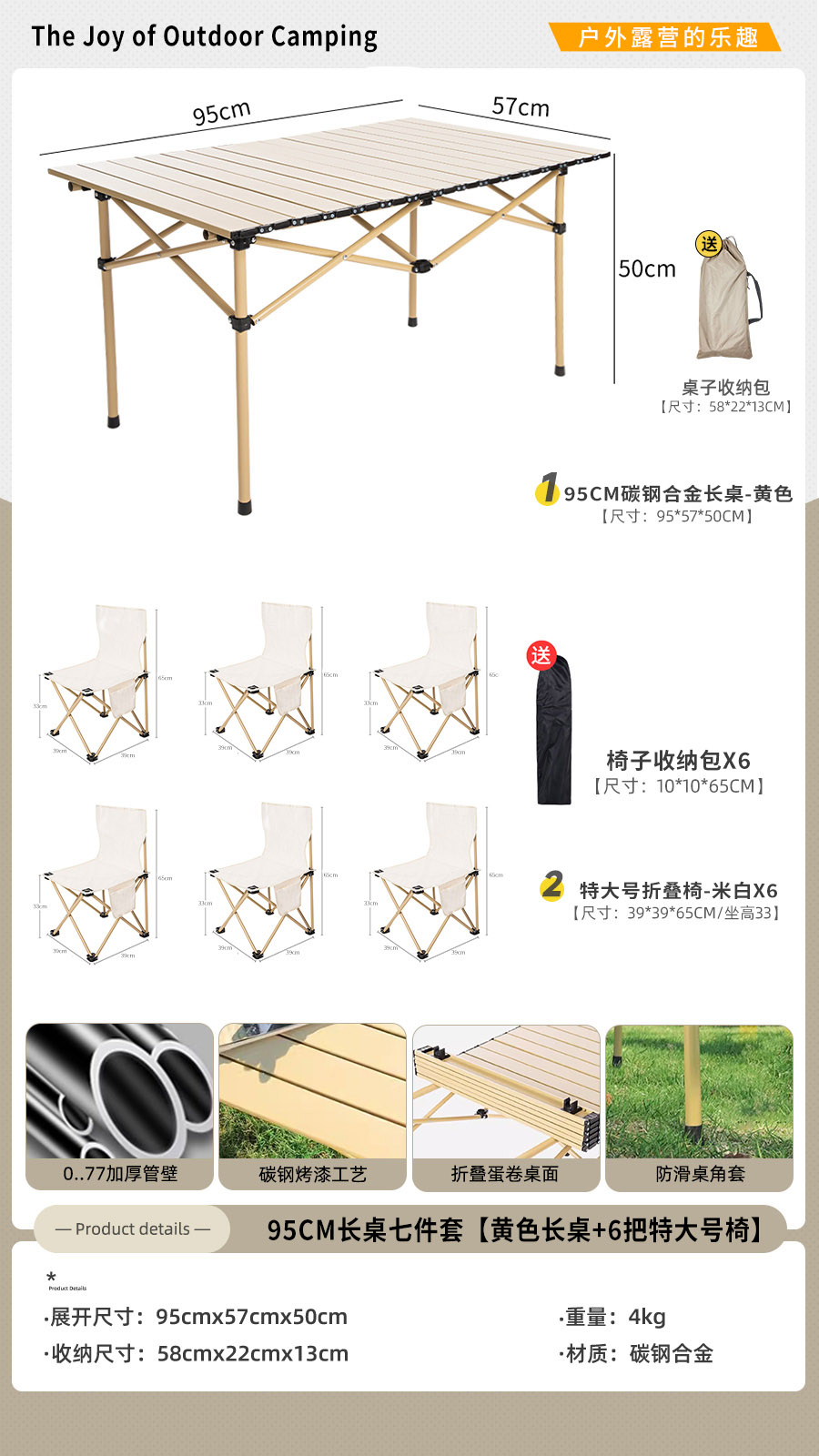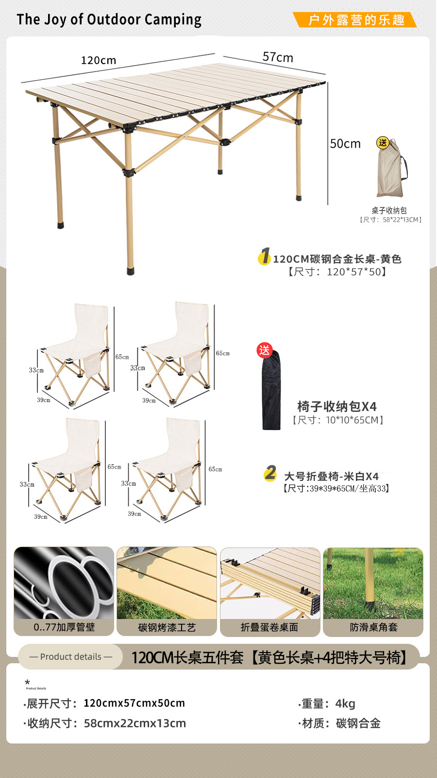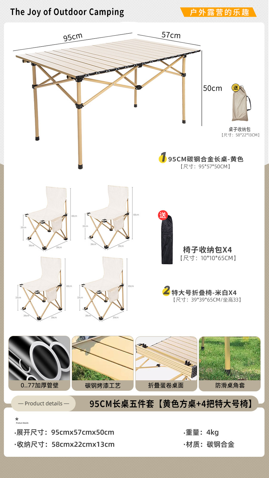 • [롱테이블 5종세트] 옐로우 95cm 롱테이블 + 특대 오프화이트 4개 (테이블과 의자에는 수납가방이 포함되어 있습니다)