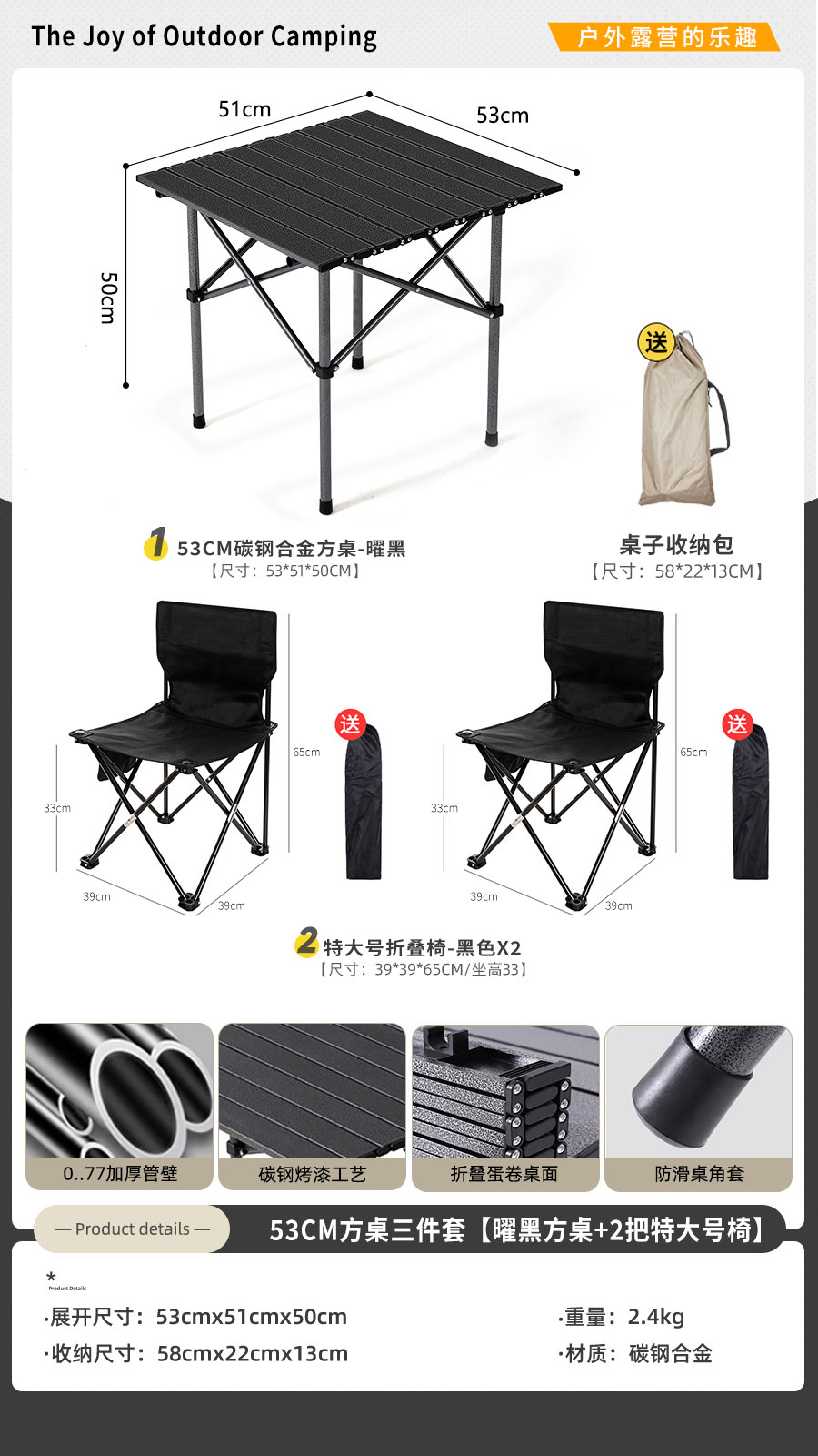 • [사각테이블 3종세트] 블랙 50cm 사각테이블 + 특대형 블랙 2개 (테이블과 의자에는 수납가방이 포함되어 있습니다)