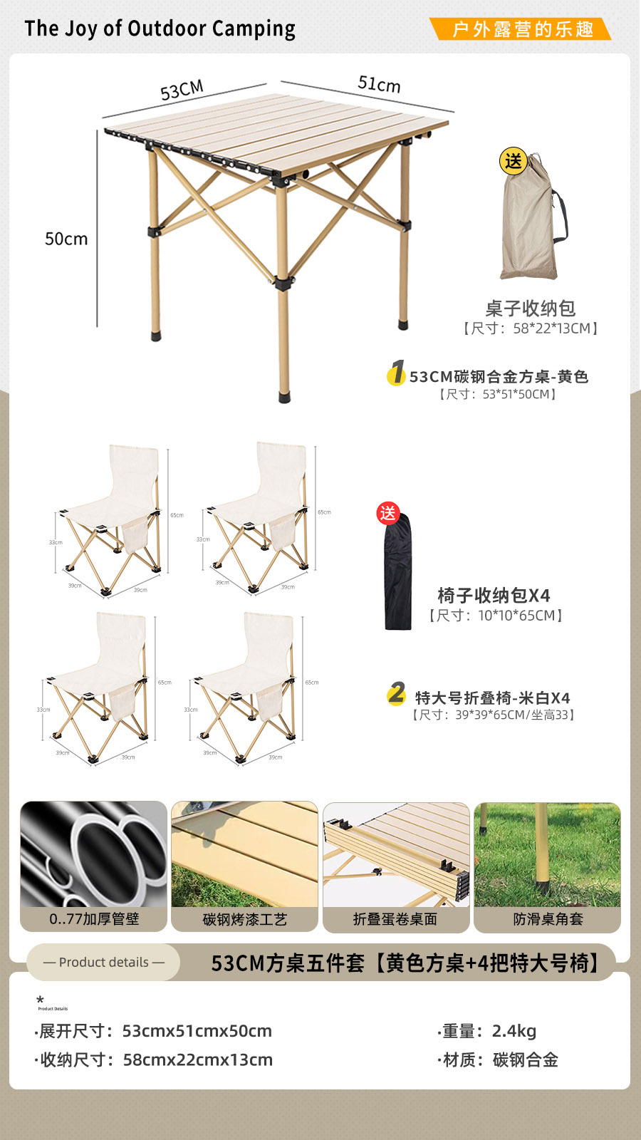 • [사각테이블 5종세트] 옐로우 50cm 사각테이블 + 특대 오프화이트 4개 (테이블과 의자에는 수납가방이 포함되어 있습니다)