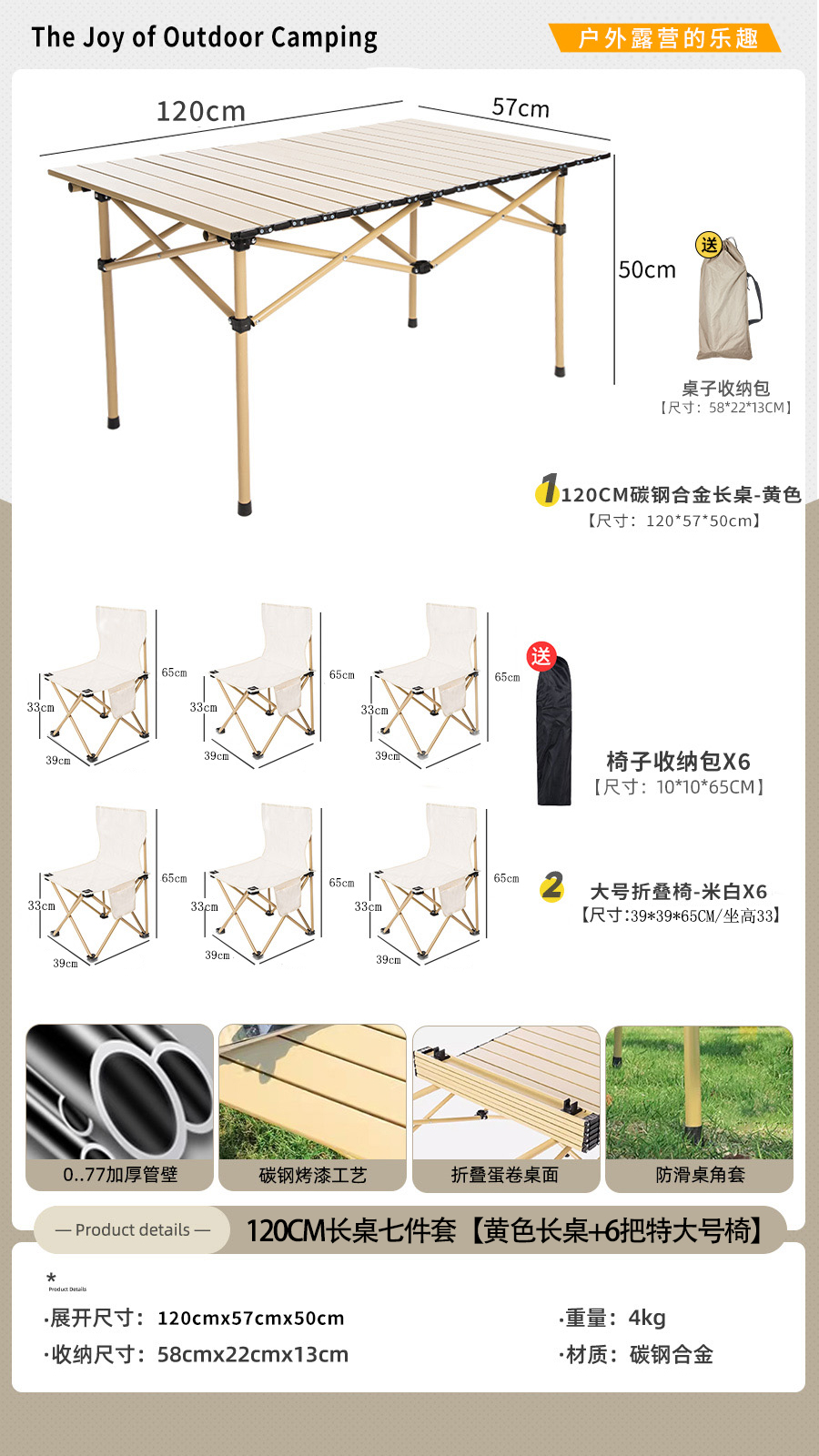 • [롱테이블 7종세트] 옐로우 확대 120cm 롱테이블 + 특대 오프화이트 6개 (테이블과 의자에는 수납가방이 포함되어 있습니다)