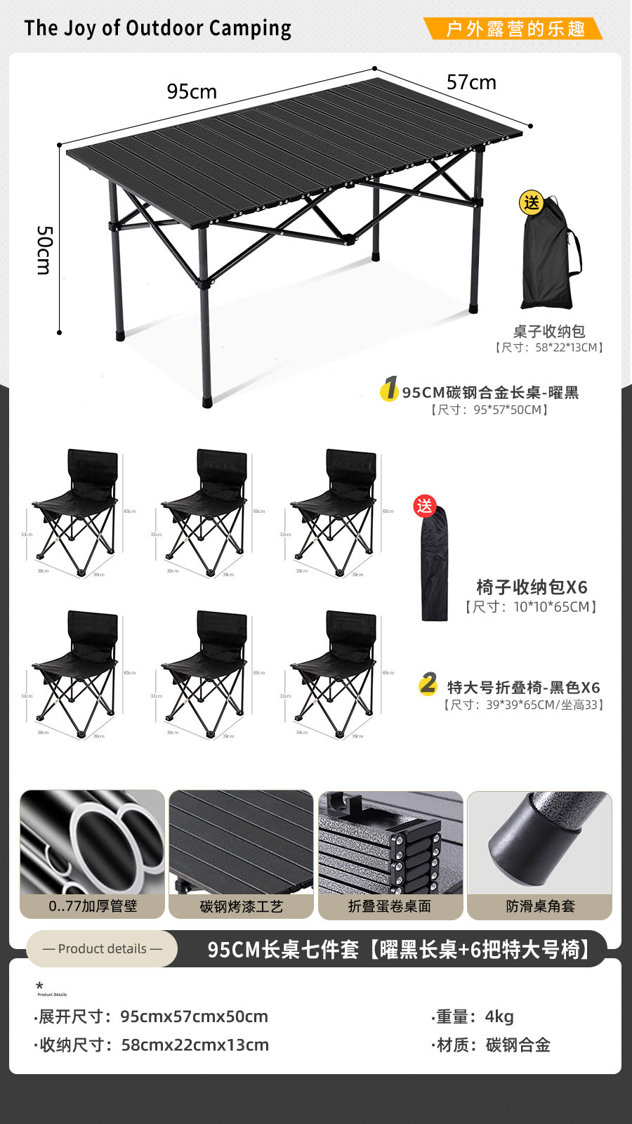 • [롱테이블 7종세트] 블랙 95cm 롱테이블 + 특대형 블랙 6개 (테이블과 의자에는 수납가방이 포함되어 있습니다)