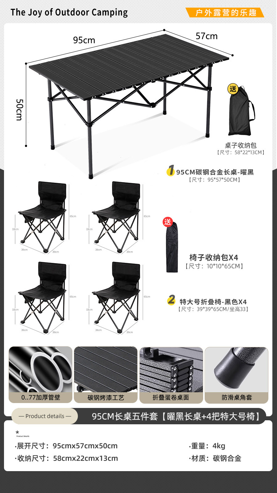 • [롱테이블 5종세트] 블랙 95cm 롱테이블 + 특대형 블랙 4개 (테이블과 의자에는 수납가방이 포함되어 있습니다)