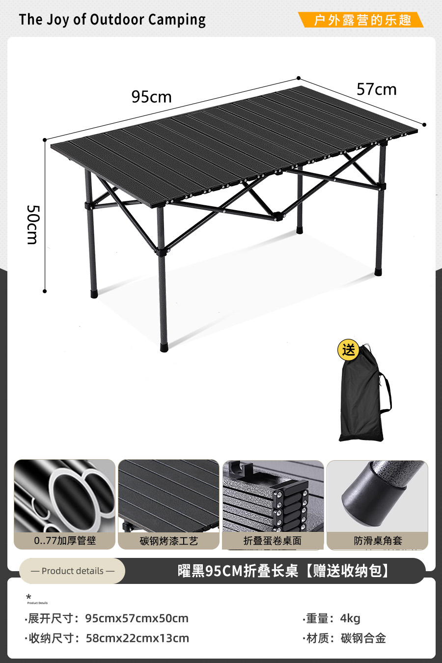 • [강화 및 두꺼워진 95cm 롱 테이블] - 블랙 (수납 가방 포함)