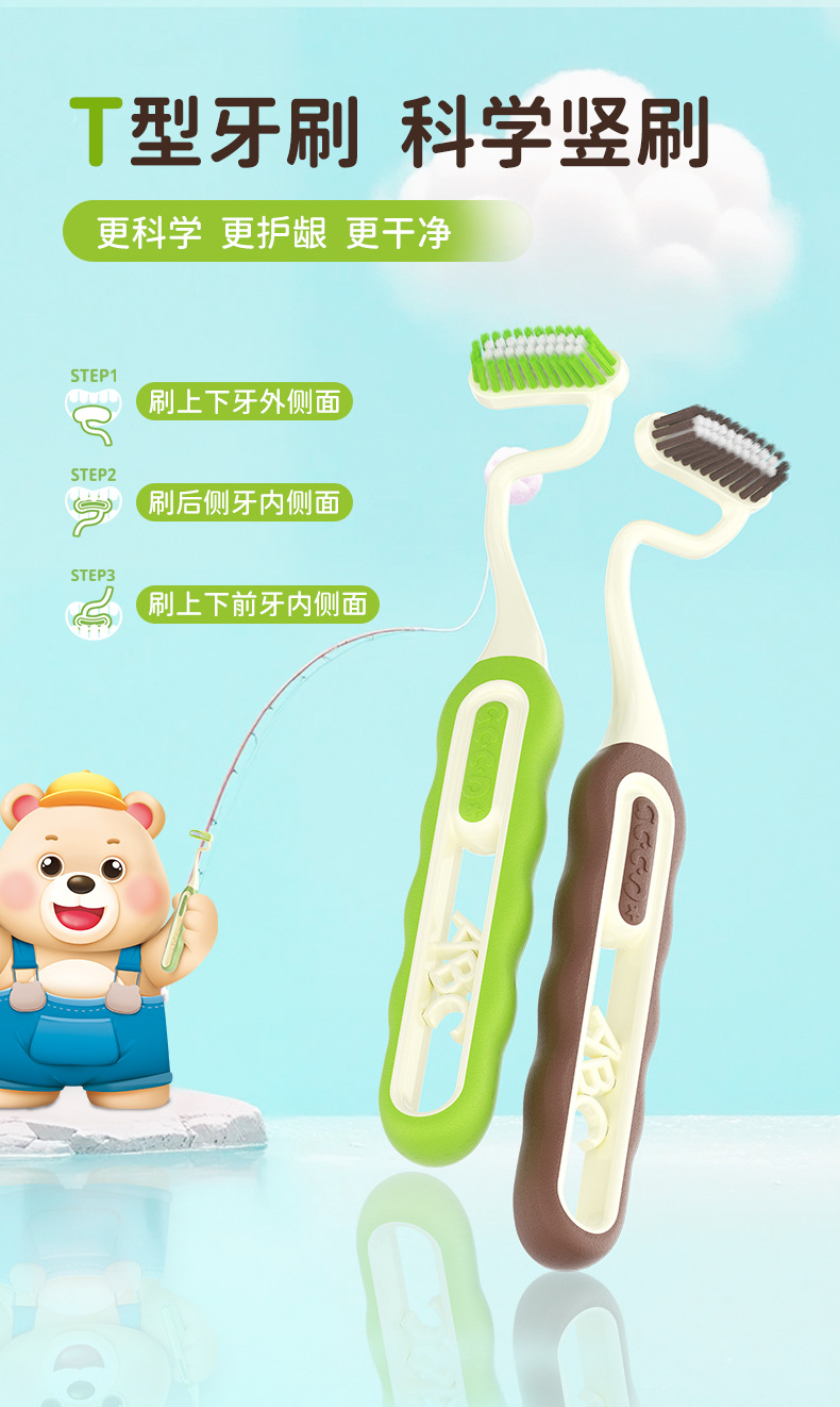 일본 브랜드 T자형 어린이용 칫솔, 세로 브러시, 위아래 세로 브러시, 청소 및 잇몸 보호, 어린이용 칫솔, 부드러운 모 T자형 칫솔