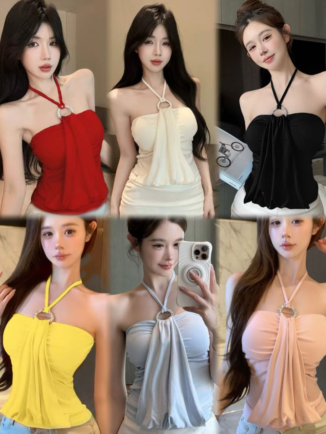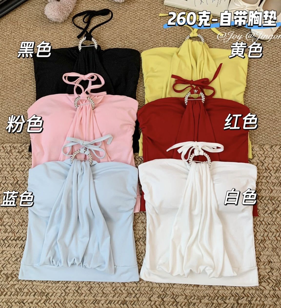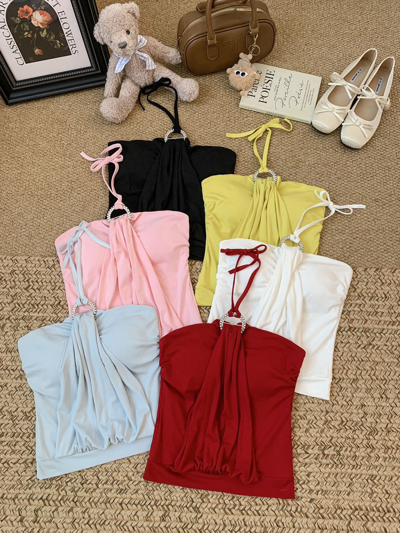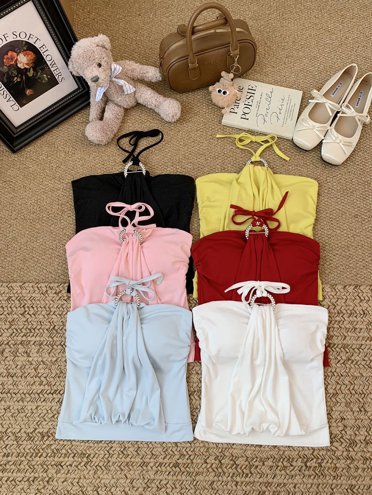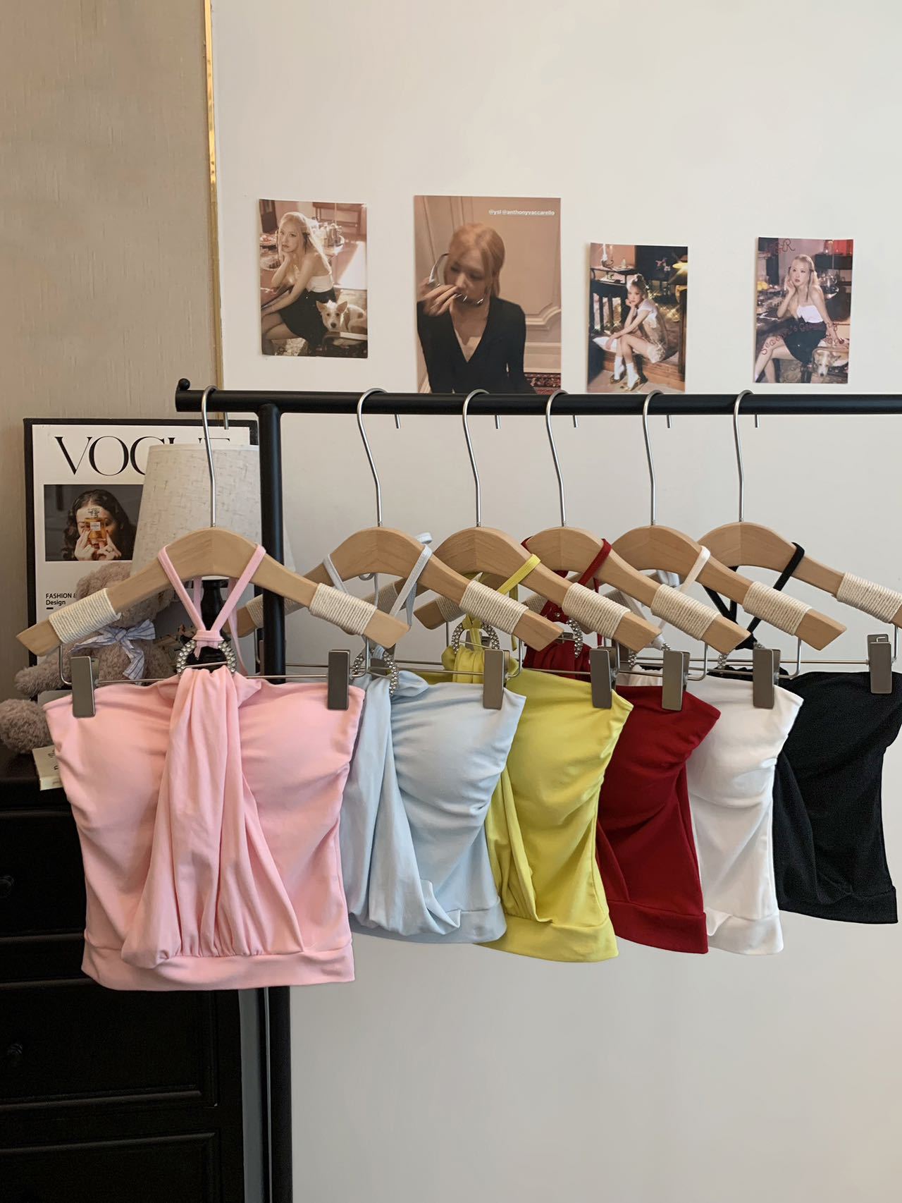 66009 # 여름 신작 레이온 퓨어 러스 섹시한 홀터넥 백리스 튜브 탑 여성용 세련된 슬림 짧은 캐미솔 탑스토어 가기
