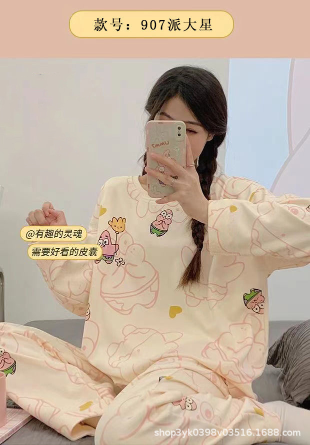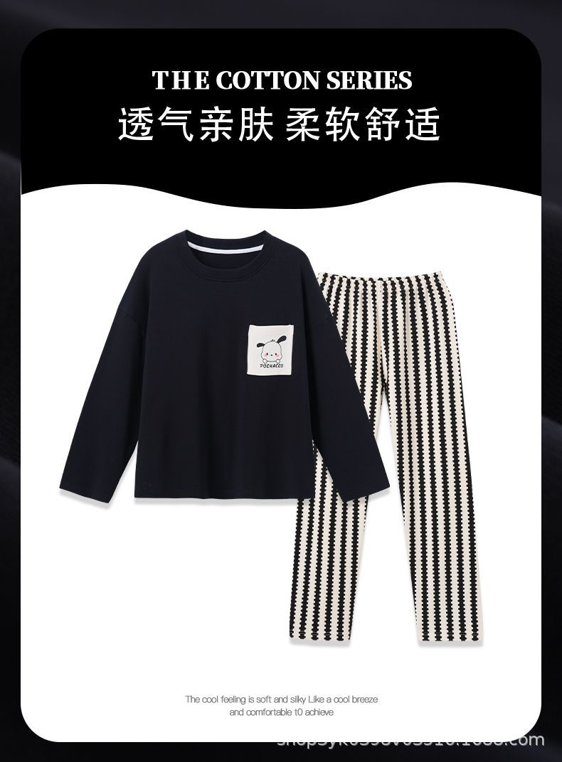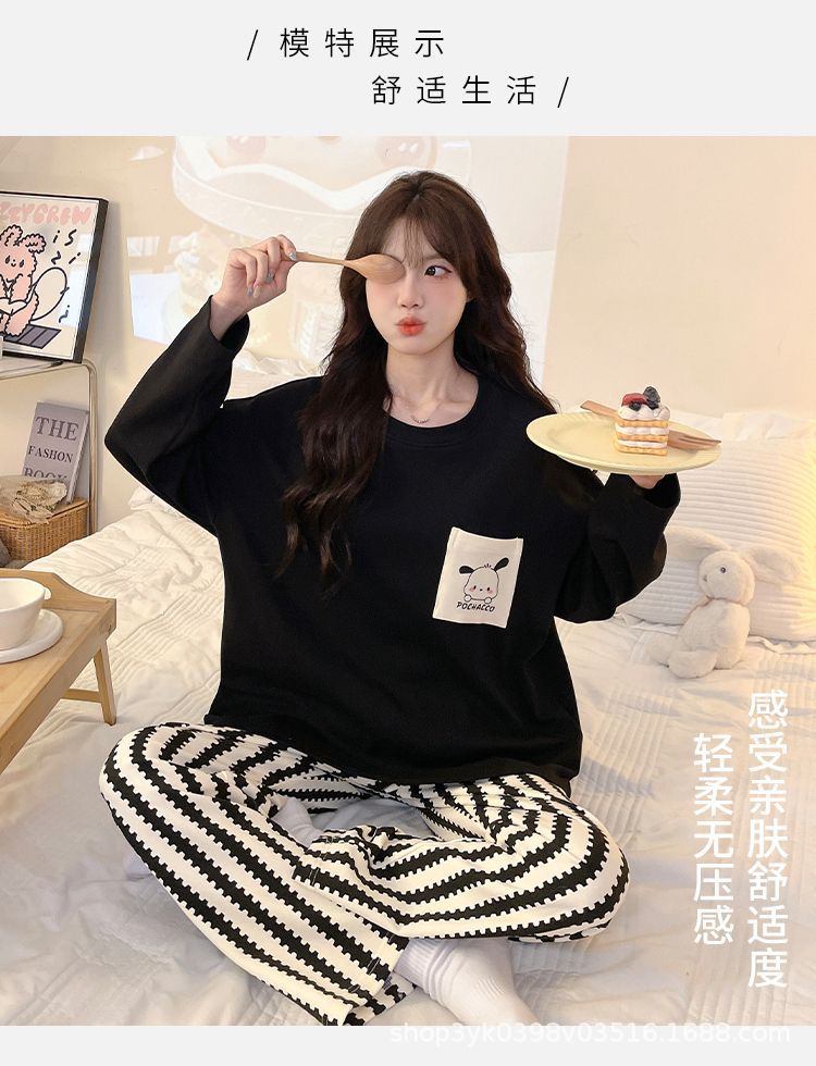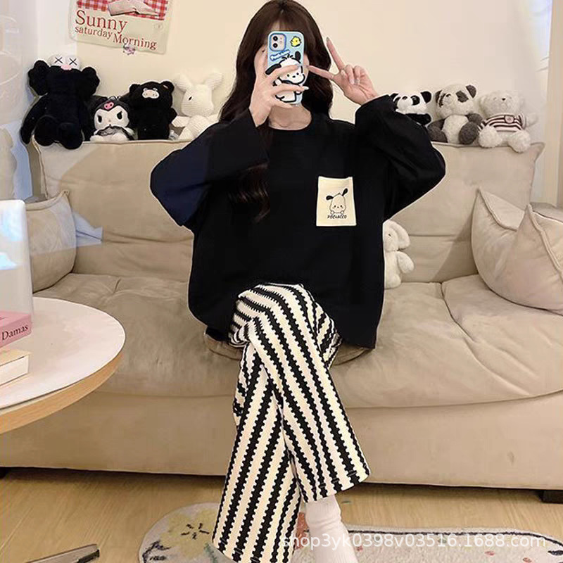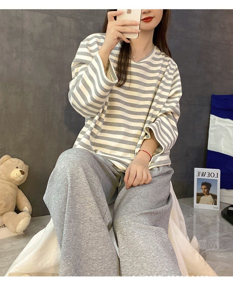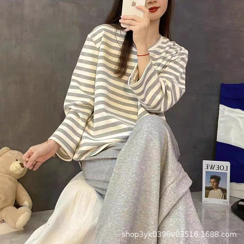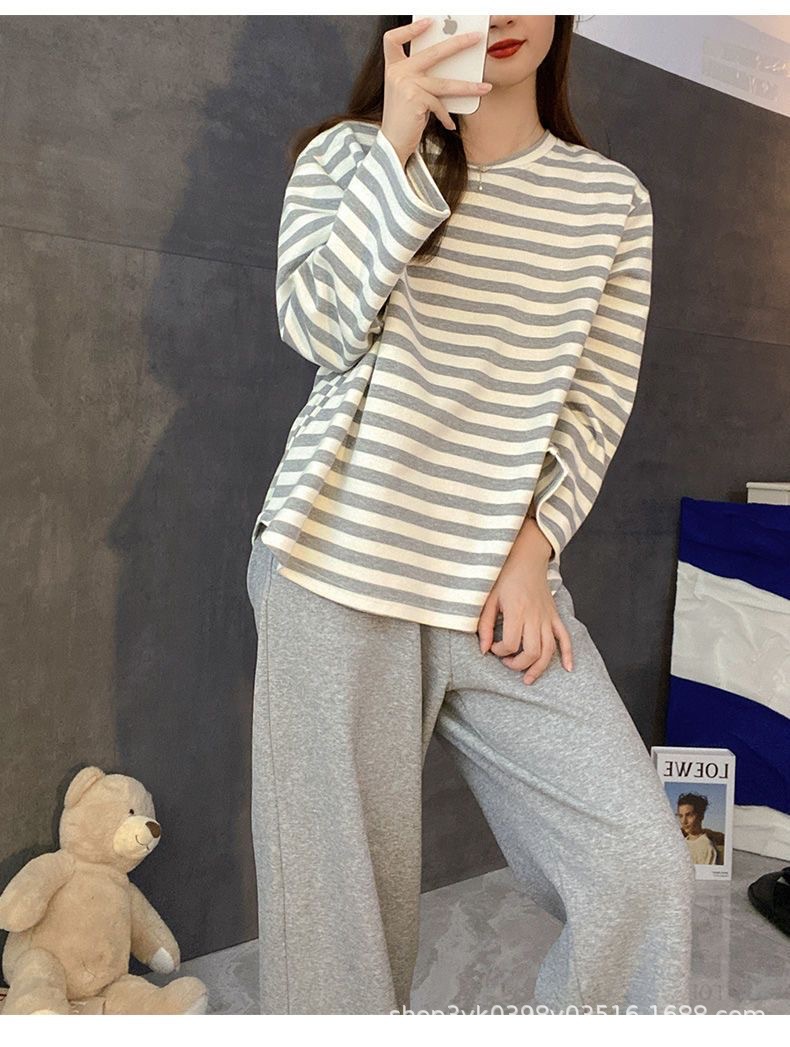 여성용 잠옷 봄, 가을 2025 새로운 긴팔 바지 한국 스타일 캐주얼 줄무늬 홈웨어 세트 도매 외부 착용 가능스토어 가기