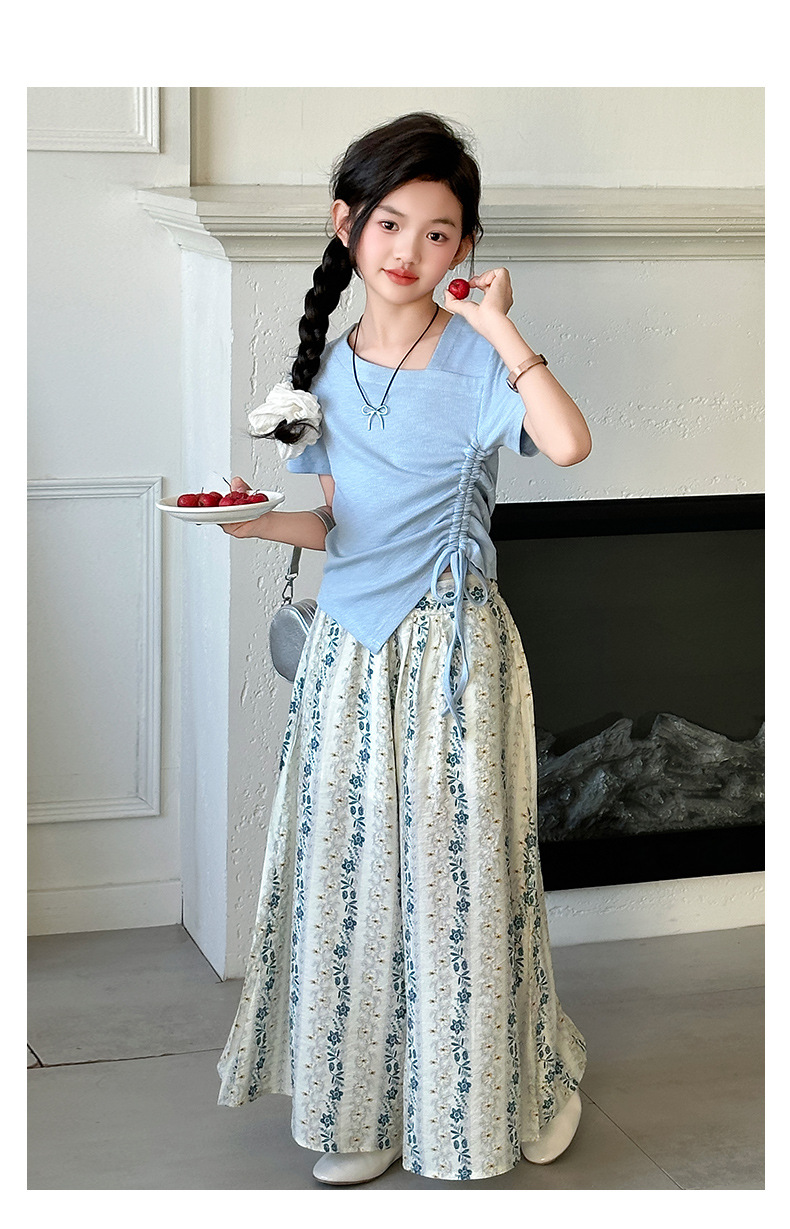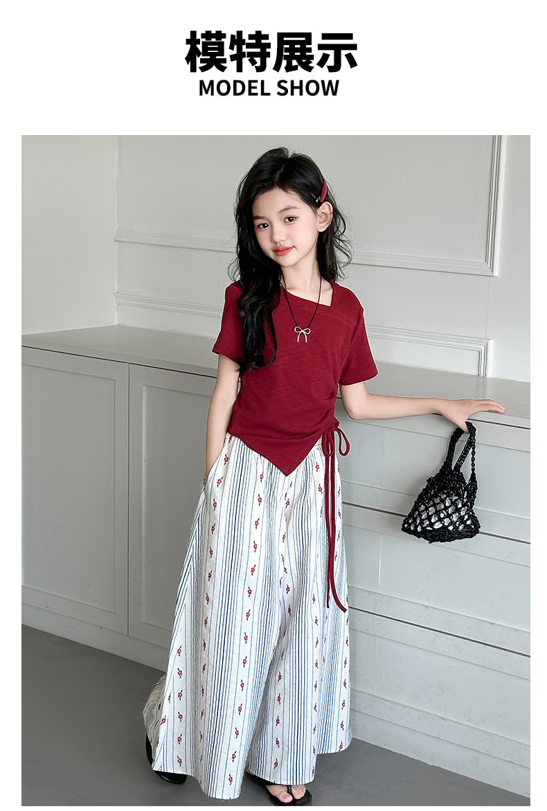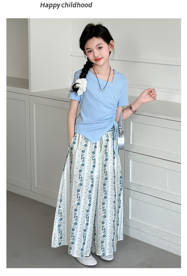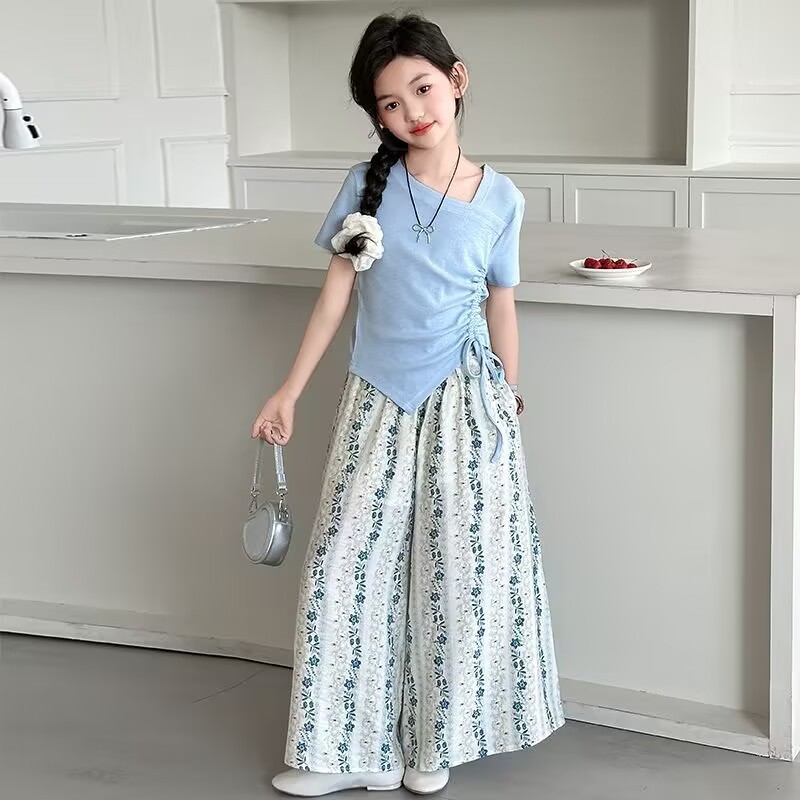 여아 여름 패션 슈트, 신상 중대형 아동 한국식 불규칙 주름 티셔츠 와이드 팬츠 한국식 투피스 세트