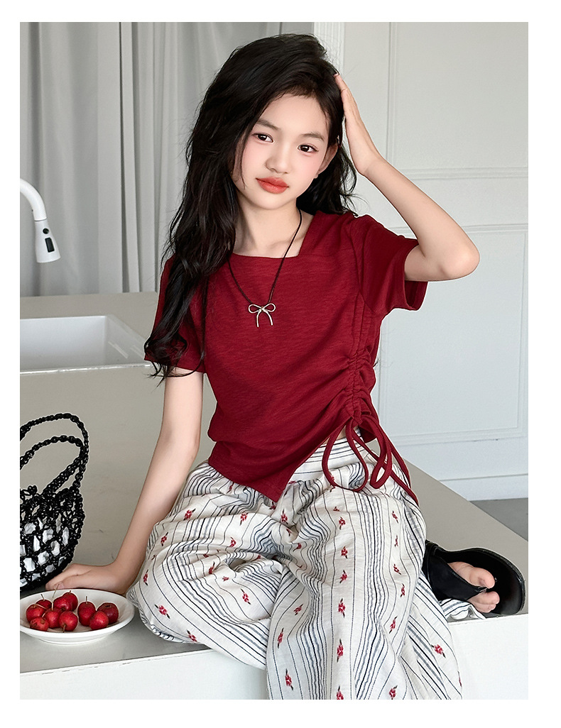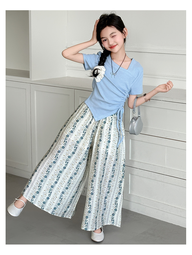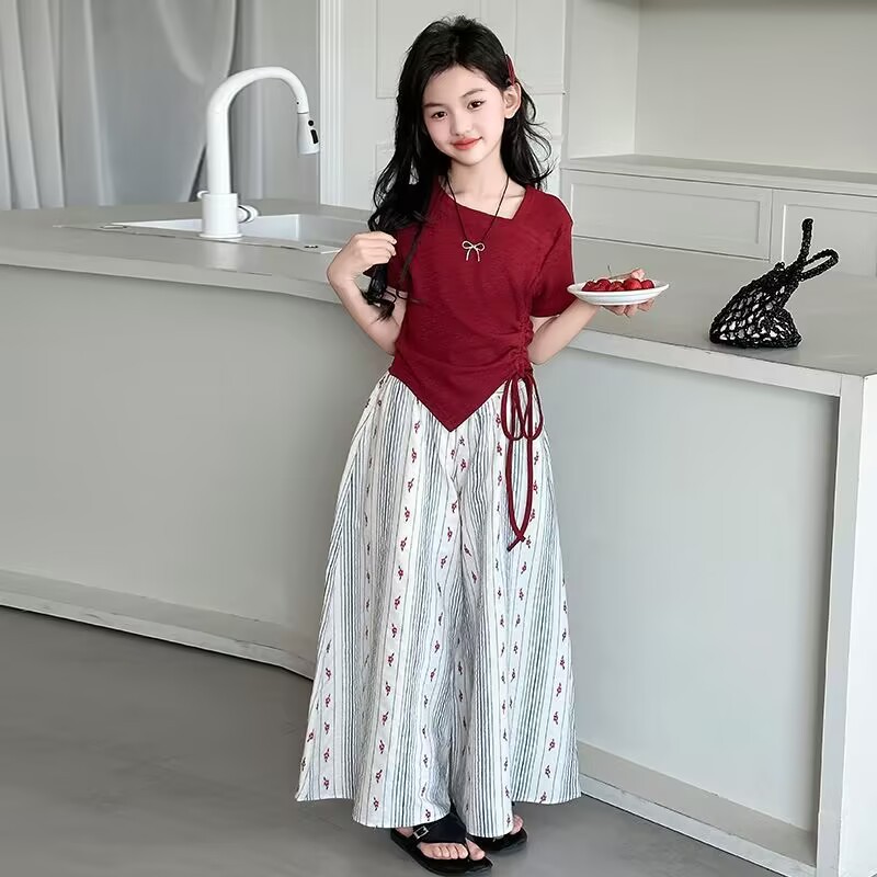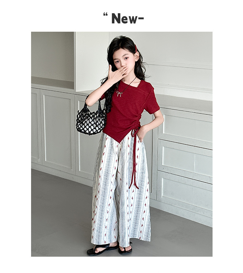 여아 여름 패션 슈트, 신상 중대형 아동 한국식 불규칙 주름 티셔츠 와이드 팬츠 한국식 투피스 세트