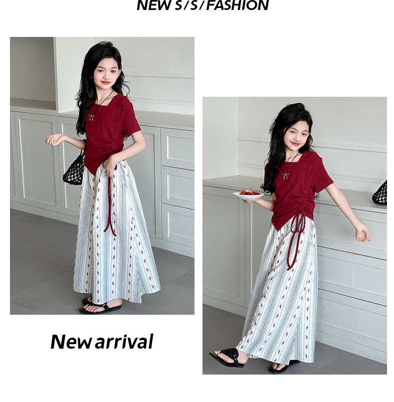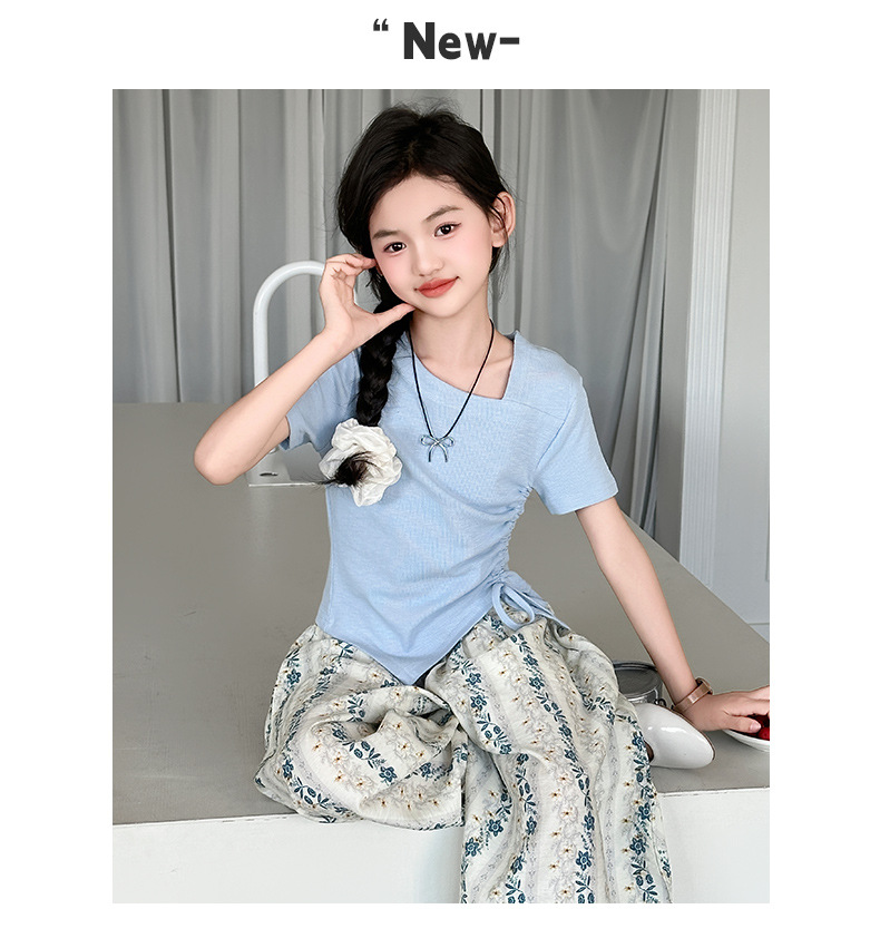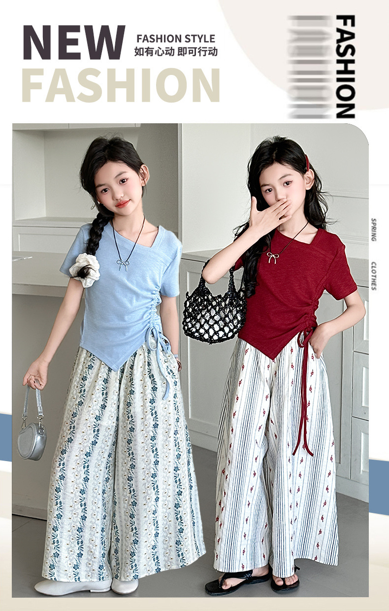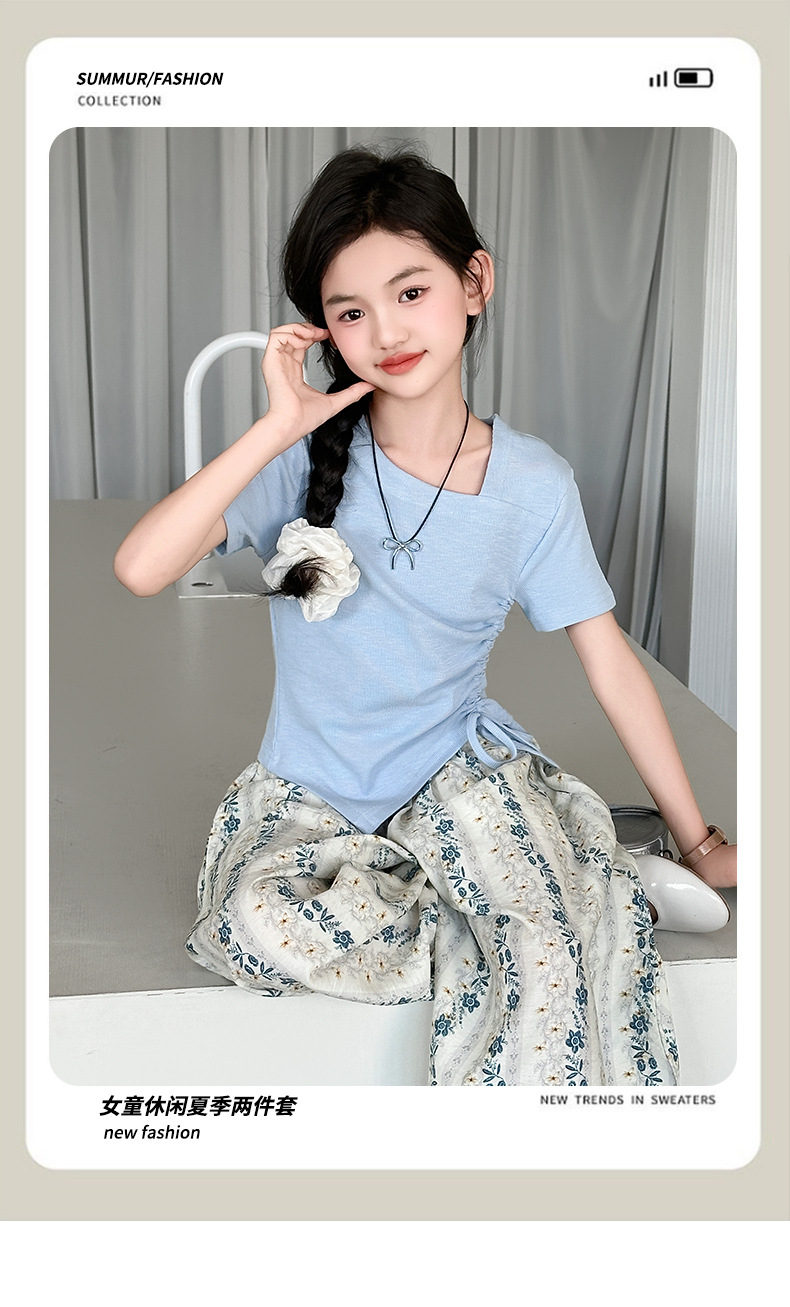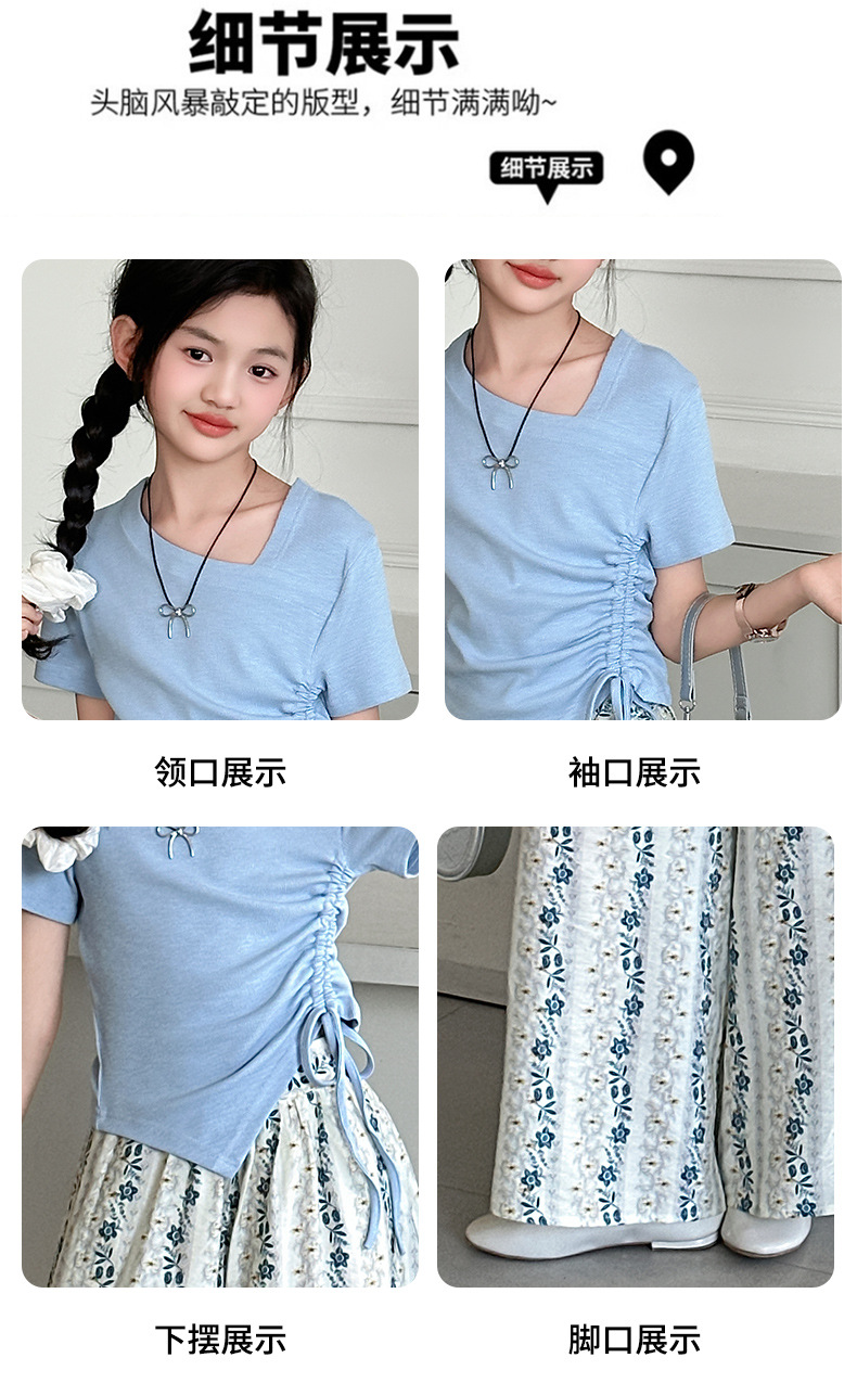 여아 여름 패션 슈트, 신상 중대형 아동 한국식 불규칙 주름 티셔츠 와이드 팬츠 한국식 투피스 세트스토어 가기