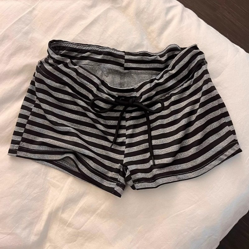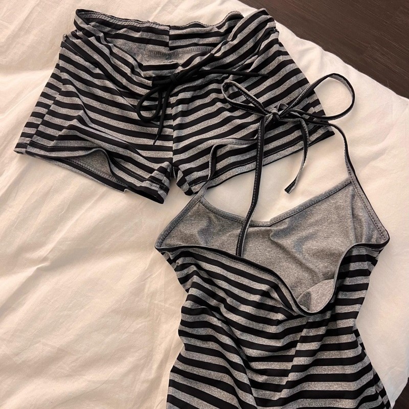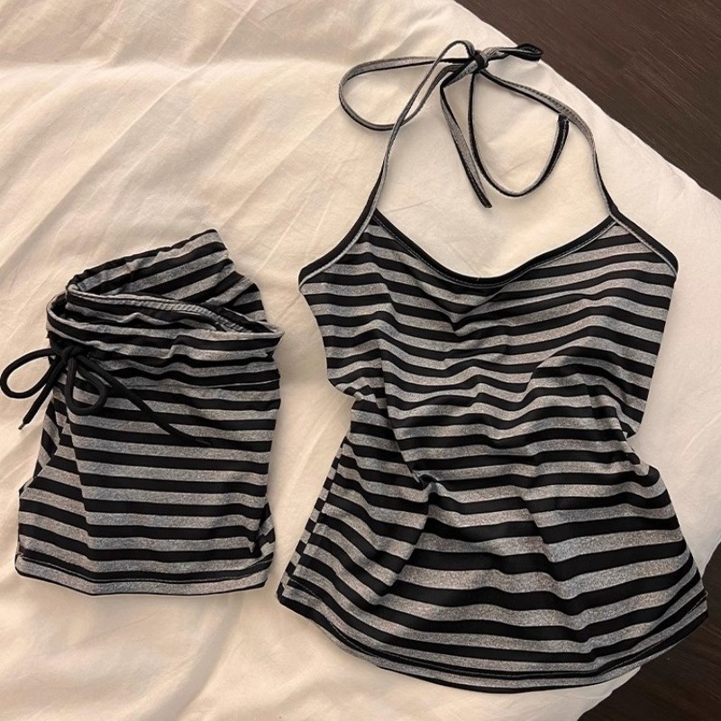 얇은 여름 여성 잠옷 스트라이프 홀터넥 서스펜더 반바지 가슴 패드가있는 세트 달콤한 스트랩 조끼 홈웨어스토어 가기