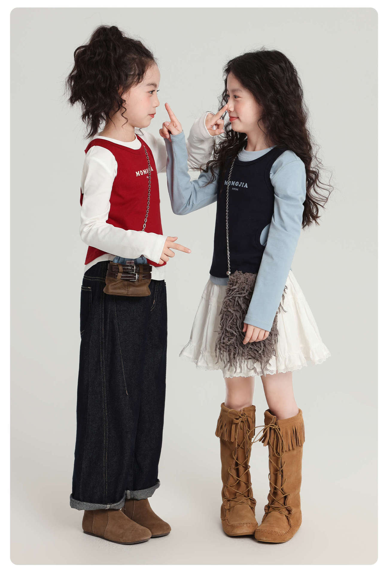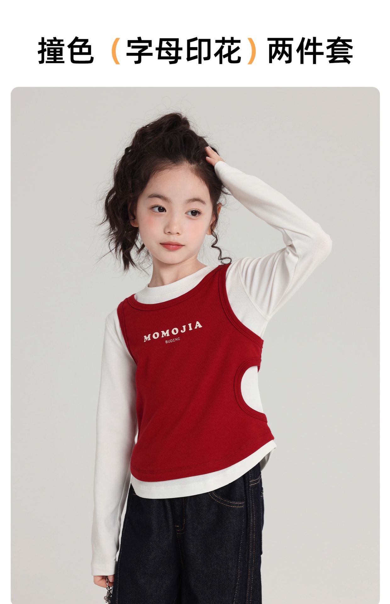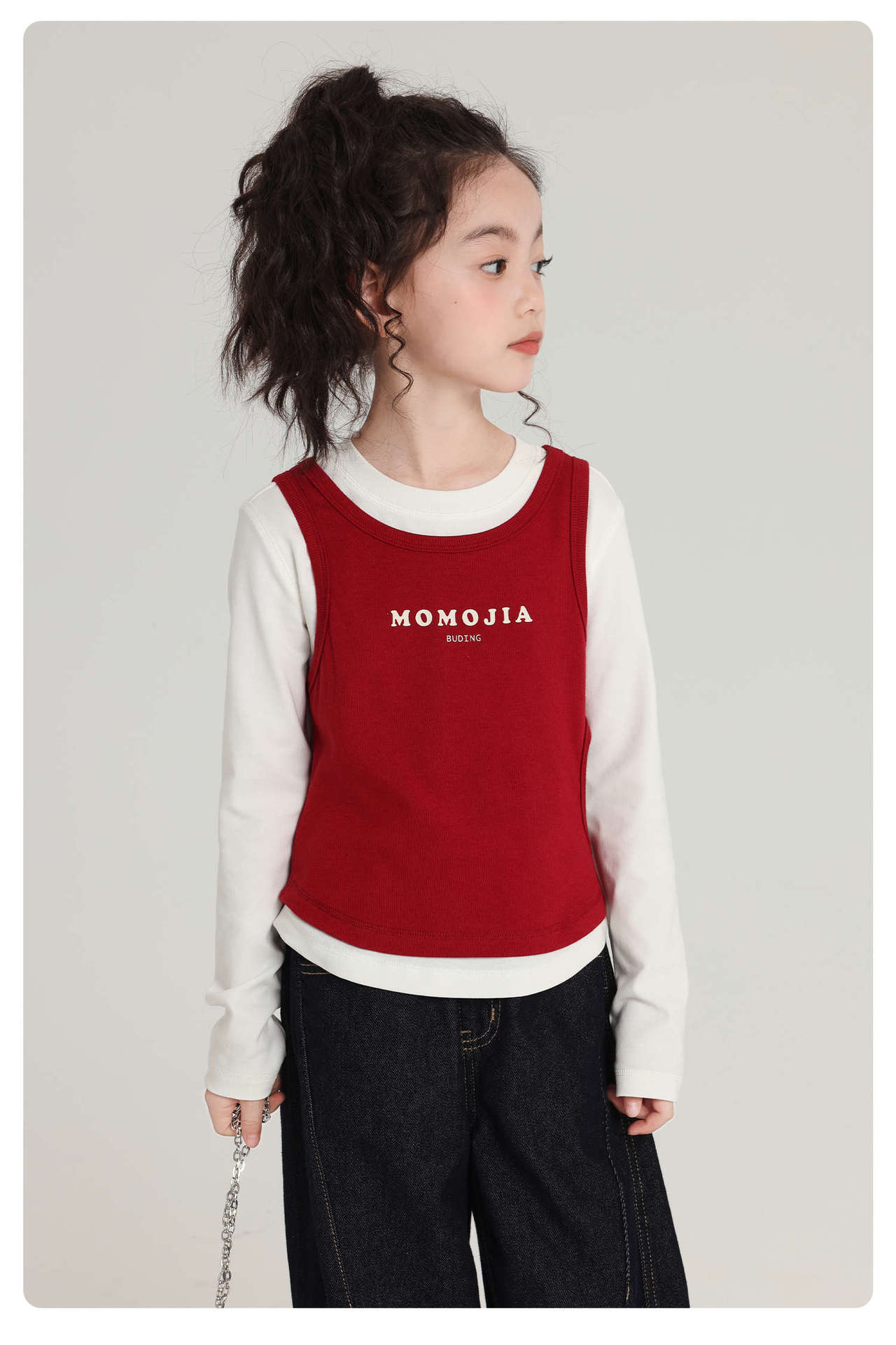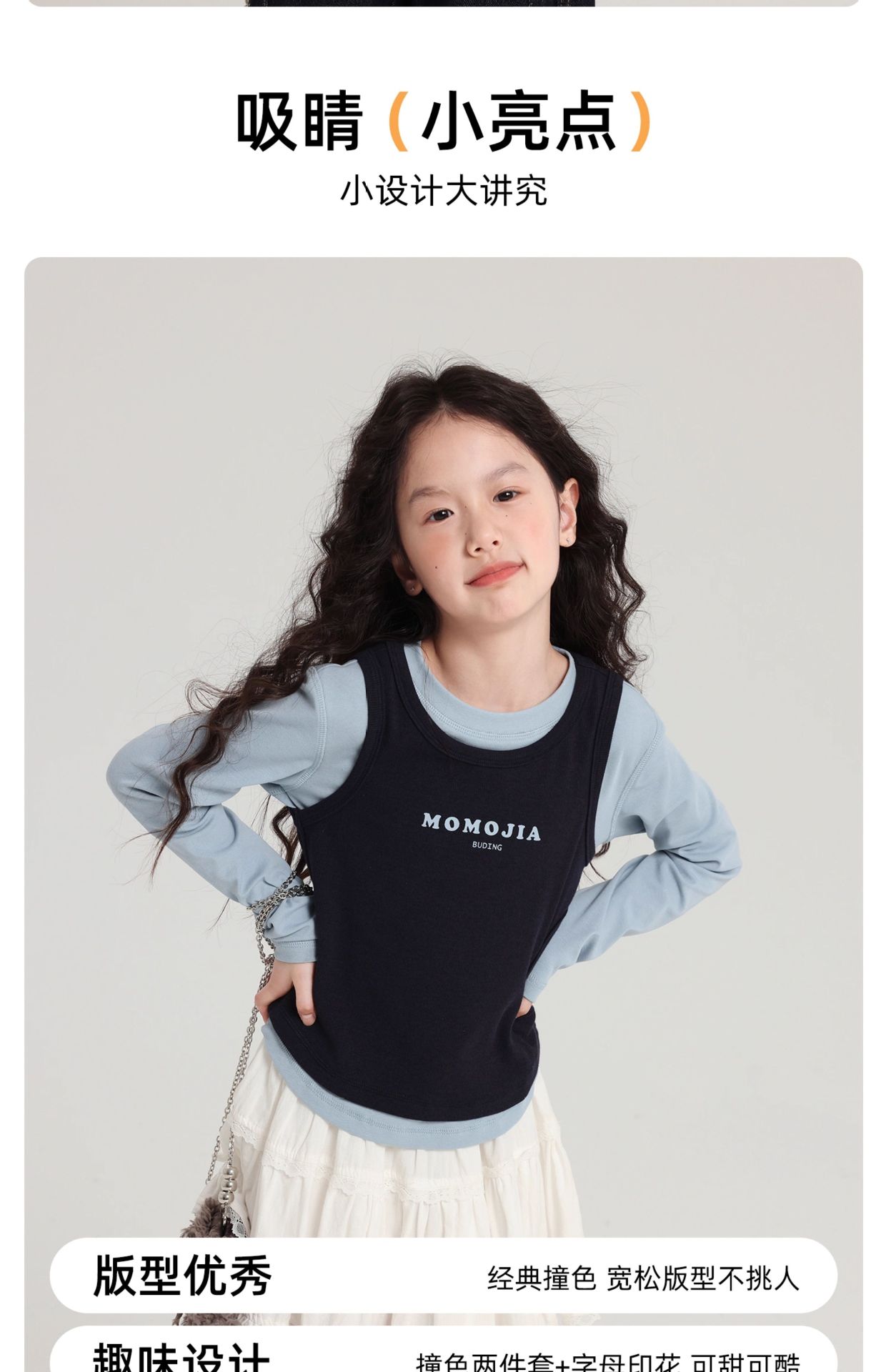 Pudding Haru Girls 라운드 넥 탑 2025 가을 새로운 대비 색상 가짜 투피스 어린이 한국 스타일 긴팔 티셔츠스토어 가기