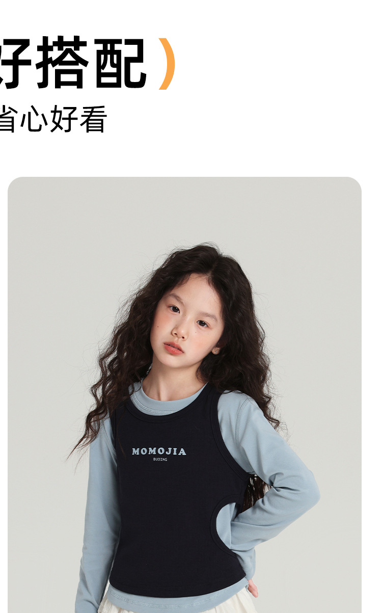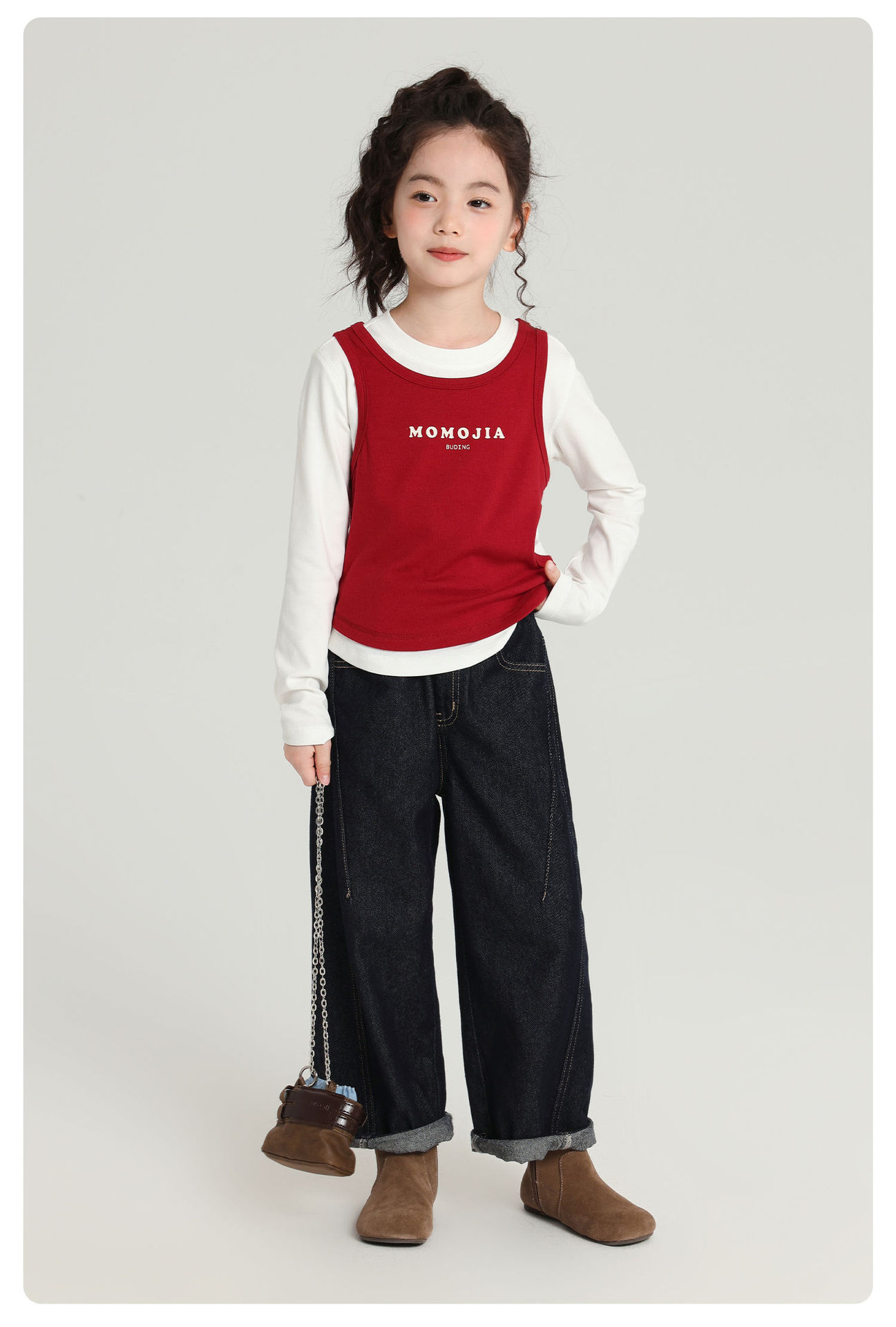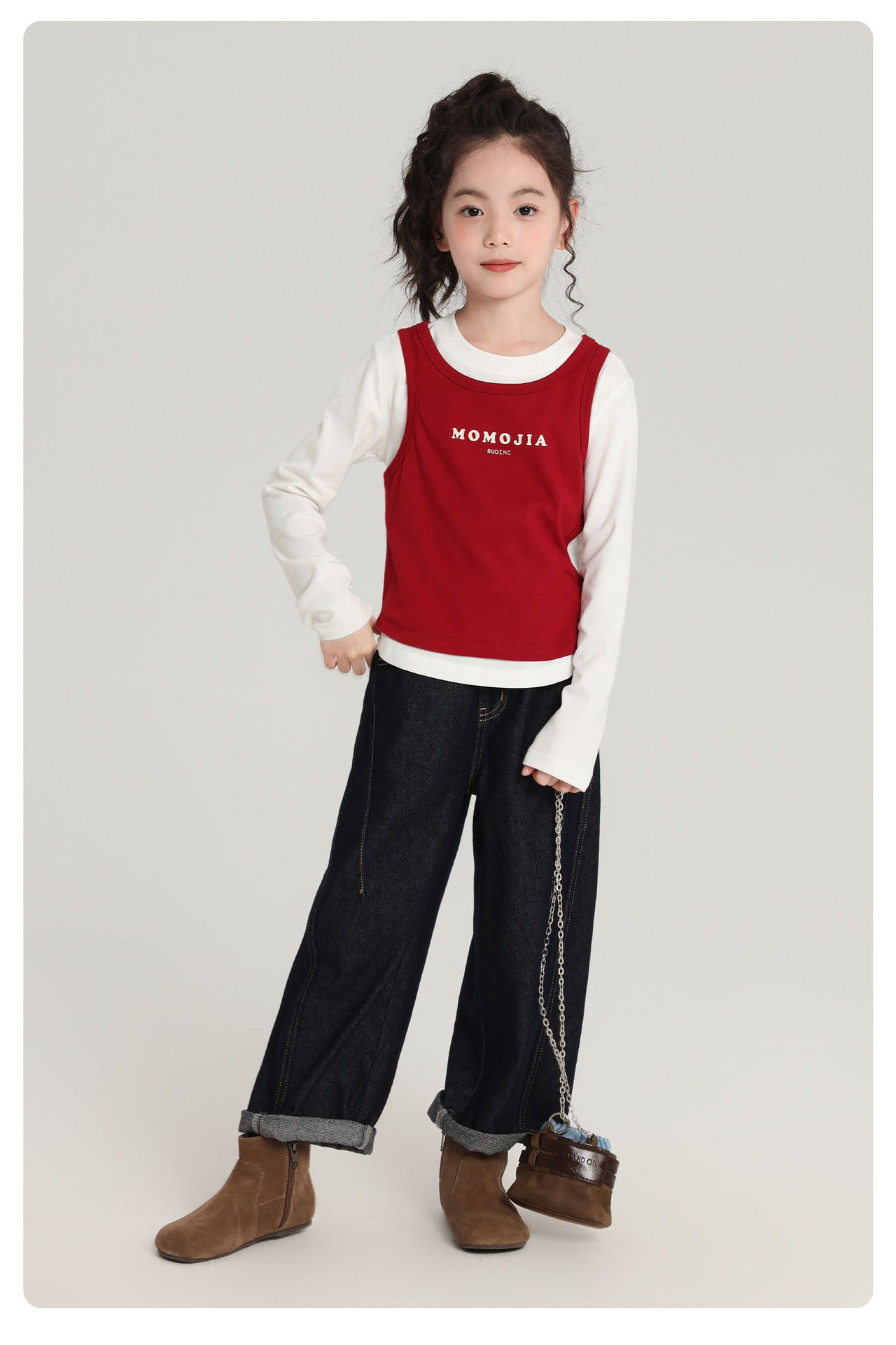 Pudding Haru Girls 라운드 넥 탑 2025 가을 새로운 대비 색상 가짜 투피스 어린이 한국 스타일 긴팔 티셔츠스토어 가기
