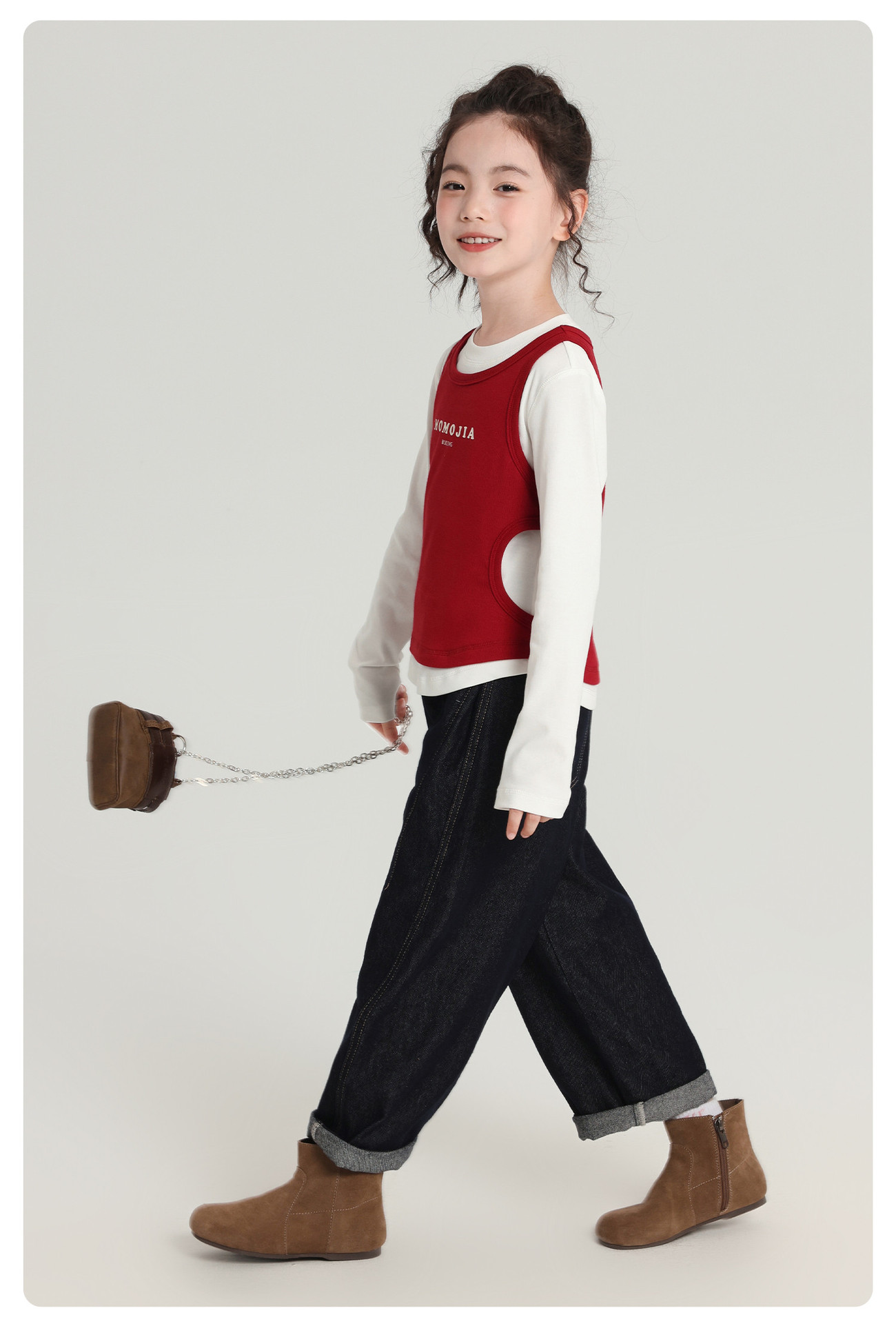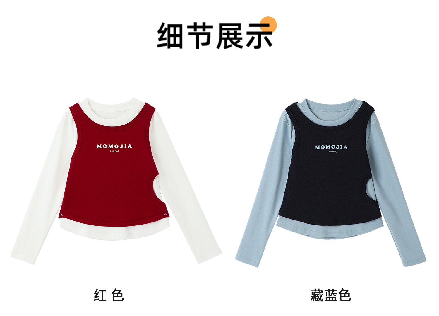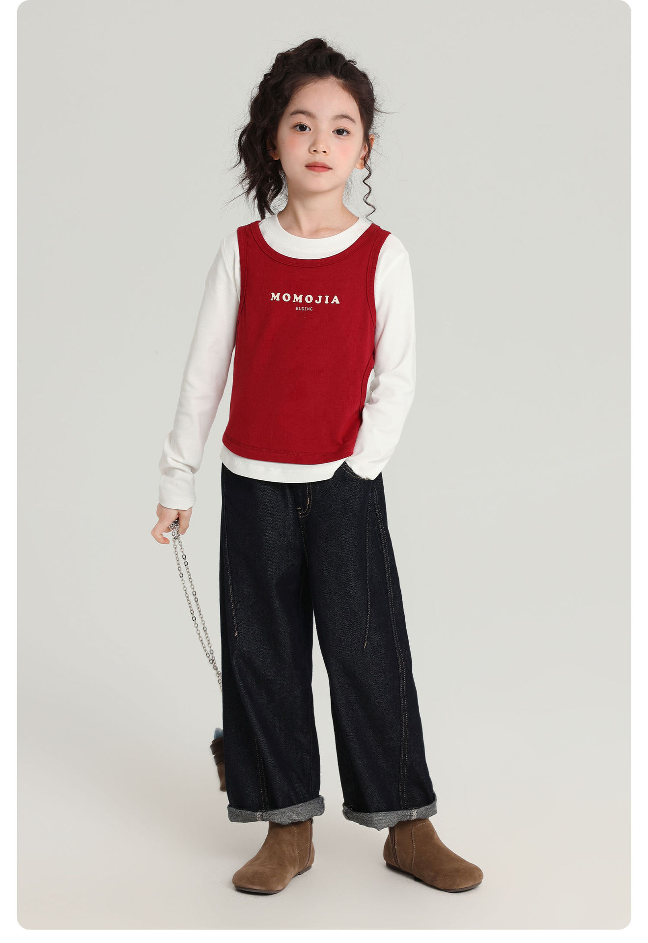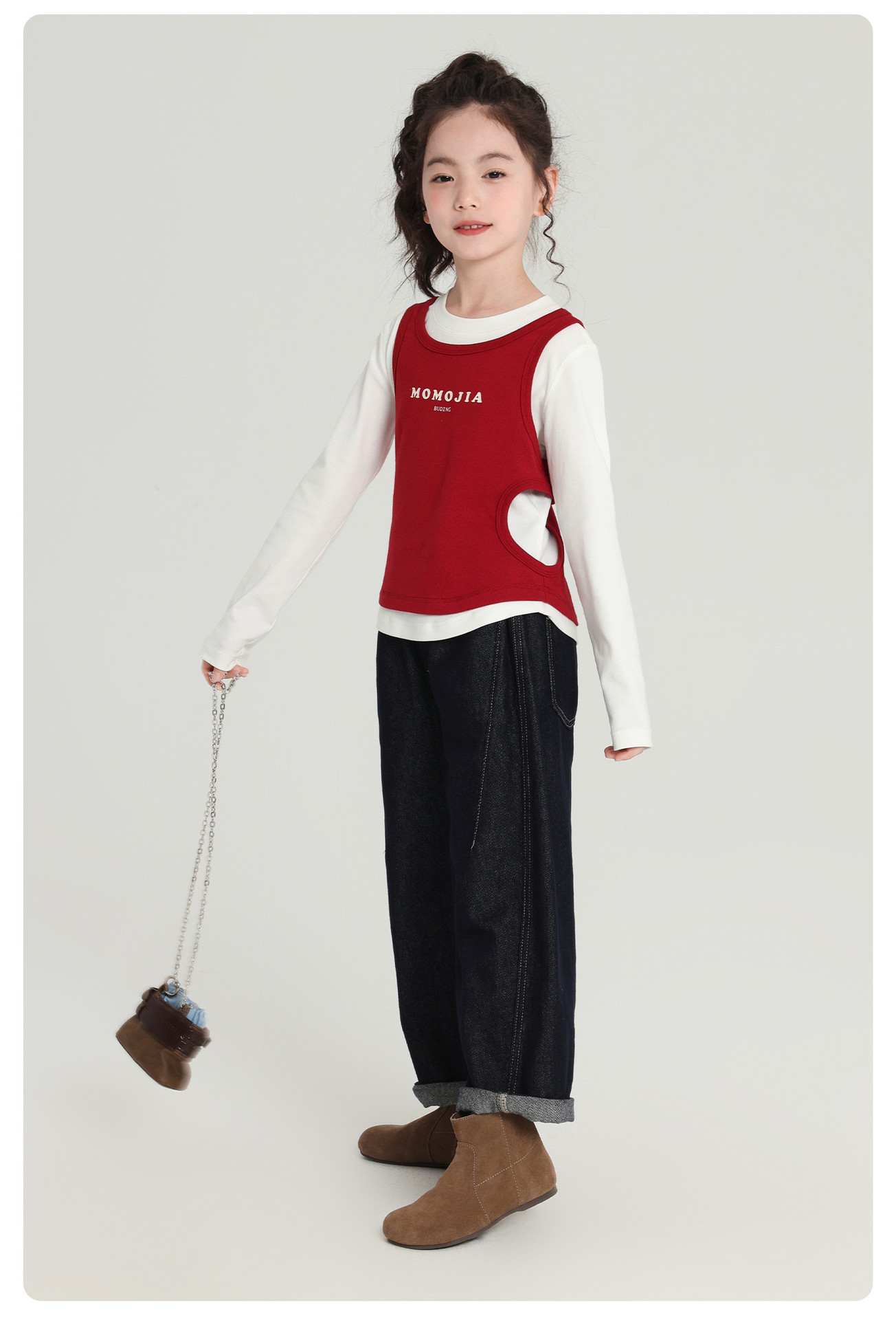 Pudding Haru Girls 라운드 넥 탑 2025 가을 새로운 대비 색상 가짜 투피스 어린이 한국 스타일 긴팔 티셔츠스토어 가기