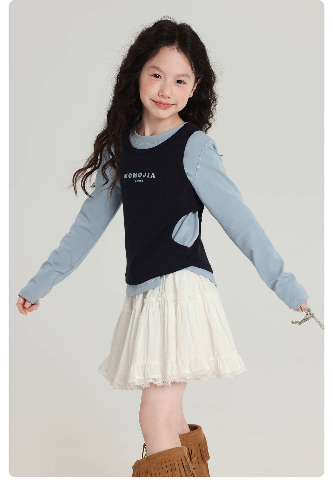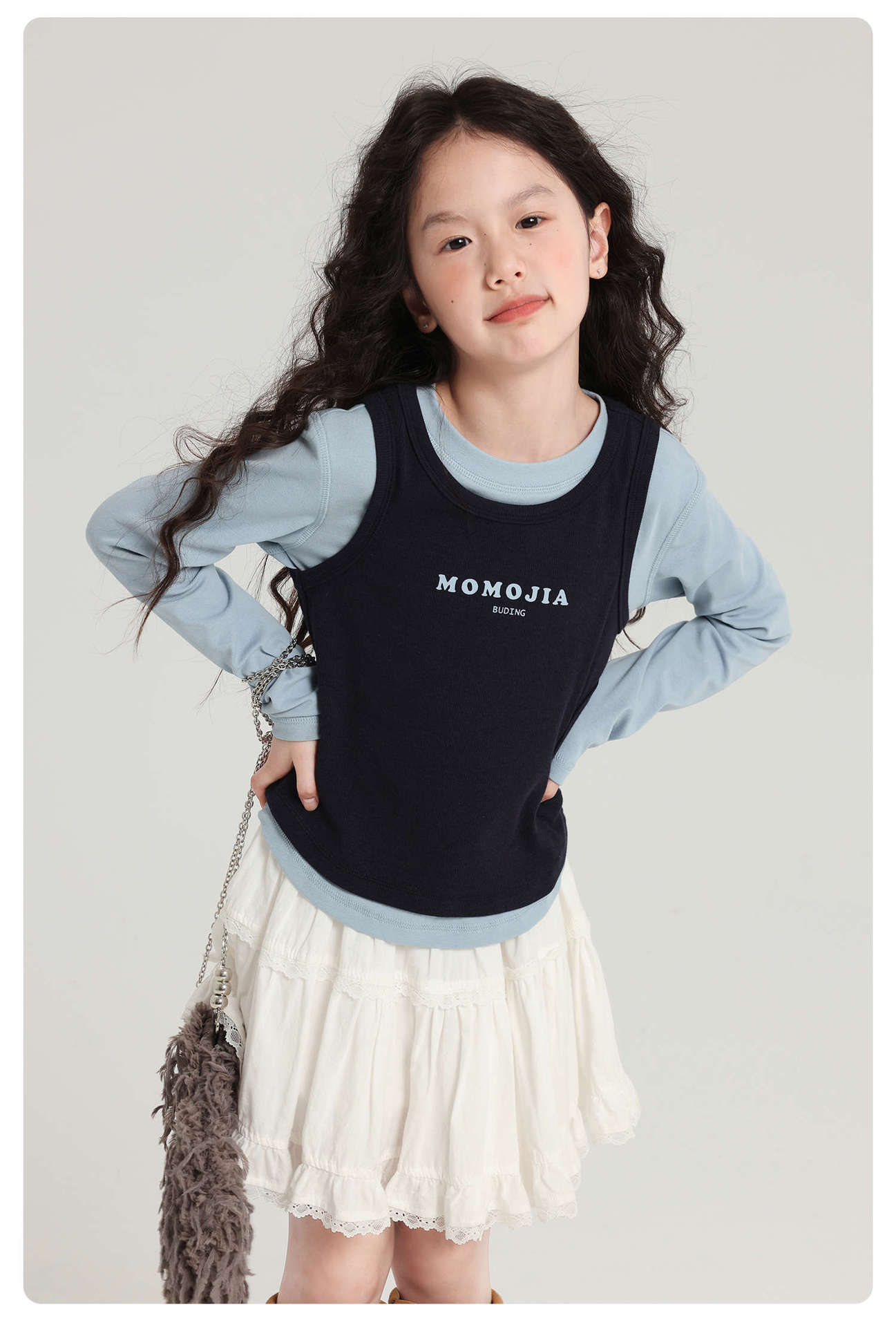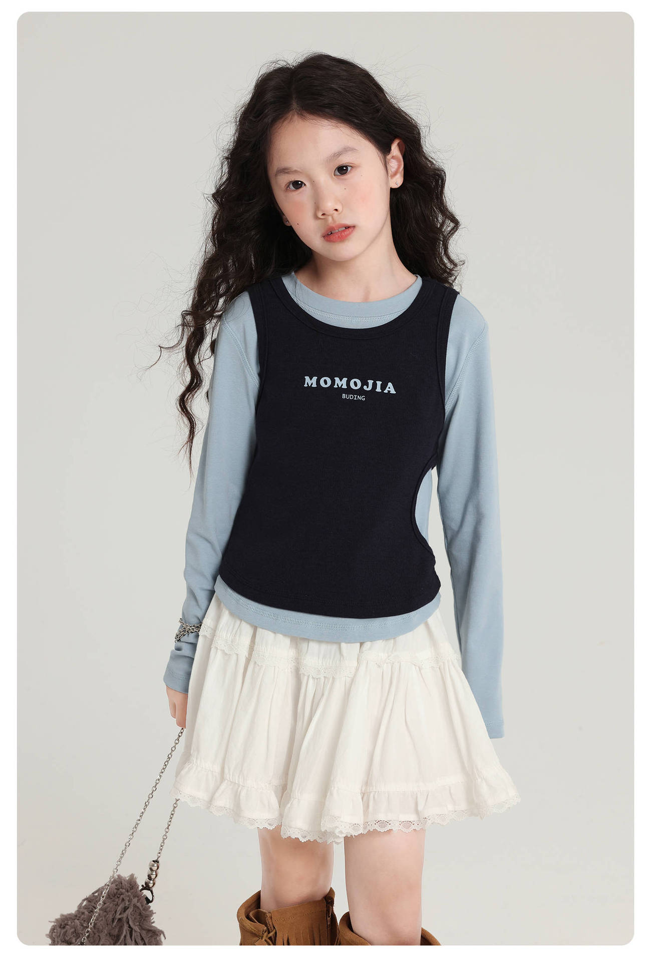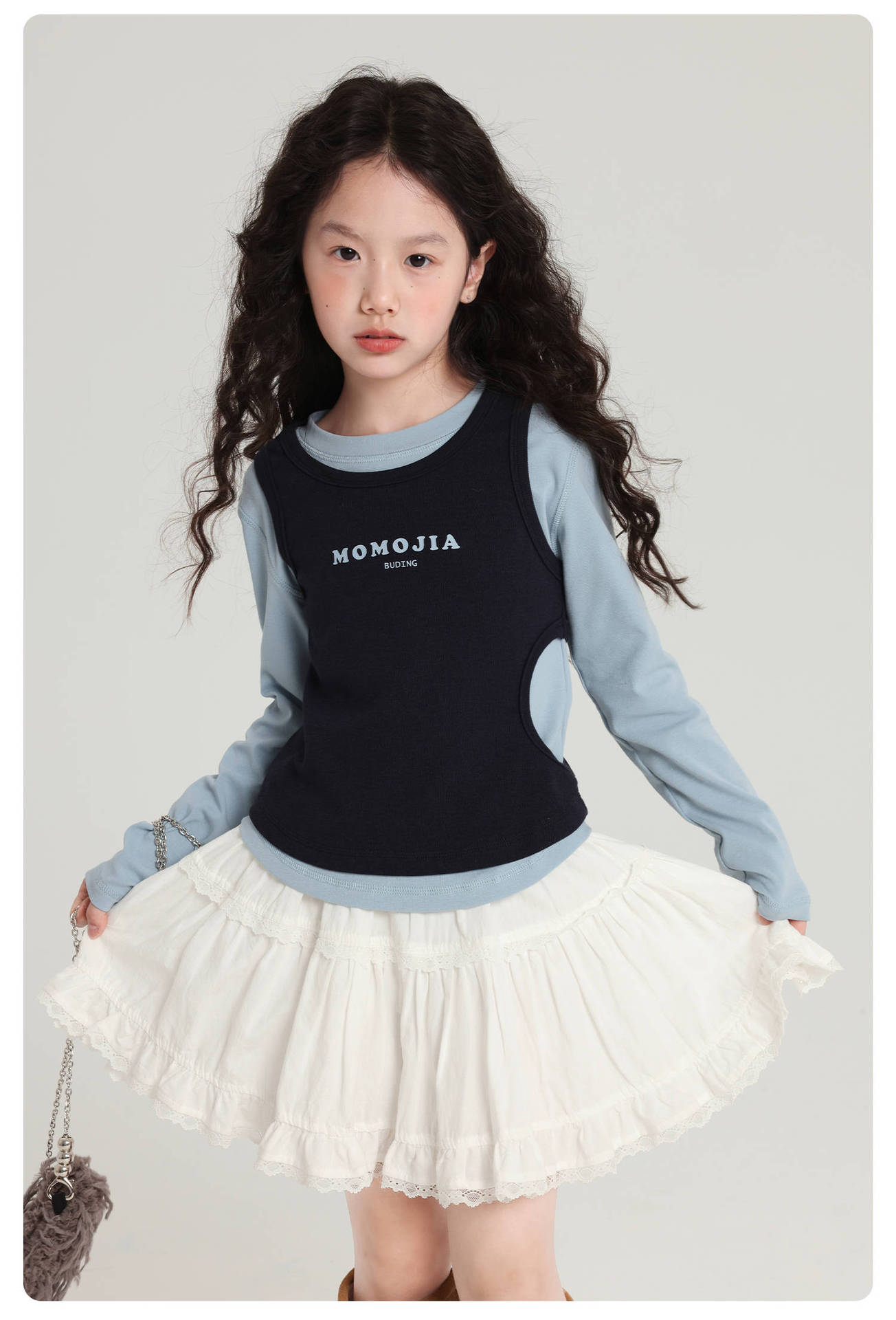 Pudding Haru Girls 라운드 넥 탑 2025 가을 새로운 대비 색상 가짜 투피스 어린이 한국 스타일 긴팔 티셔츠