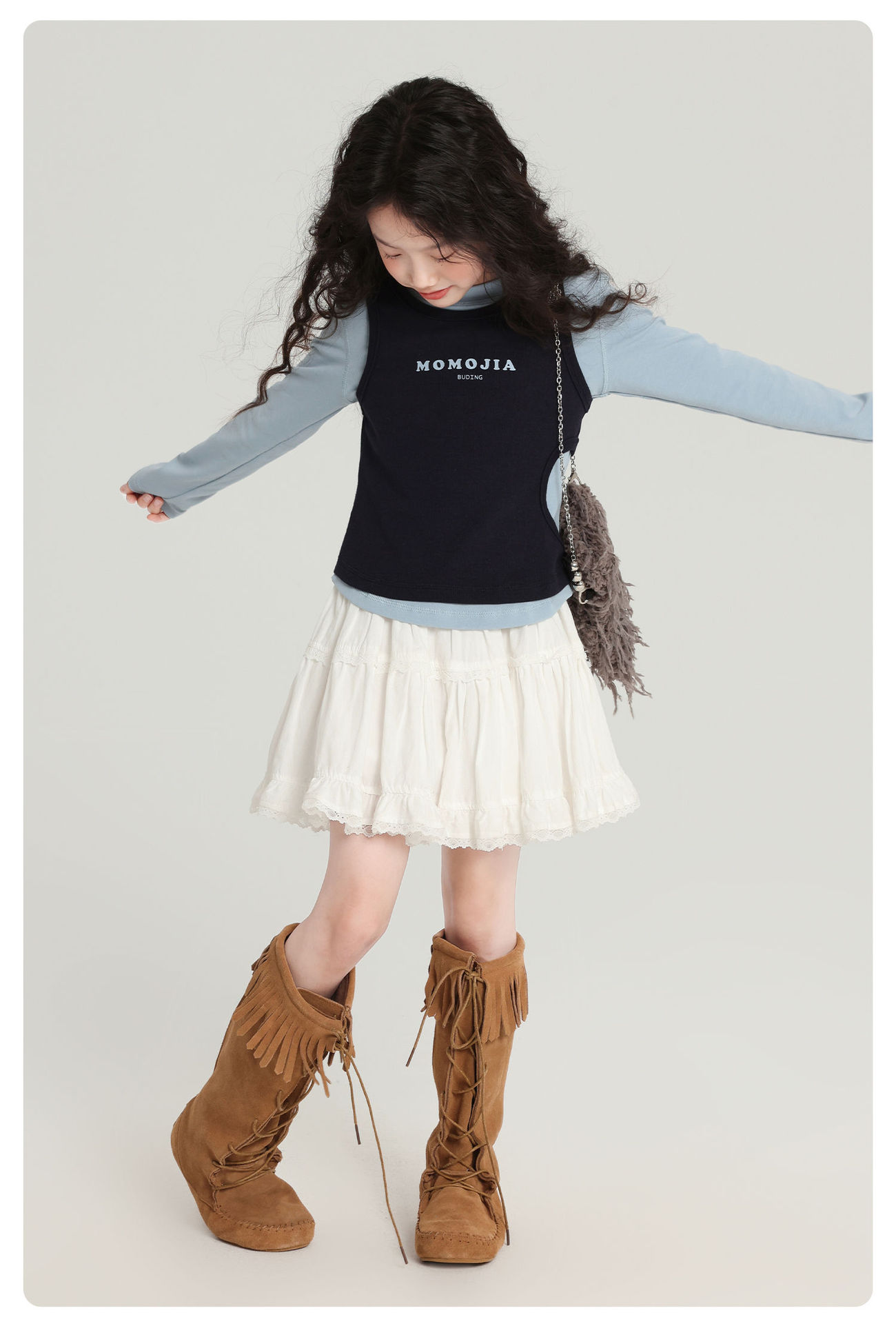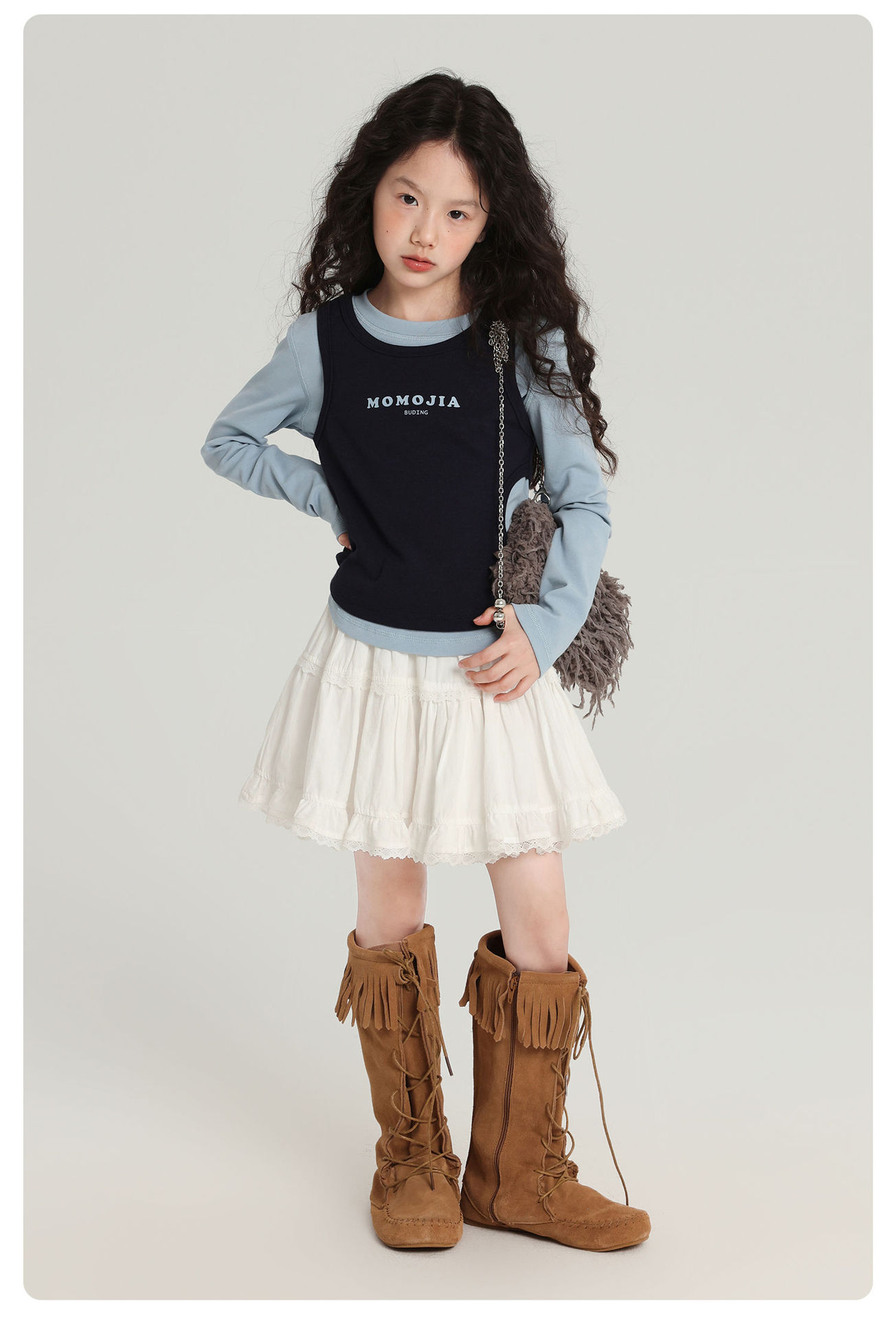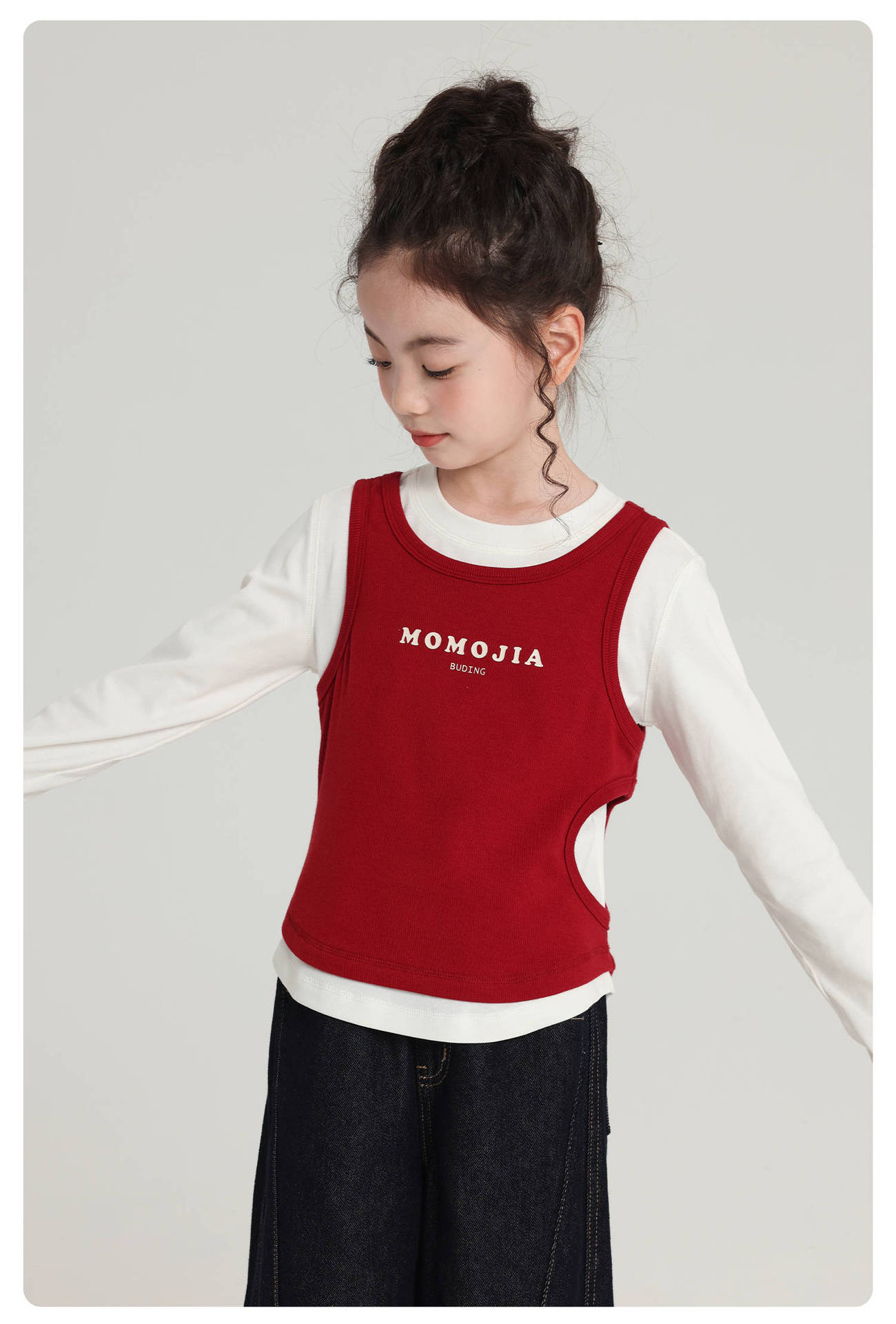 Pudding Haru Girls 라운드 넥 탑 2025 가을 새로운 대비 색상 가짜 투피스 어린이 한국 스타일 긴팔 티셔츠
