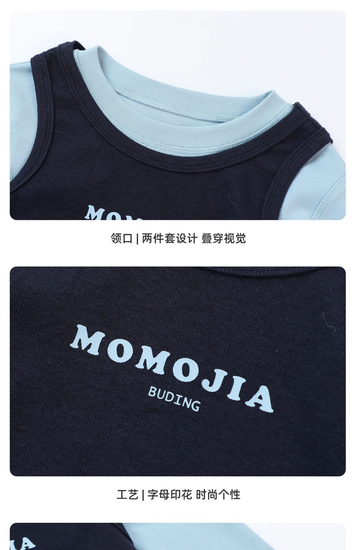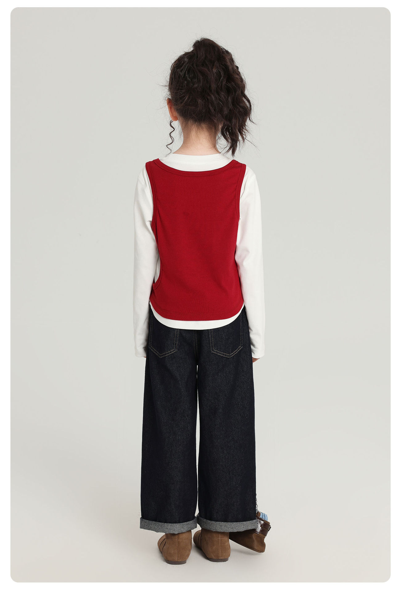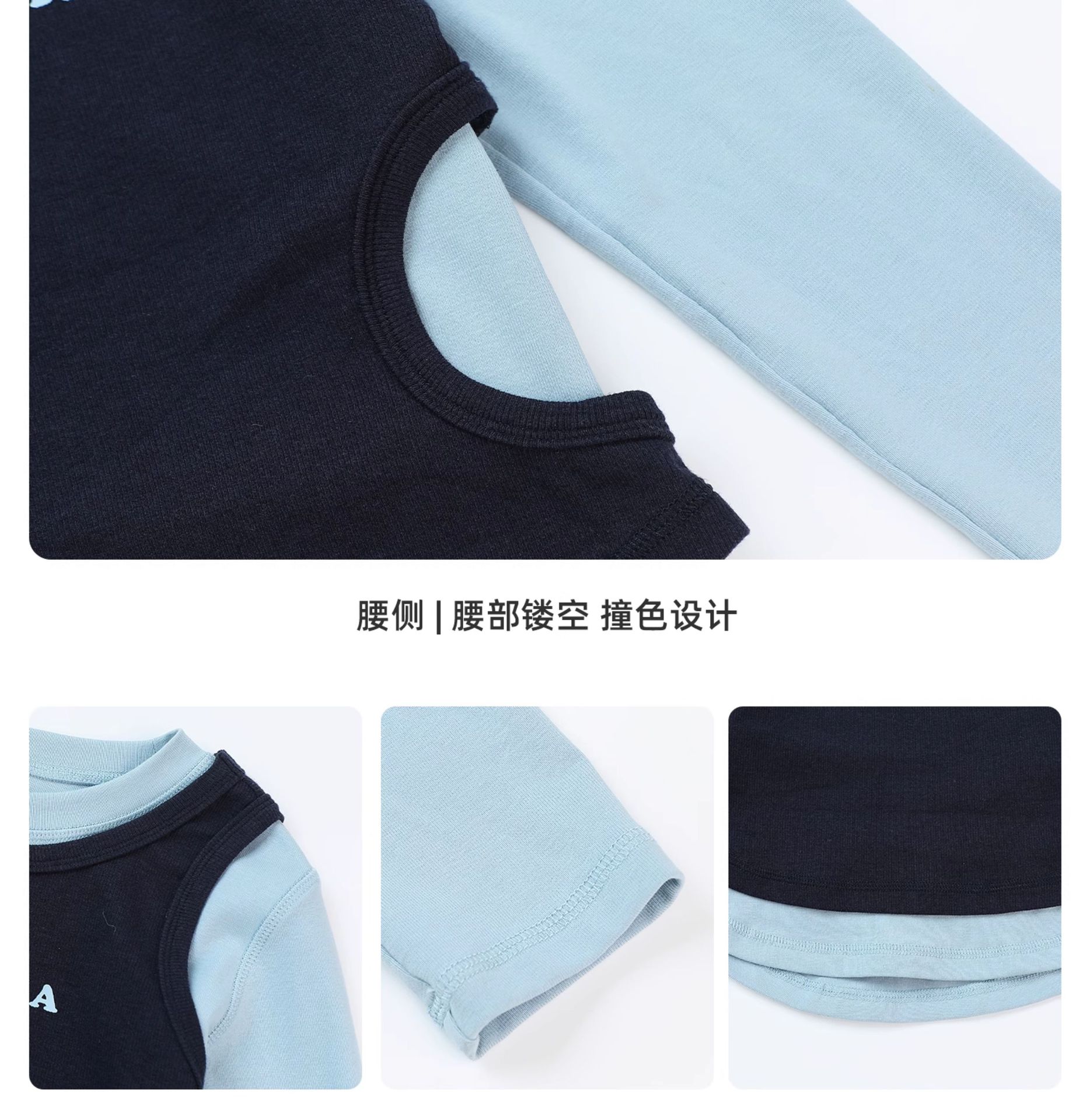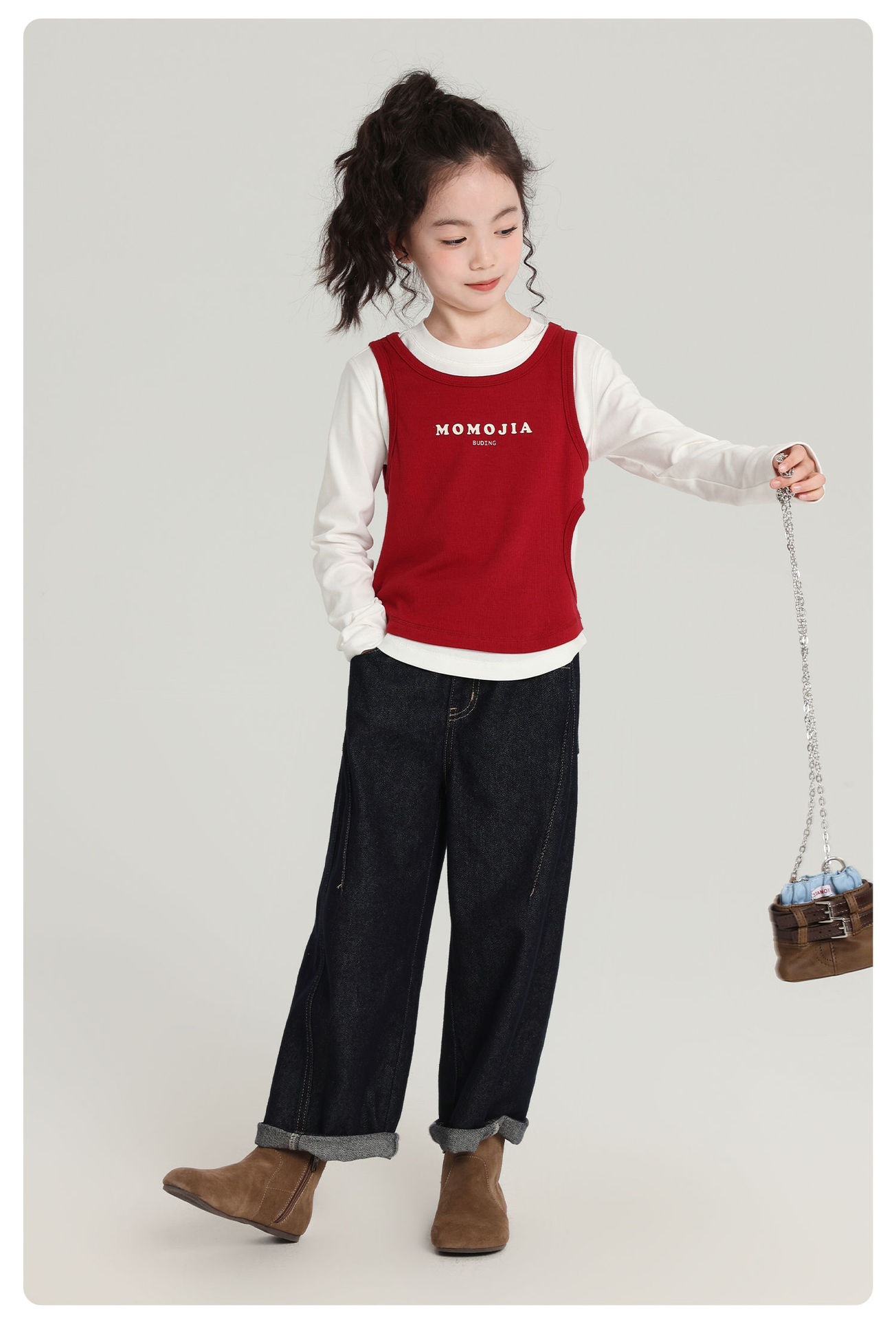 Pudding Haru Girls 라운드 넥 탑 2025 가을 새로운 대비 색상 가짜 투피스 어린이 한국 스타일 긴팔 티셔츠