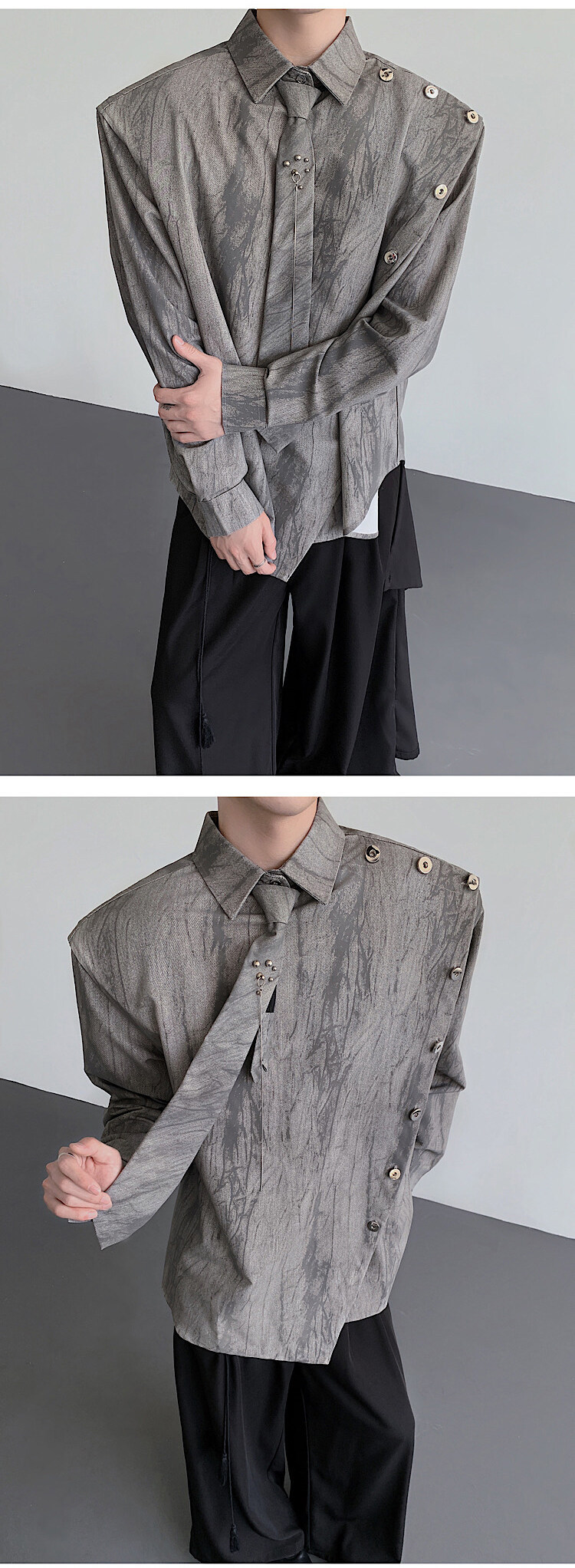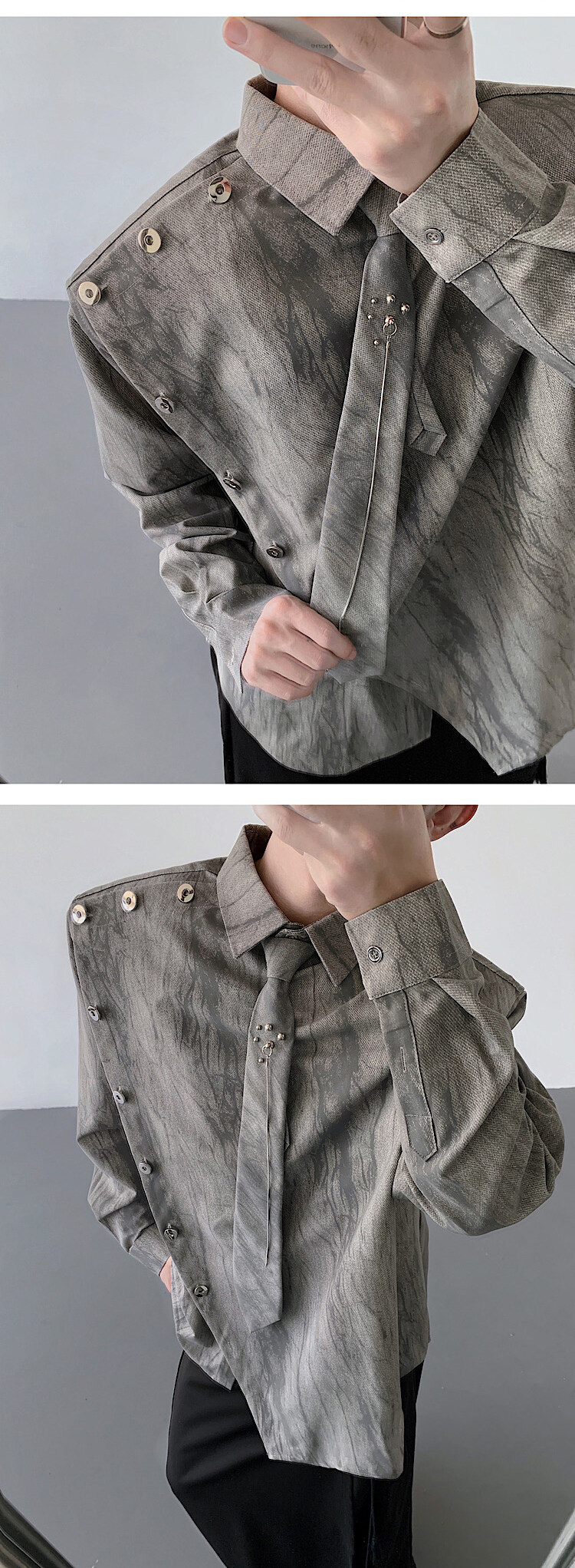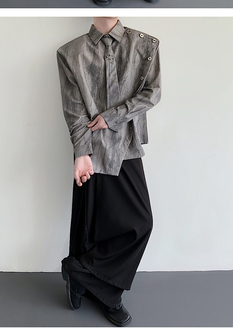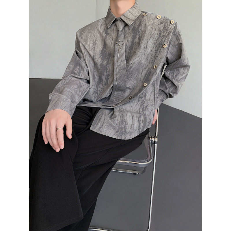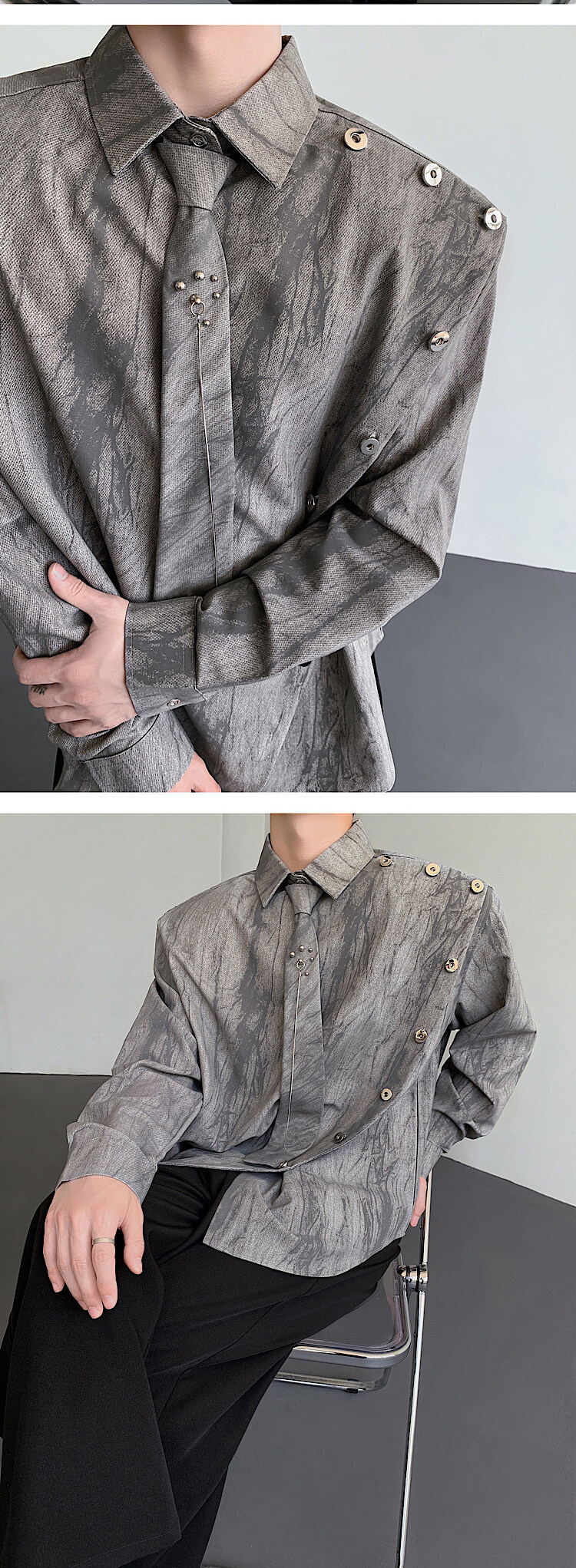 Sven Yipu 메탈 체인 타이 어깨 패드 셔츠 긴팔 남성 초가을 새로운 얼룩진 루즈 실루엣 탑