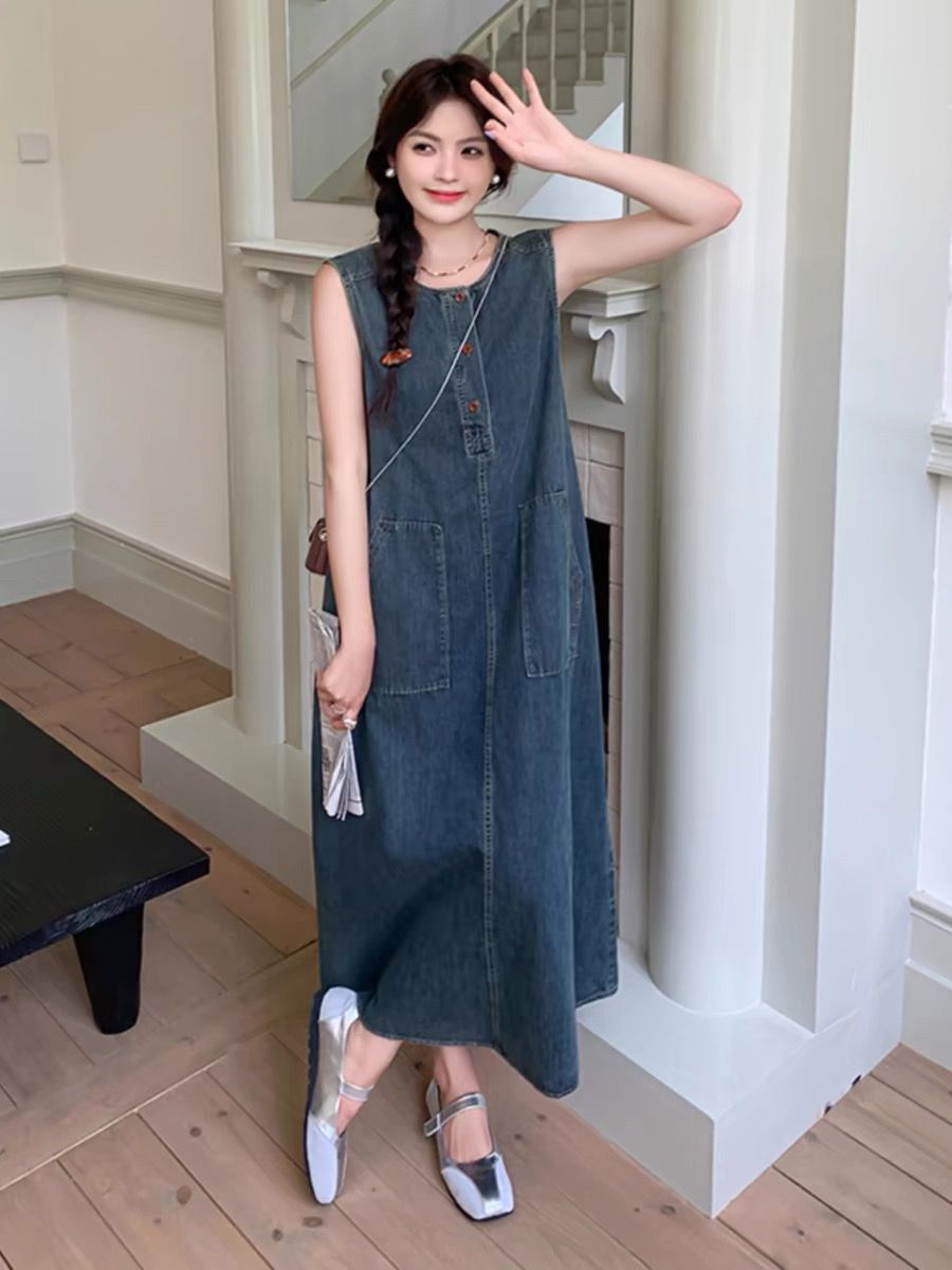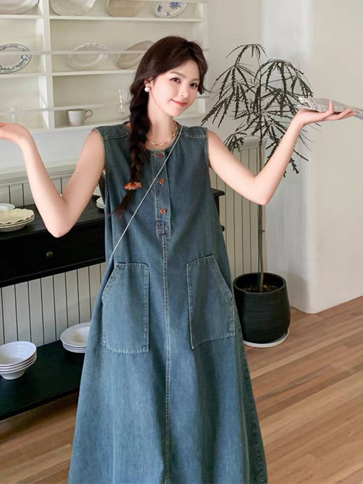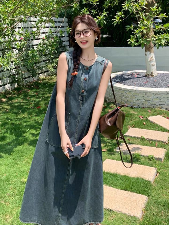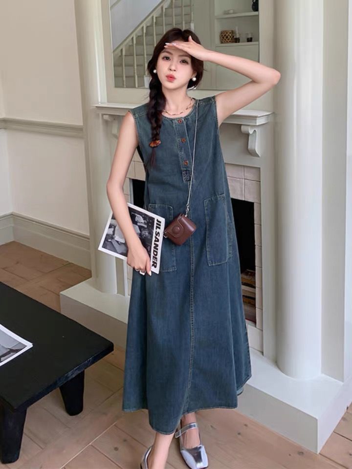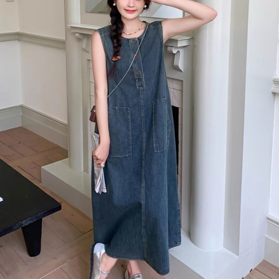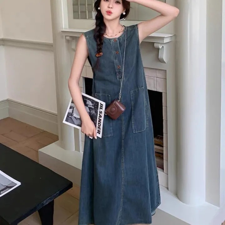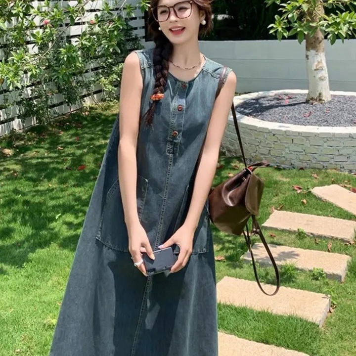 여름 데님 민소매 조끼 드레스, 여성스러운, 고급 여신 스타일, 고급 복고풍 캐주얼 롱 스커트스토어 가기