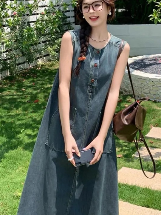 여름 데님 민소매 조끼 드레스, 여성스러운, 고급 여신 스타일, 고급 복고풍 캐주얼 롱 스커트